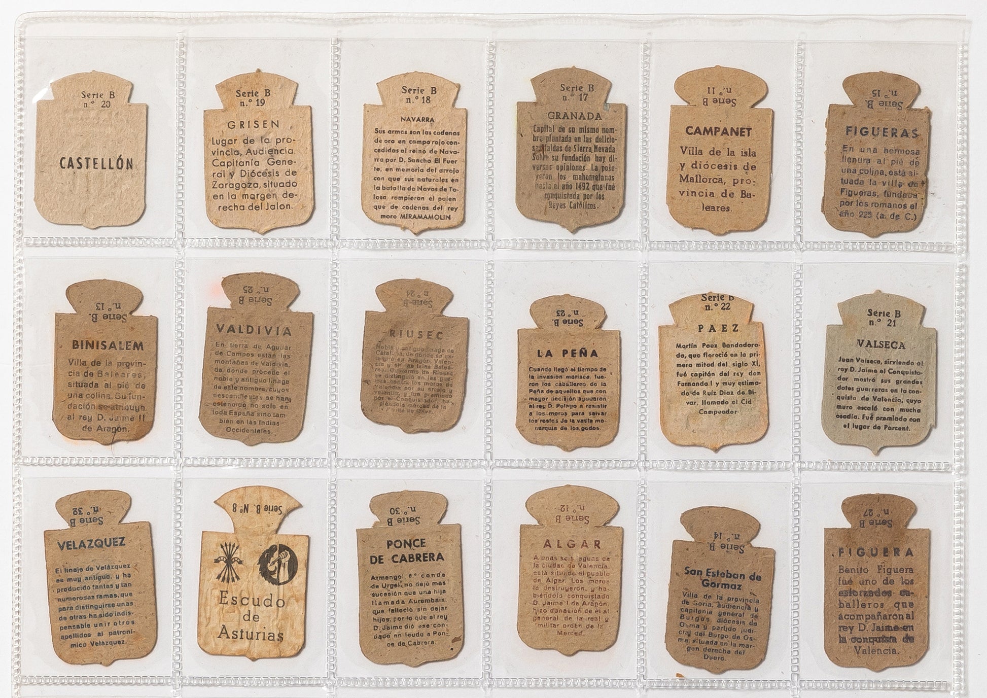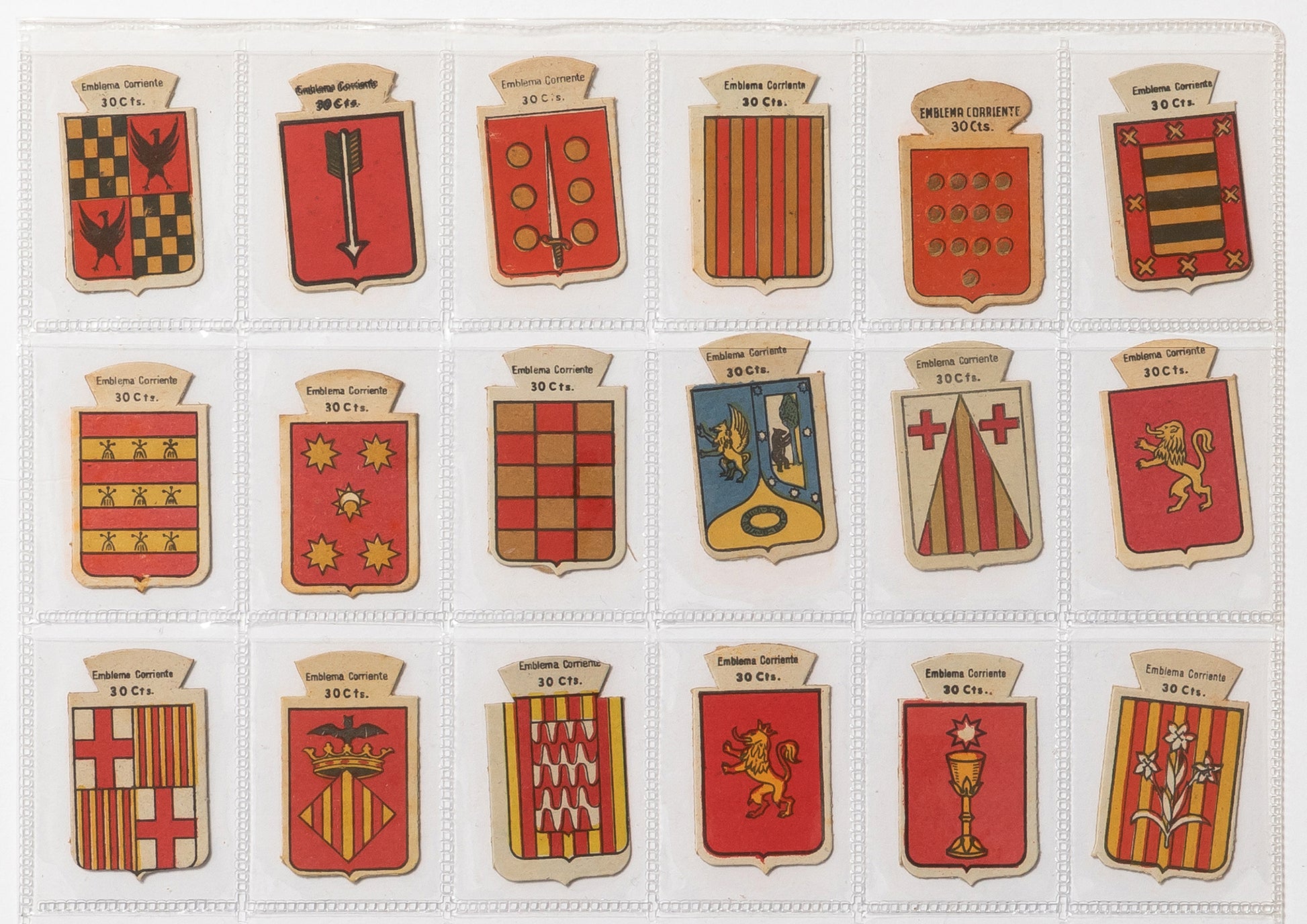 These coat of arms-shaped prints were distributed in exchange for donations to AUXILIO SOCIAL, a humanitarian relief organization founded in 1936 in Spain under the Franco dictatorship. Apparently they were sometimes required to be presented when using public facilities or certain performances. Many of the coats of arms are Spanish in origin, and a short explanatory text is printed on the back. The motifs of the coats of arms are diverse, ranging from symbolic ones such as knights, swords, castles, sake cups, and the sun, to more unusual ones such as jester's shoes and pears. It is said that they were originally made of metal, and the embossed cardboard appearance may be a remnant of that time when they were made of metal.