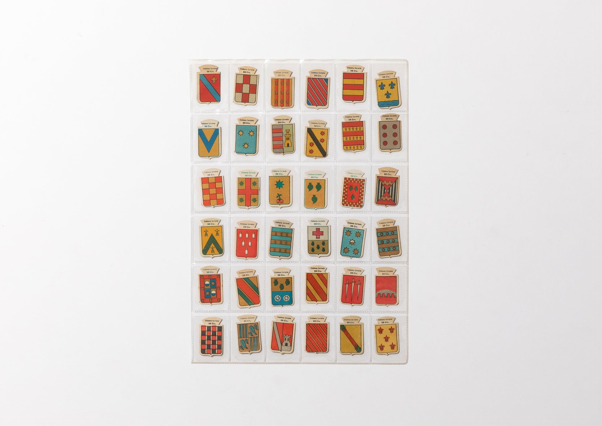 These coat of arms-shaped prints were distributed in exchange for donations to AUXILIO SOCIAL, a humanitarian relief organization founded in 1936 in Spain under the Franco dictatorship. Apparently they were sometimes required to be presented when using public facilities or certain performances. Many of the coats of arms are Spanish in origin, and a short explanatory text is printed on the back. The motifs of the coats of arms are diverse, ranging from symbolic ones such as knights, swords, castles, sake cups, and the sun, to more unusual ones such as jester's shoes and pears. It is said that they were originally made of metal, and the embossed cardboard appearance may be a remnant of that time when they were made of metal.