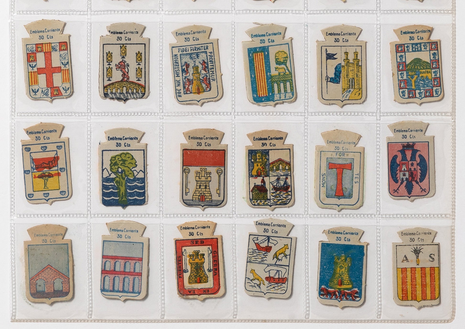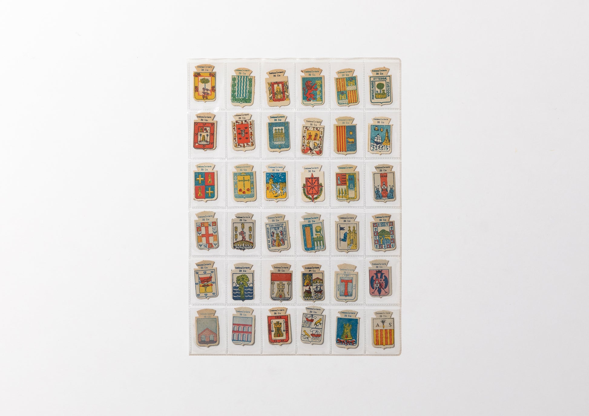 These coat of arms-shaped prints were distributed in exchange for donations to AUXILIO SOCIAL, a humanitarian relief organization founded in 1936 in Spain under the Franco dictatorship. Apparently they were sometimes required to be presented when using public facilities or certain performances. Many of the coats of arms are Spanish in origin, and a short explanatory text is printed on the back. The motifs of the coats of arms are diverse, ranging from symbolic ones such as knights, swords, castles, sake cups, and the sun, to more unusual ones such as jester's shoes and pears. It is said that they were originally made of metal, and the embossed cardboard appearance may be a remnant of that time when they were made of metal.