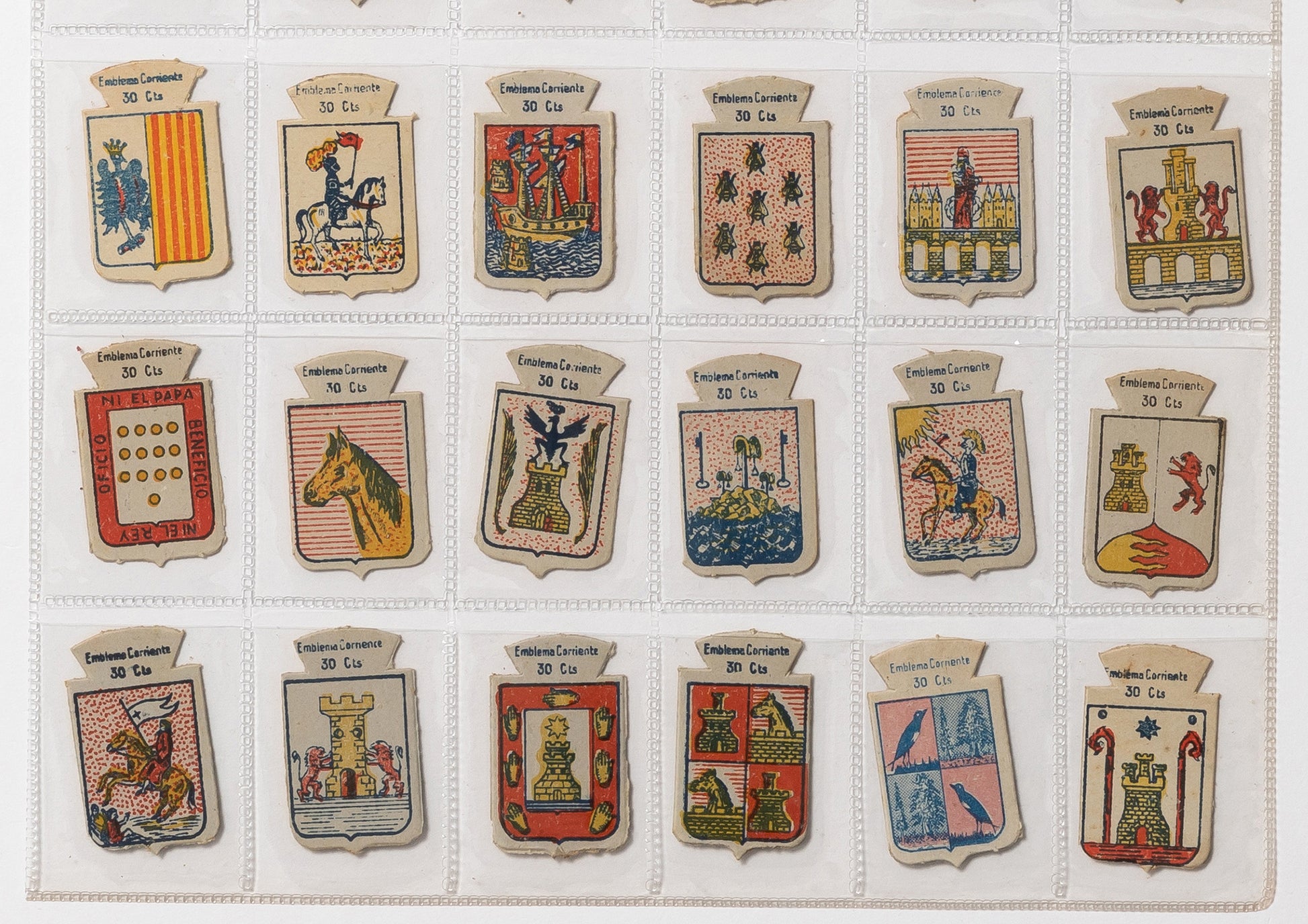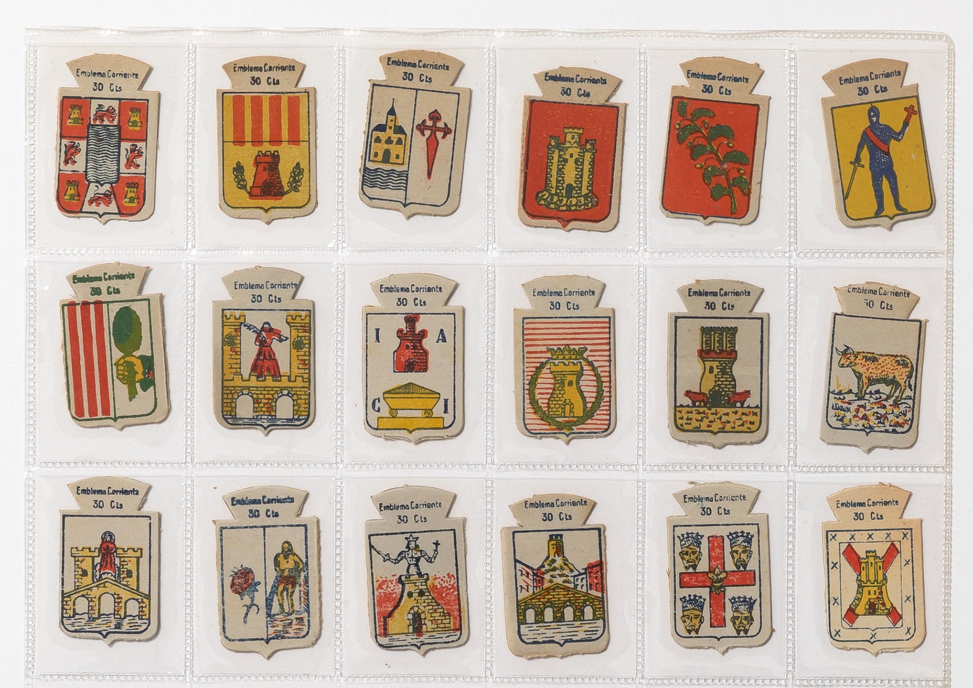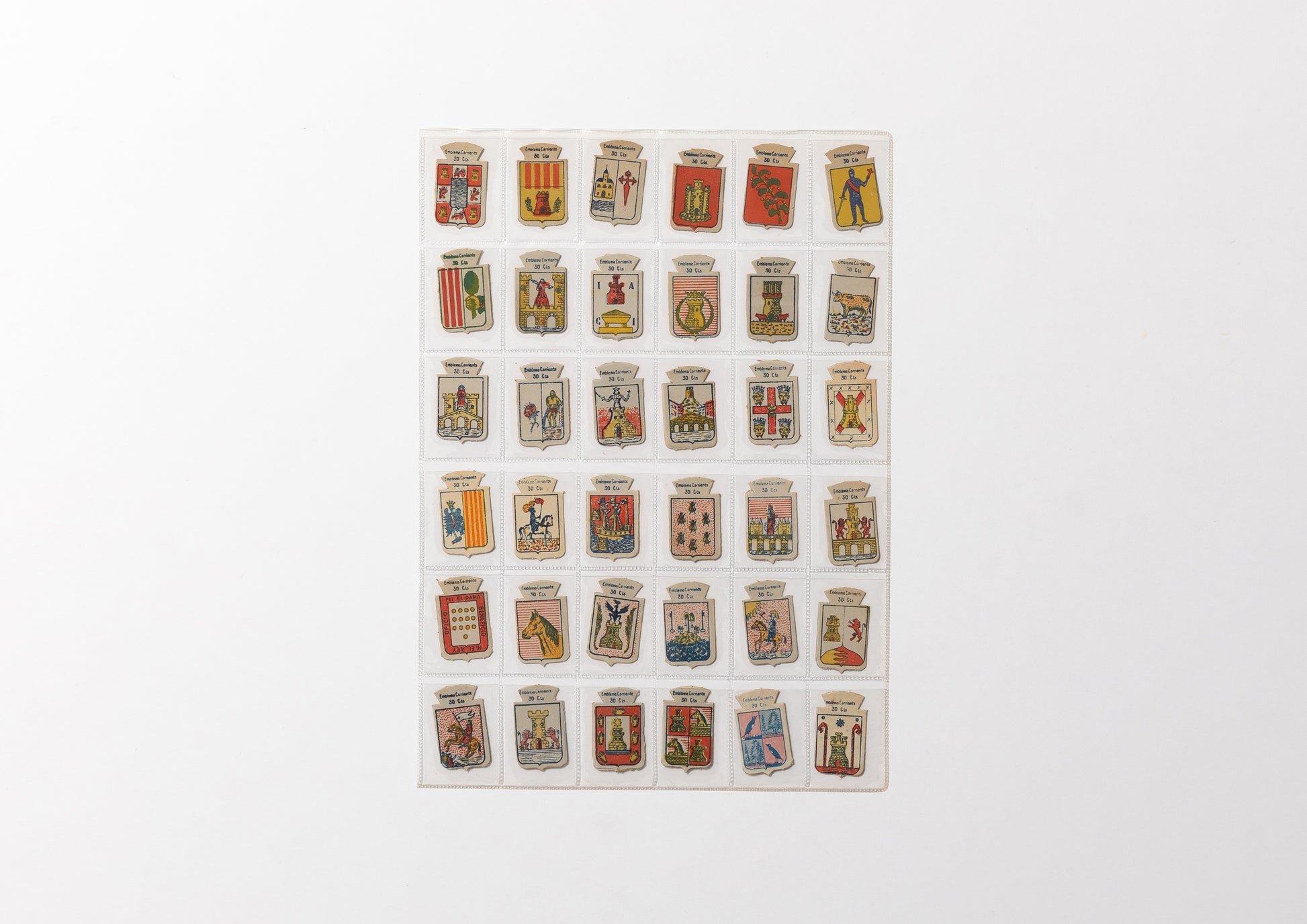 These coat of arms-shaped prints were distributed in exchange for donations to AUXILIO SOCIAL, a humanitarian relief organization founded in 1936 in Spain under the Franco dictatorship. Apparently they were sometimes required to be presented when using public facilities or certain performances. Many of the coats of arms are Spanish in origin, and a short explanatory text is printed on the back. The motifs of the coats of arms are diverse, ranging from symbolic ones such as knights, swords, castles, sake cups, and the sun, to more unusual ones such as jester's shoes and pears. It is said that they were originally made of metal, and the embossed cardboard appearance may be a remnant of that time when they were made of metal.