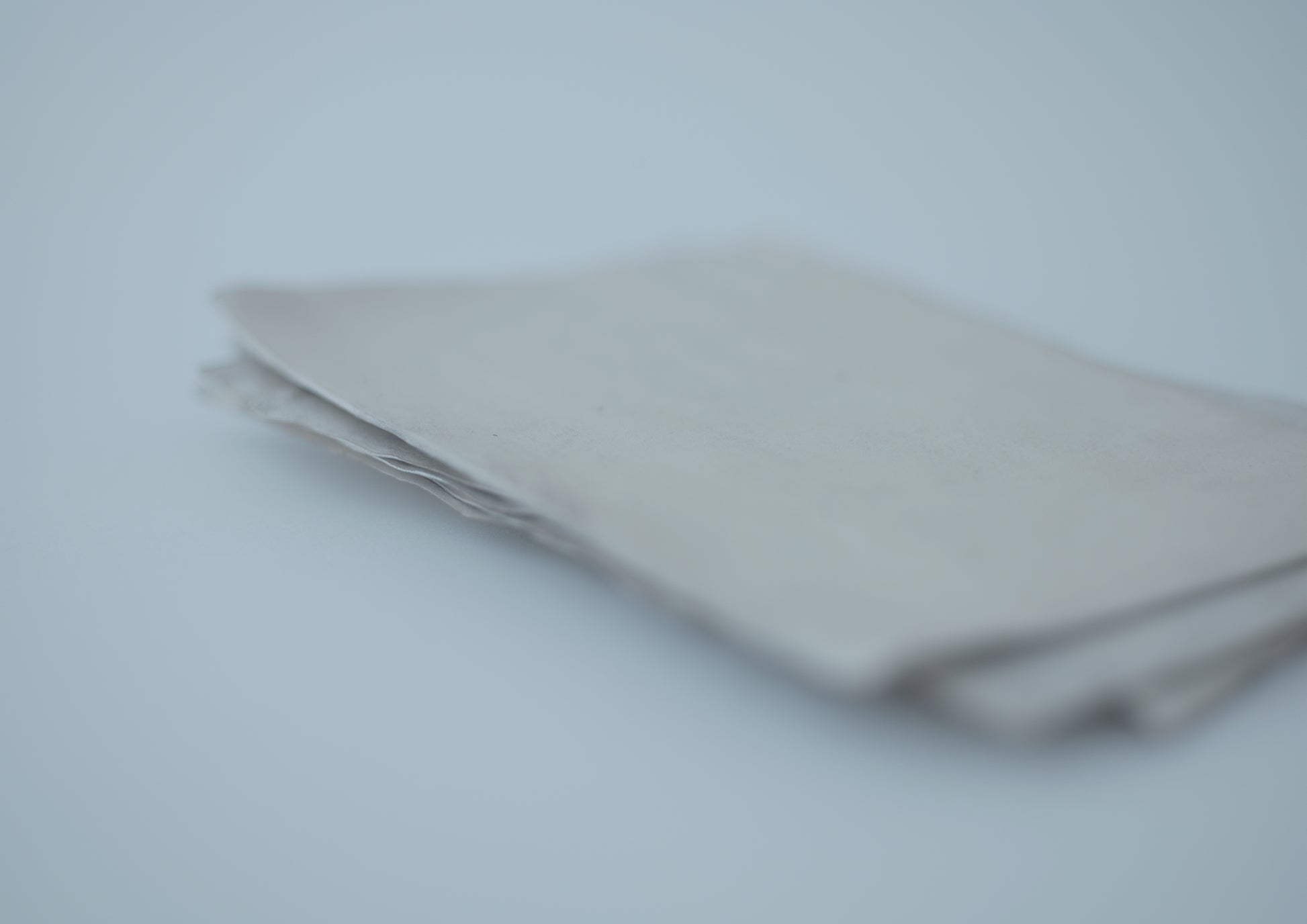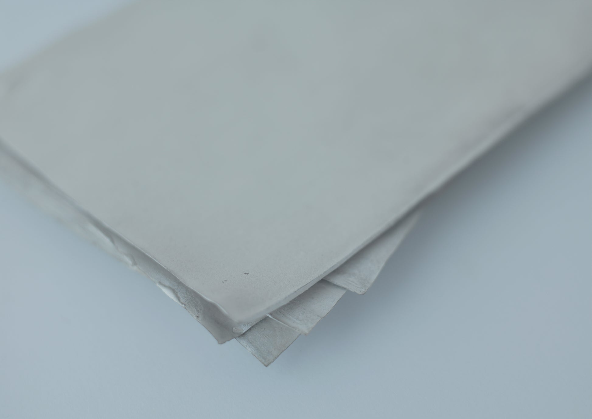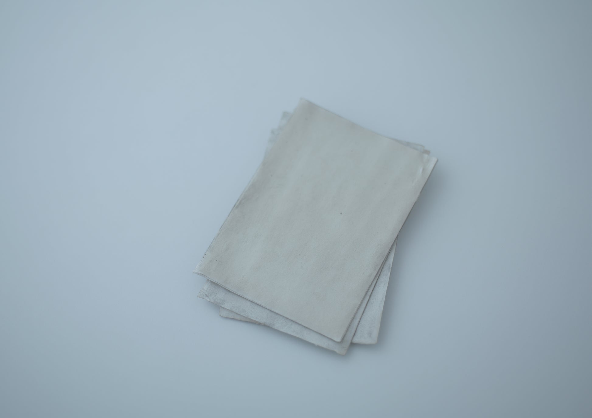 When the dried pieces of paper are unglazed, a thin piece of porcelain clay is formed that transcribes the expression of the washi, but at the same time the washi is burned away, leaving only its shadow. The instantaneous form of the paper and the way it changes its expression over time is like the layering of time that knows no bounds.