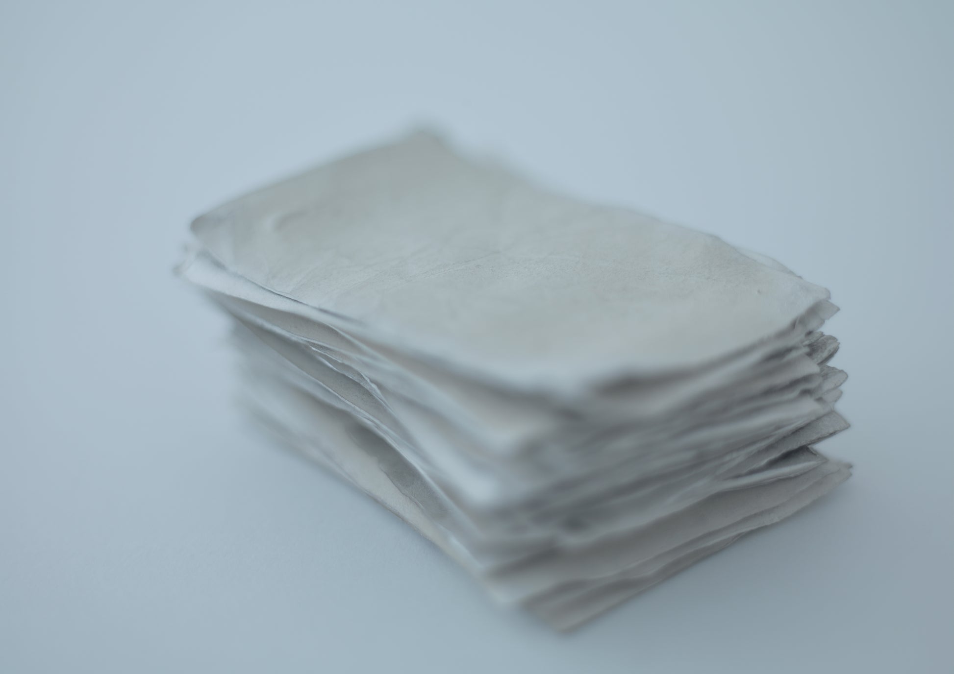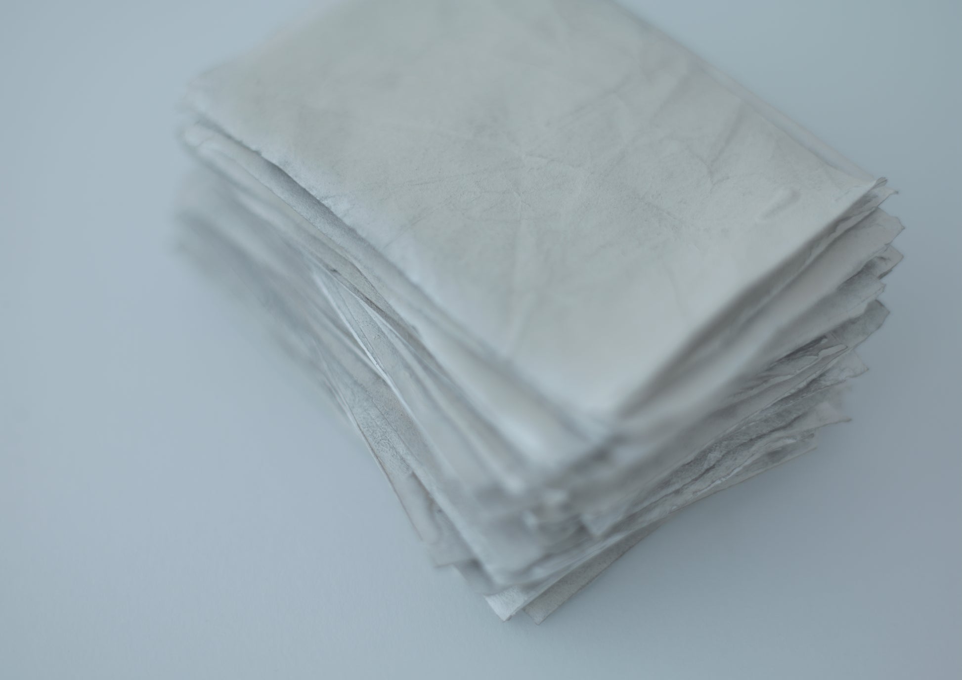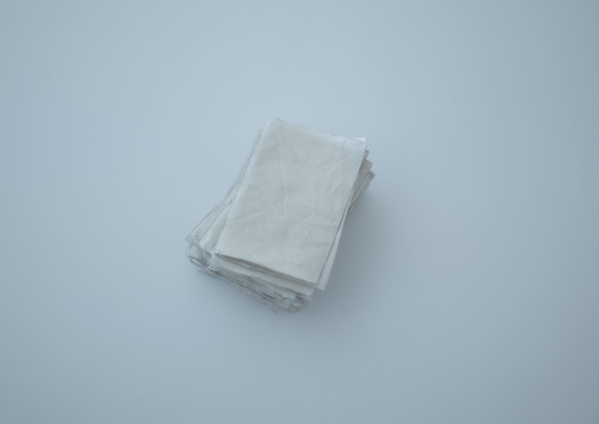 When the dried pieces of paper are unglazed, a thin piece of porcelain clay is formed that transcribes the expression of the washi, but at the same time the washi is burned away, leaving only its shadow. The instantaneous form of the paper and the way it changes its expression over time is like the layering of time that knows no bounds.