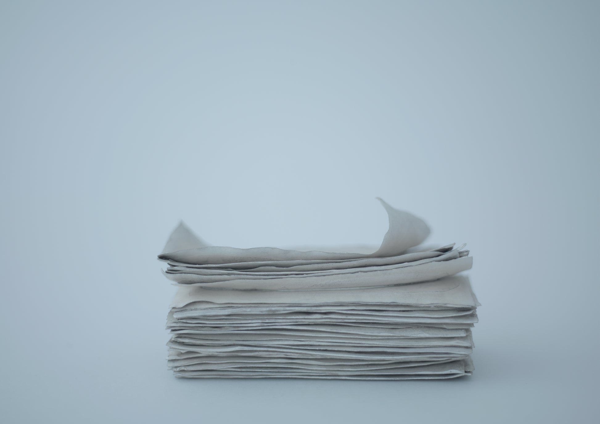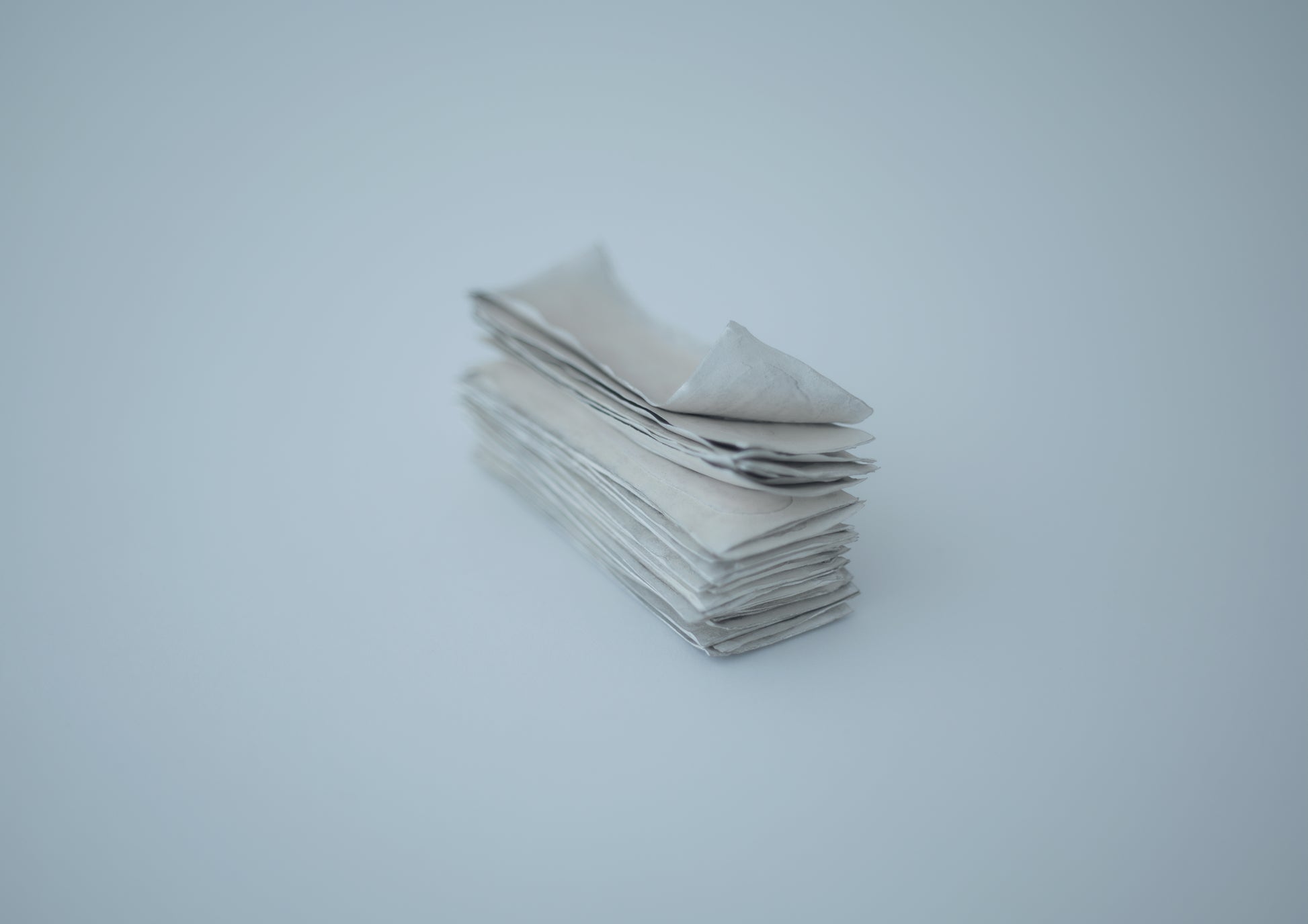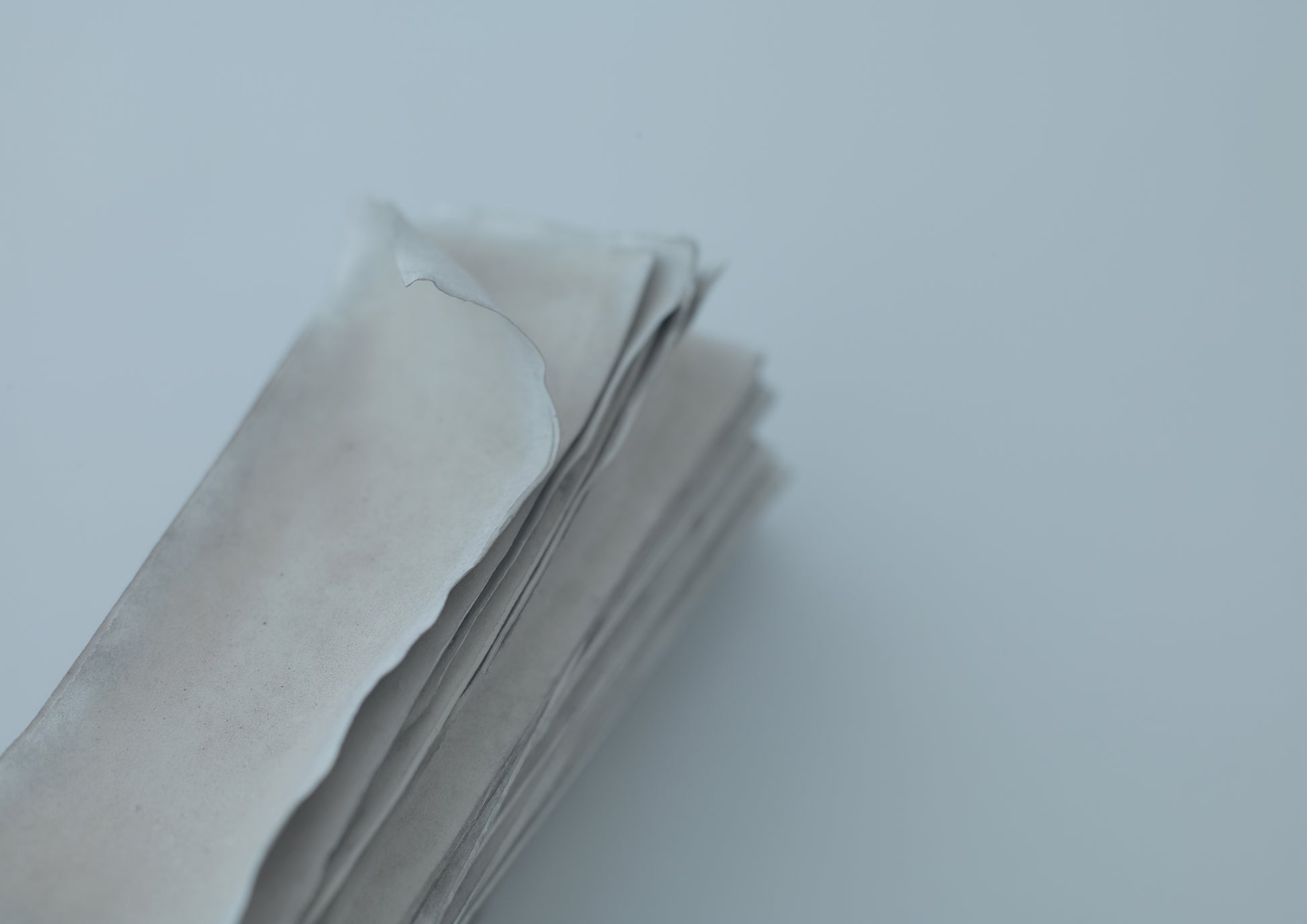 When the dried pieces of paper are unglazed, a thin piece of porcelain clay is formed that transcribes the expression of the washi, but at the same time the washi is burned away, leaving only its shadow. The instantaneous form of the paper and the way it changes its expression over time is like the layering of time that knows no bounds.