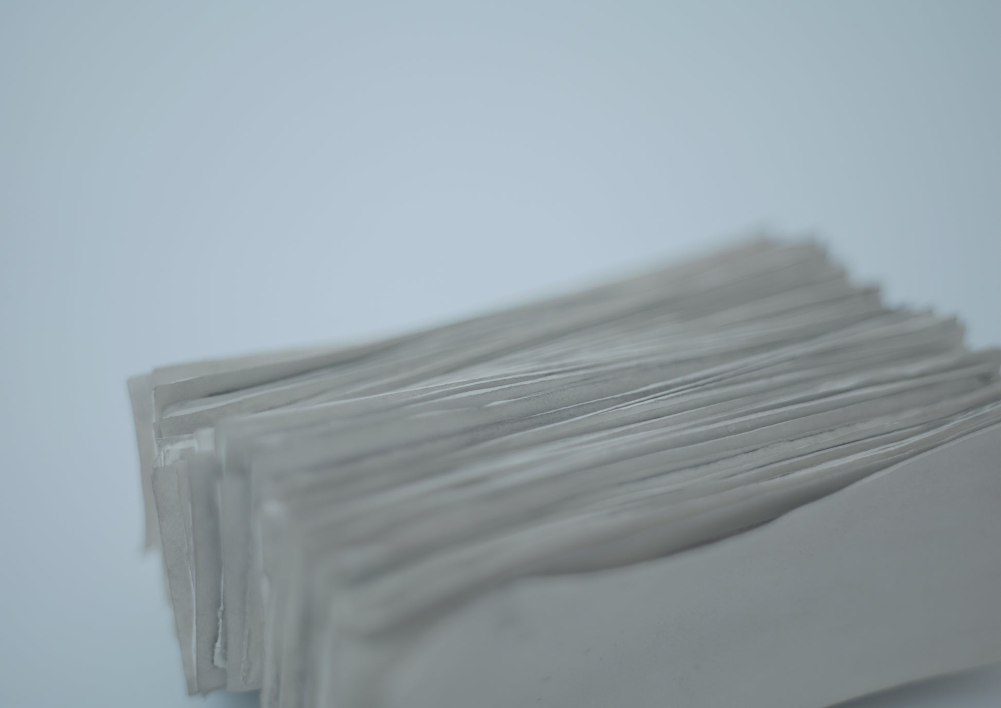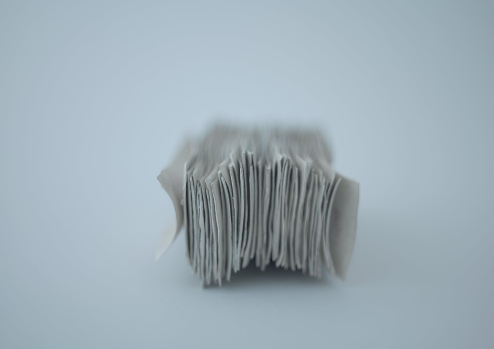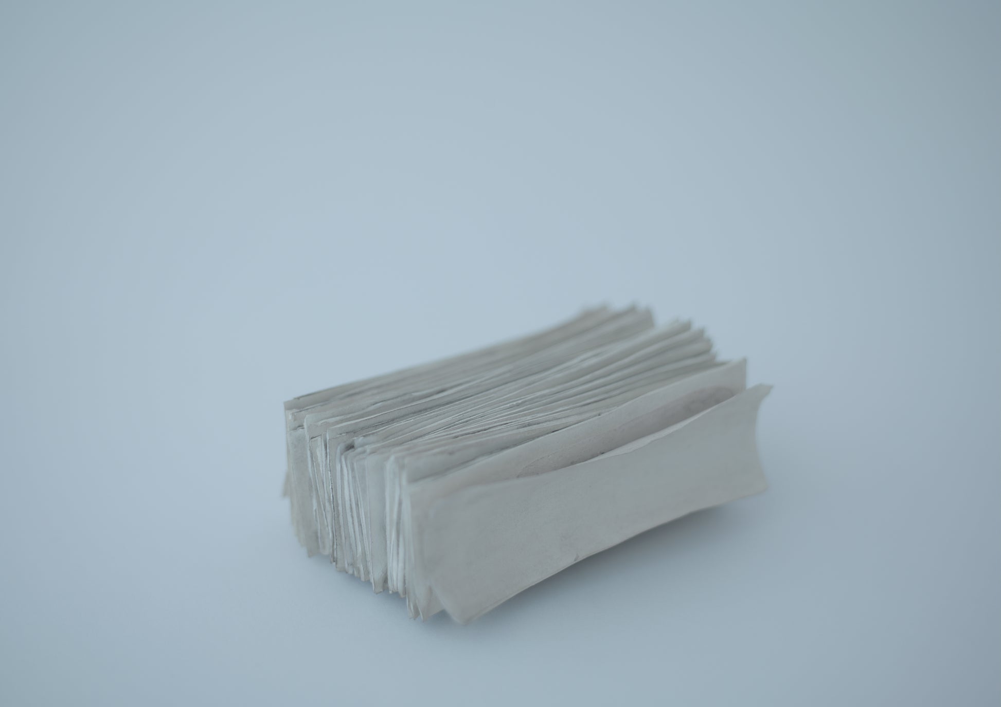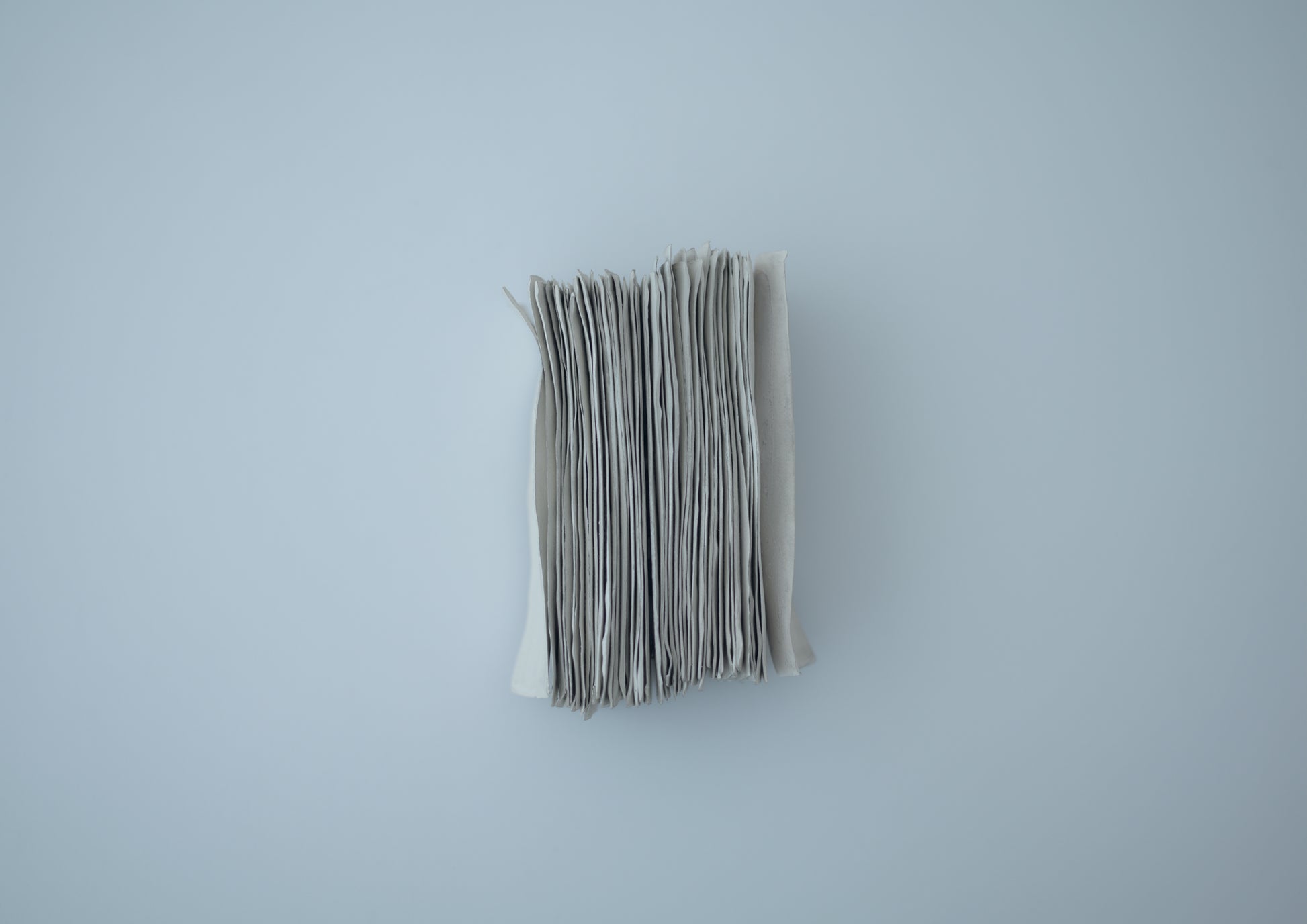 When the dried pieces of paper are unglazed, a thin piece of porcelain clay is formed that transcribes the expression of the washi, but at the same time the washi is burned away, leaving only its shadow. The instantaneous form of the paper and the way it changes its expression over time is like the layering of time that knows no bounds.