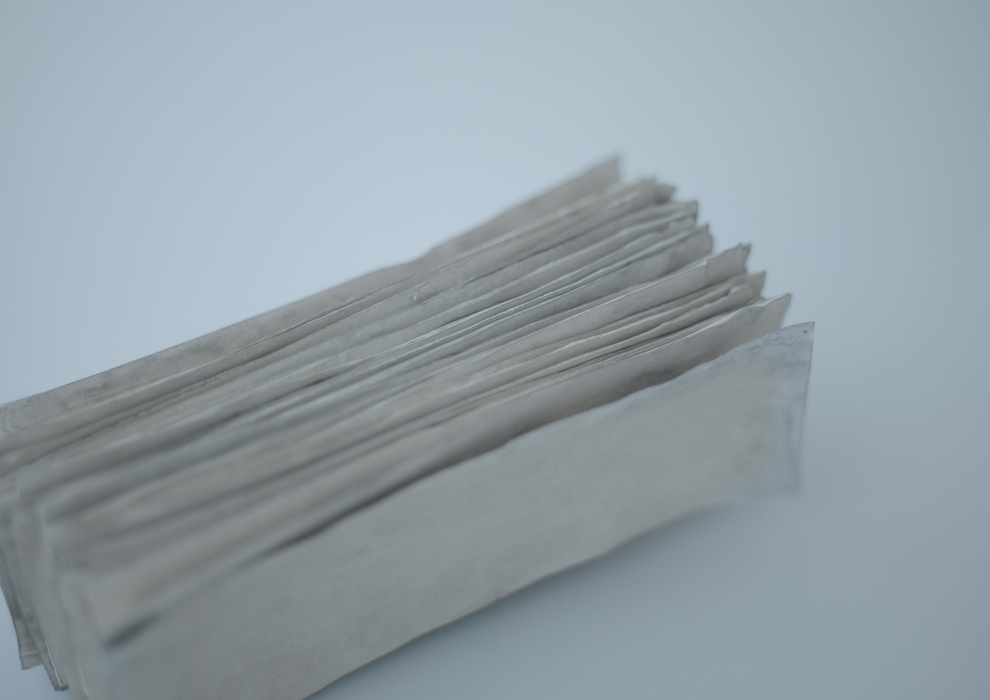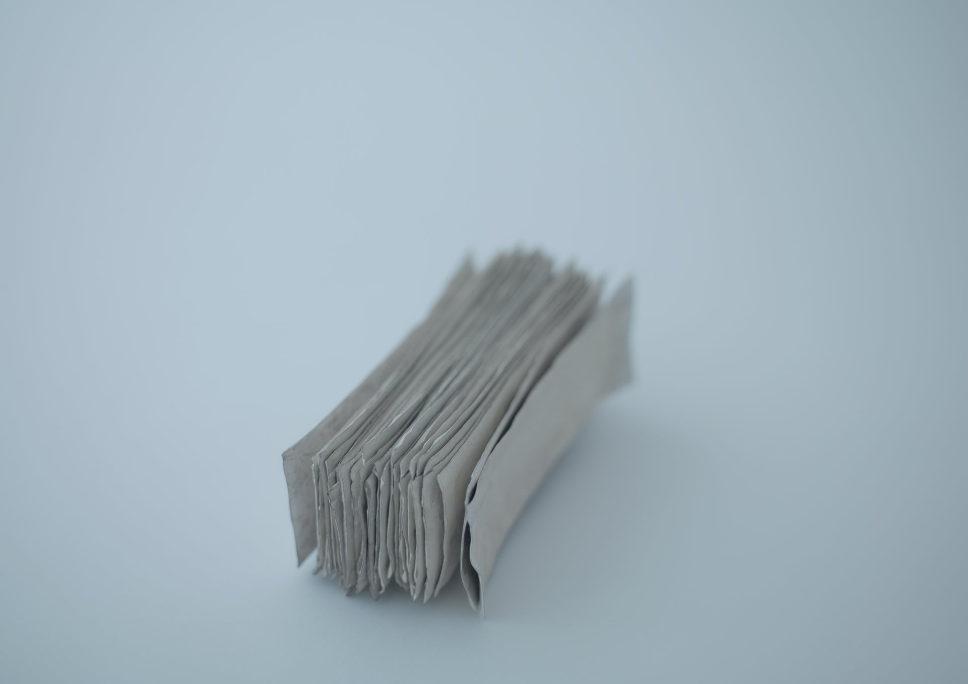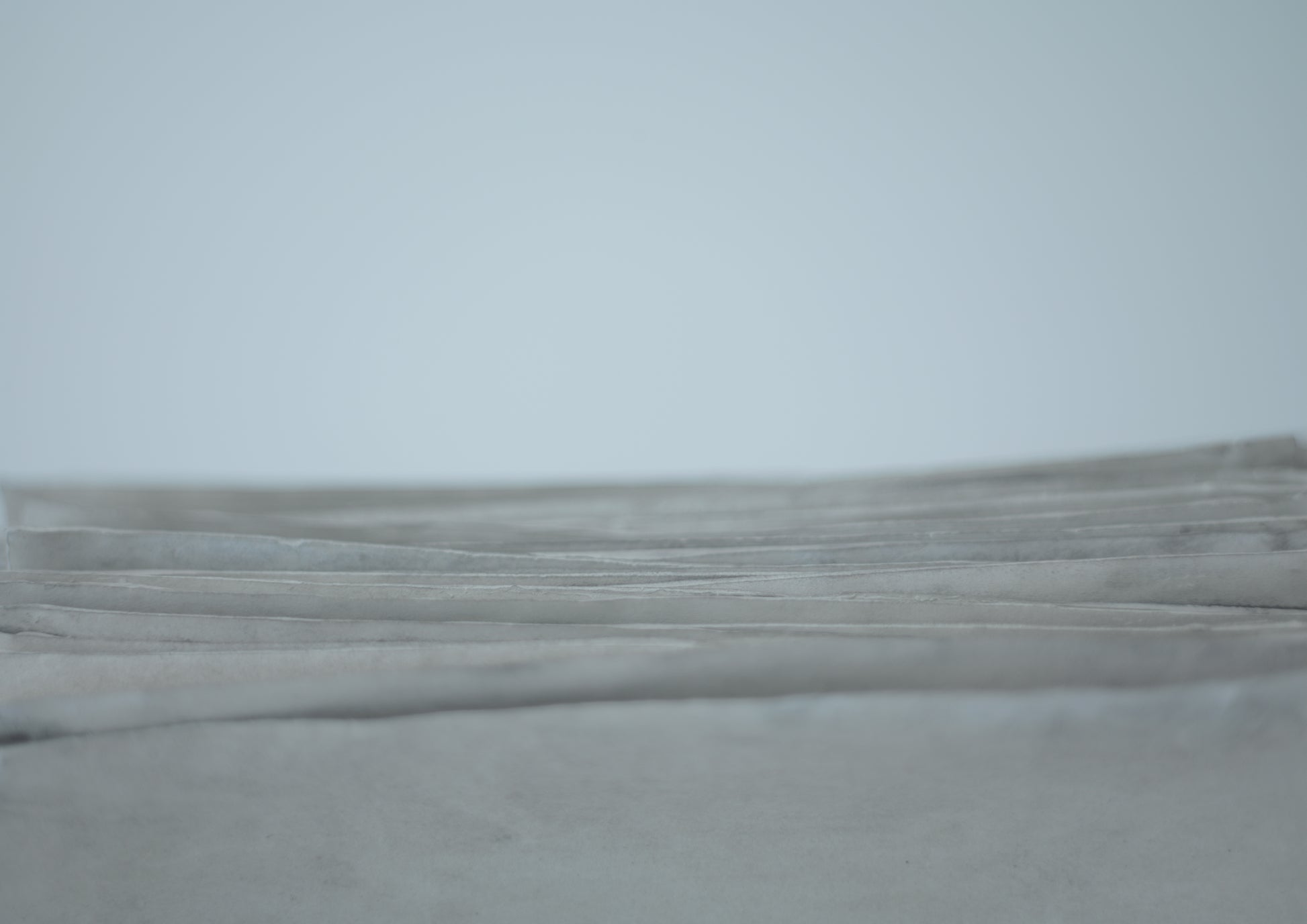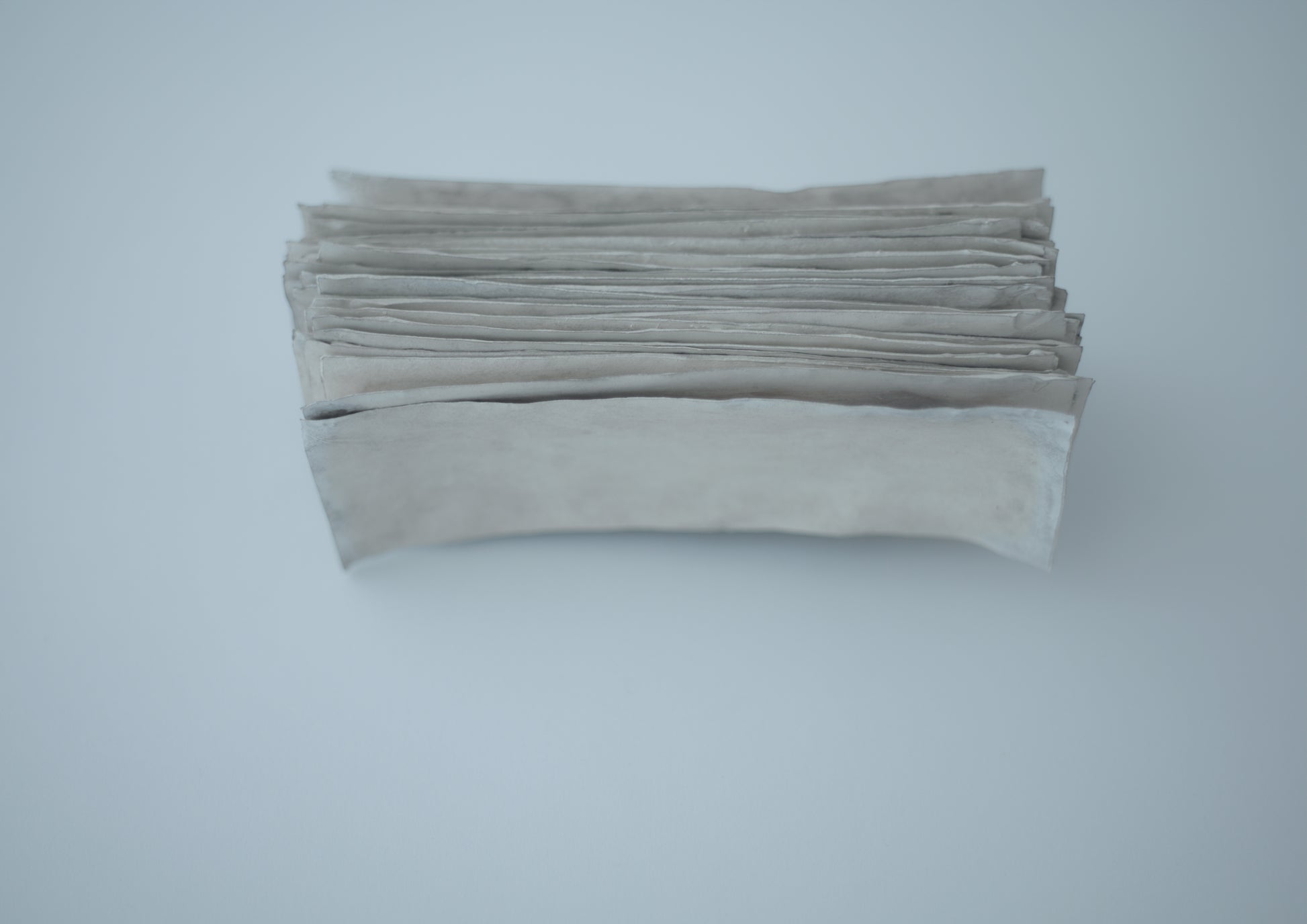When the dried pieces of paper are unglazed, a thin piece of porcelain clay is formed that transcribes the expression of the washi, but at the same time the washi is burned away, leaving only its shadow. The instantaneous form of the paper and the way it changes its expression over time is like the layering of time that knows no bounds.