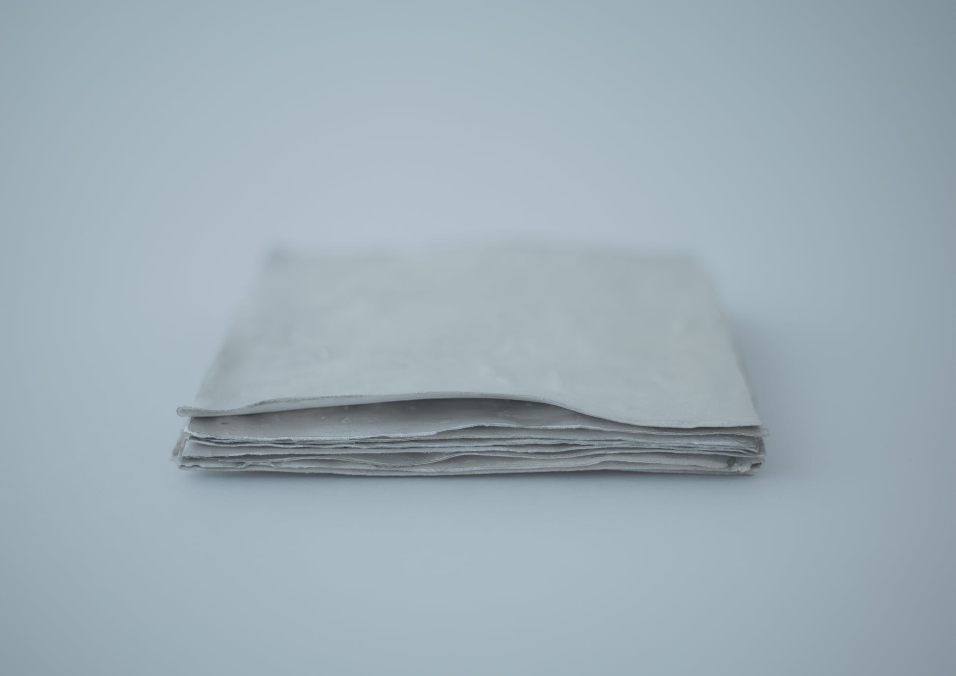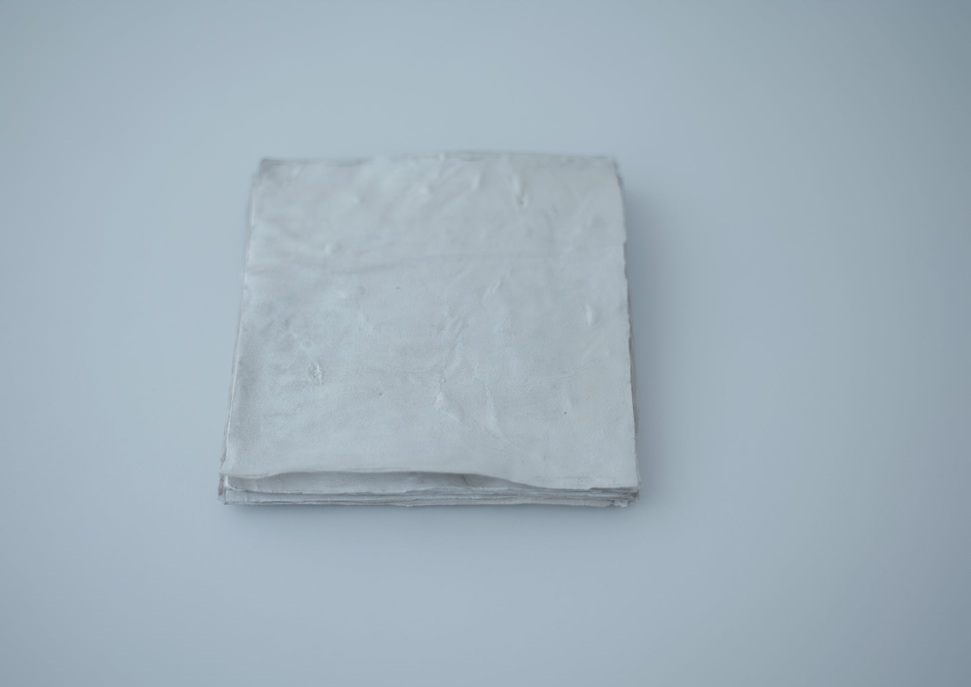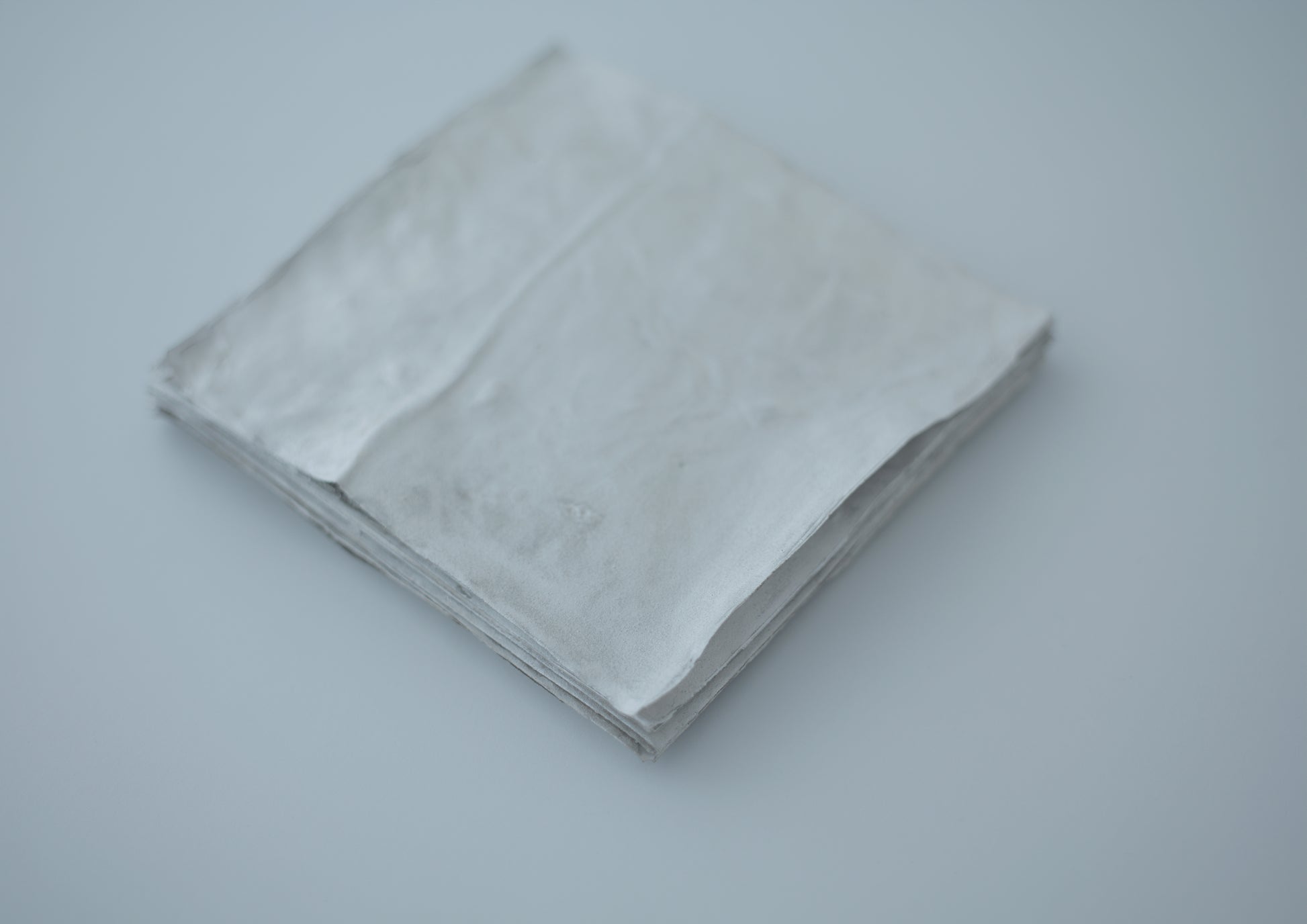 When the dried pieces of paper are unglazed, a thin piece of porcelain clay is formed that transcribes the expression of the washi, but at the same time the washi is burned away, leaving only its shadow. The instantaneous form of the paper and the way it changes its expression over time is like the layering of time that knows no bounds.