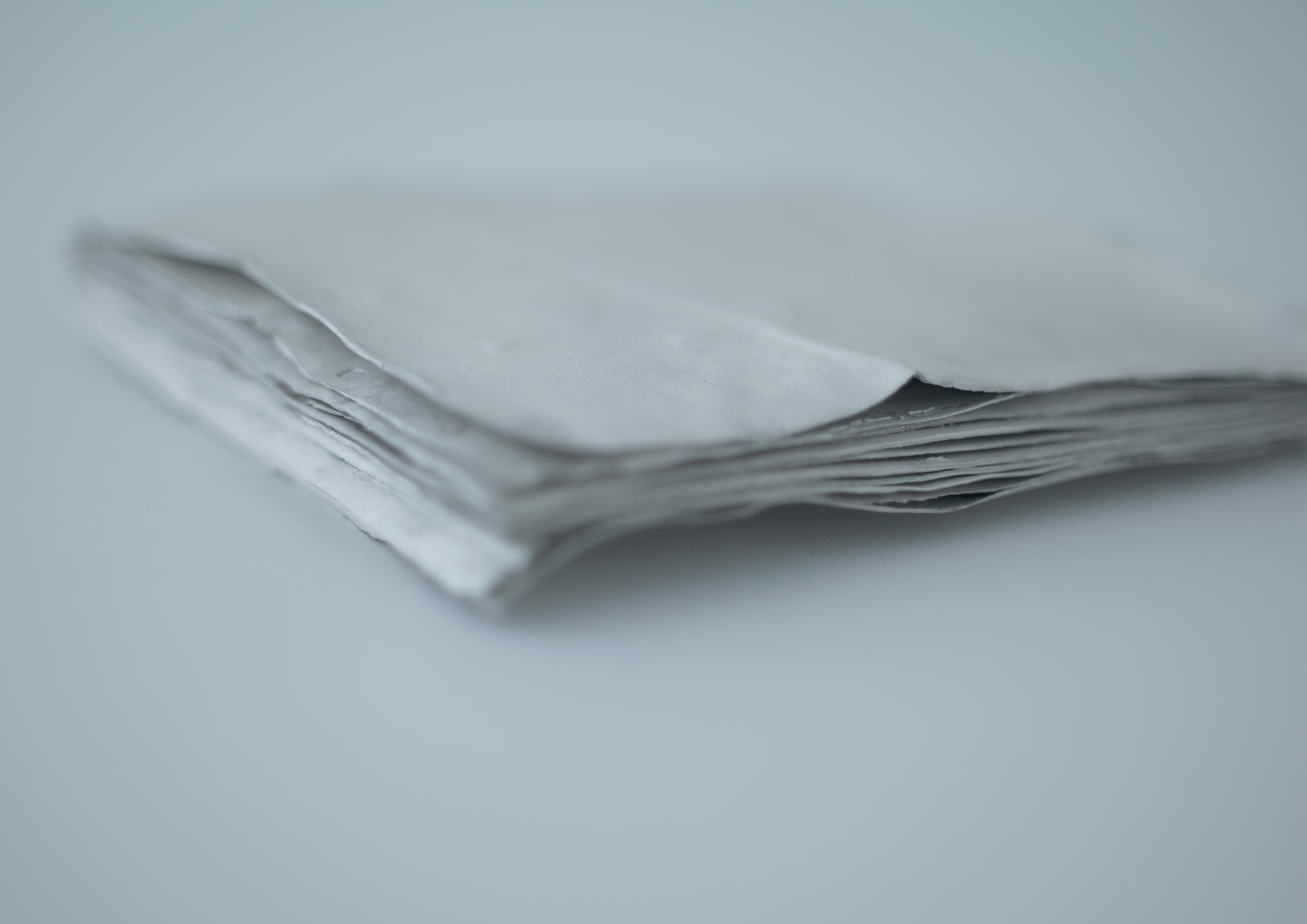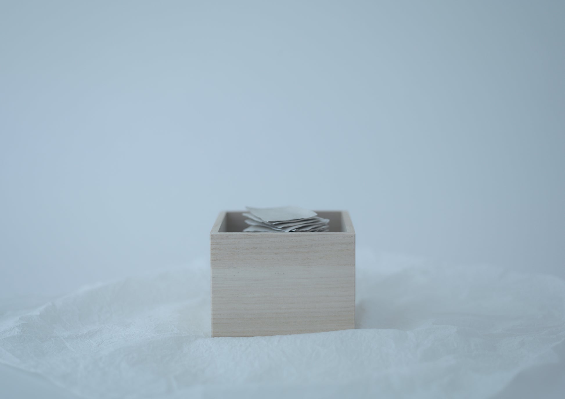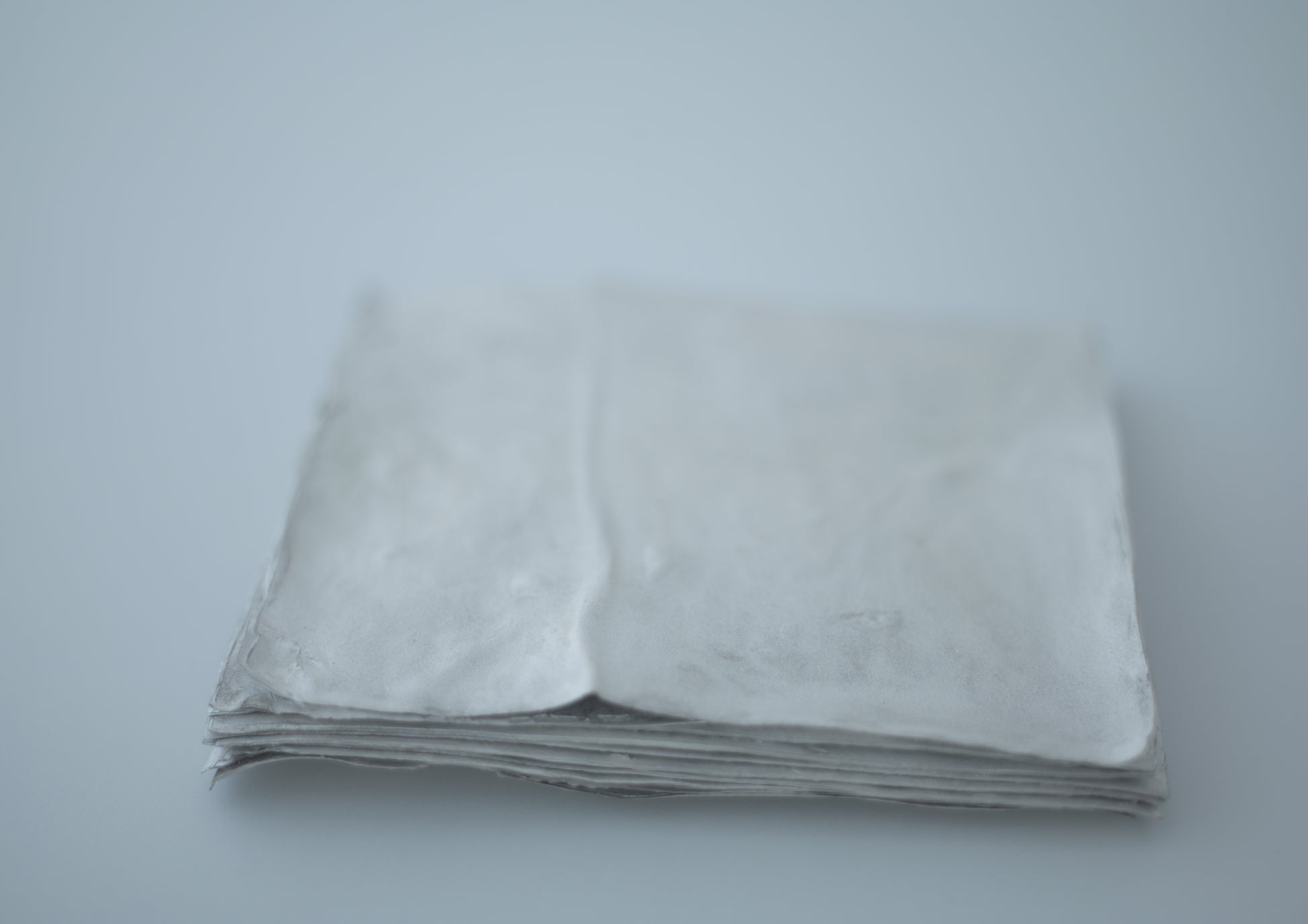 When the dried pieces of paper are unglazed, a thin piece of porcelain clay is formed that transcribes the expression of the washi, but at the same time the washi is burned away, leaving only its shadow. The instantaneous form of the paper and the way it changes its expression over time is like the layering of time that knows no bounds.