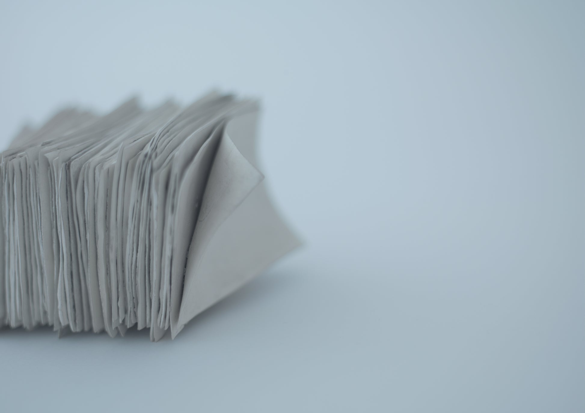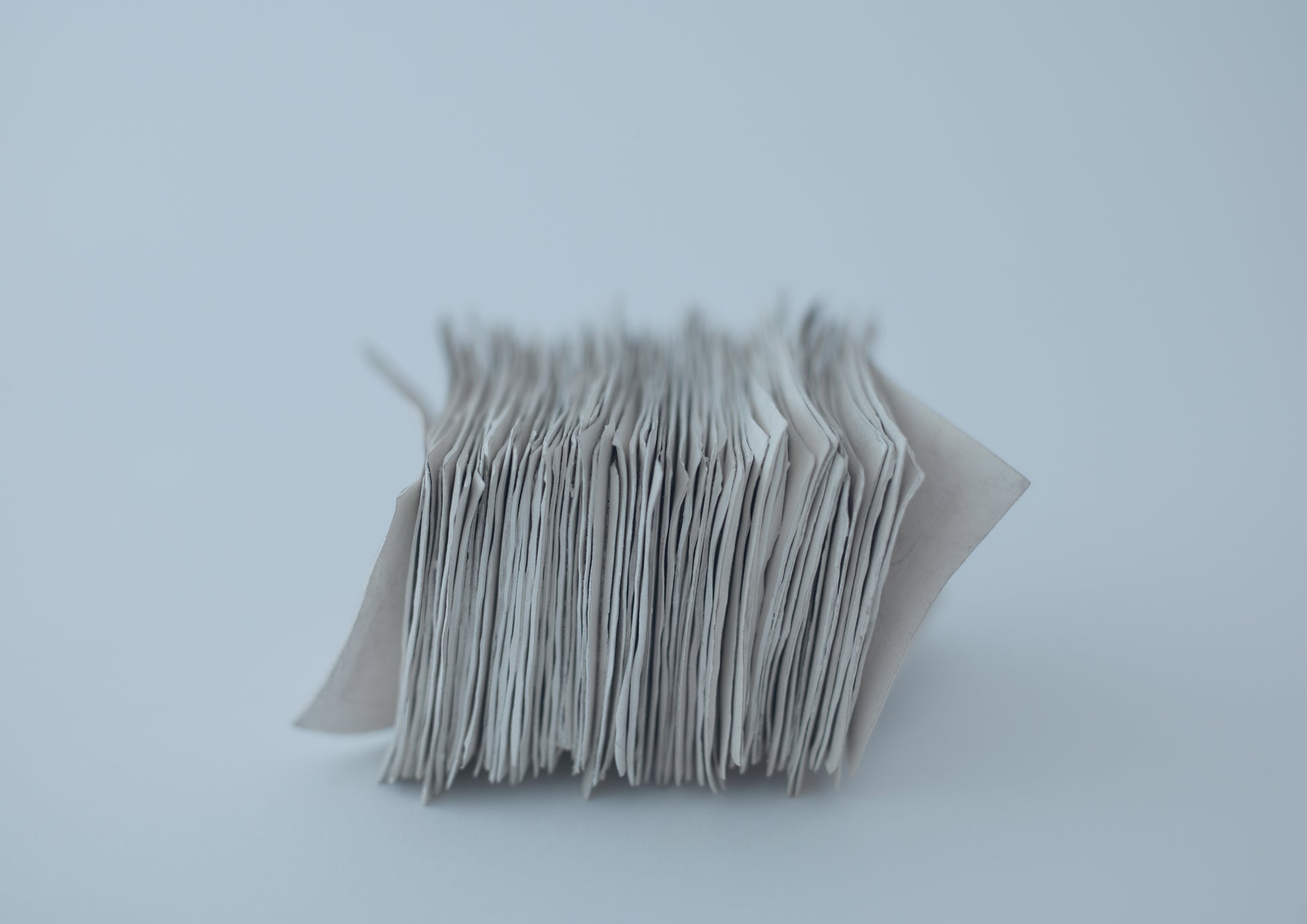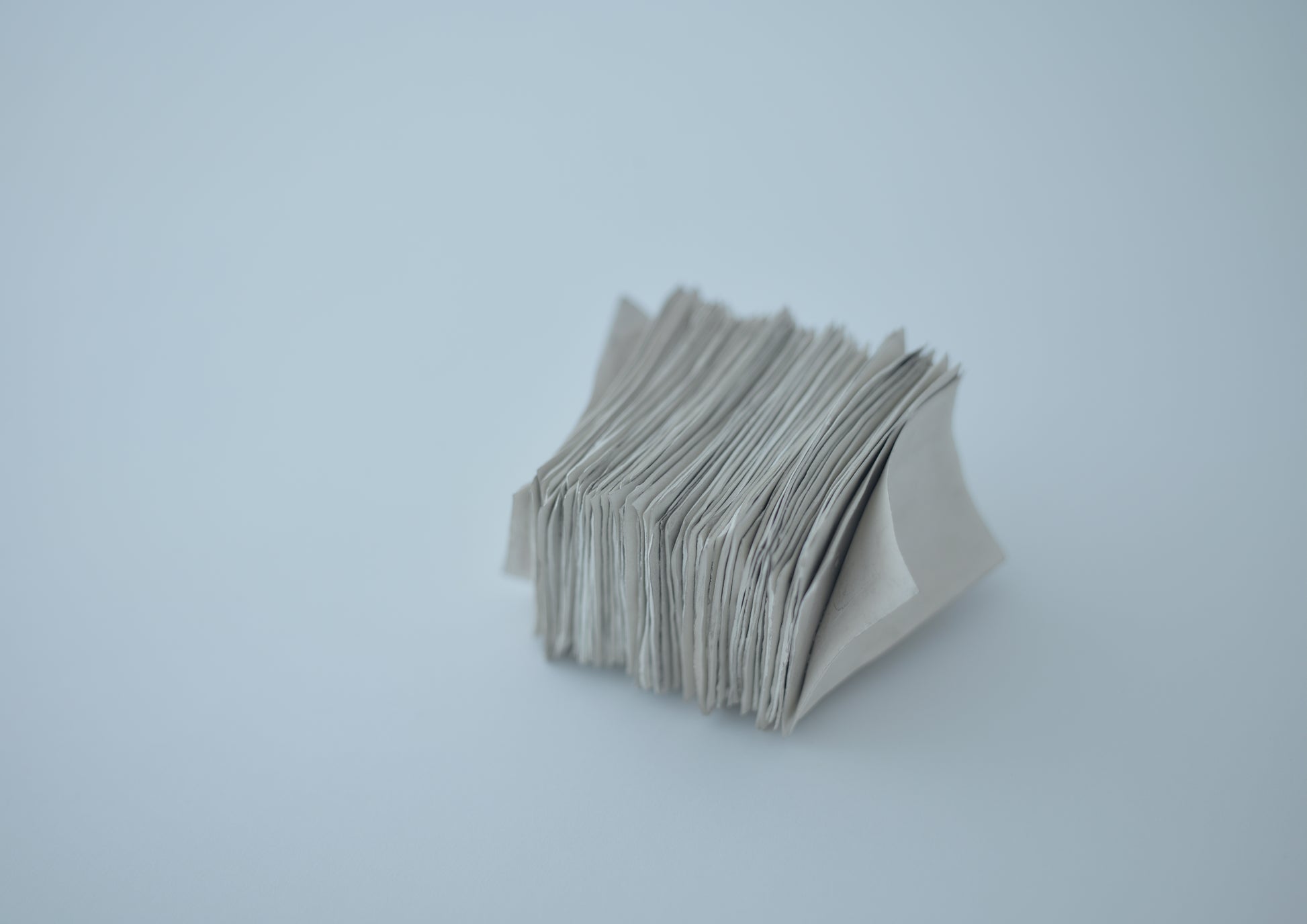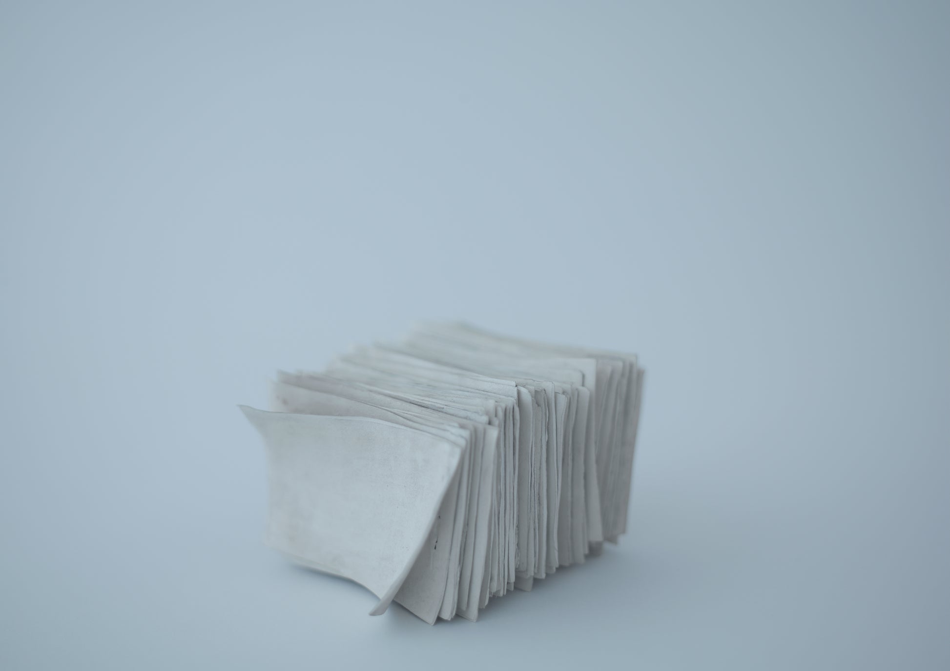 When the dried pieces of paper are unglazed, a thin piece of porcelain clay is formed that transcribes the expression of the washi, but at the same time the washi is burned away, leaving only its shadow. The instantaneous form of the paper and the way it changes its expression over time is like the layering of time that knows no bounds.