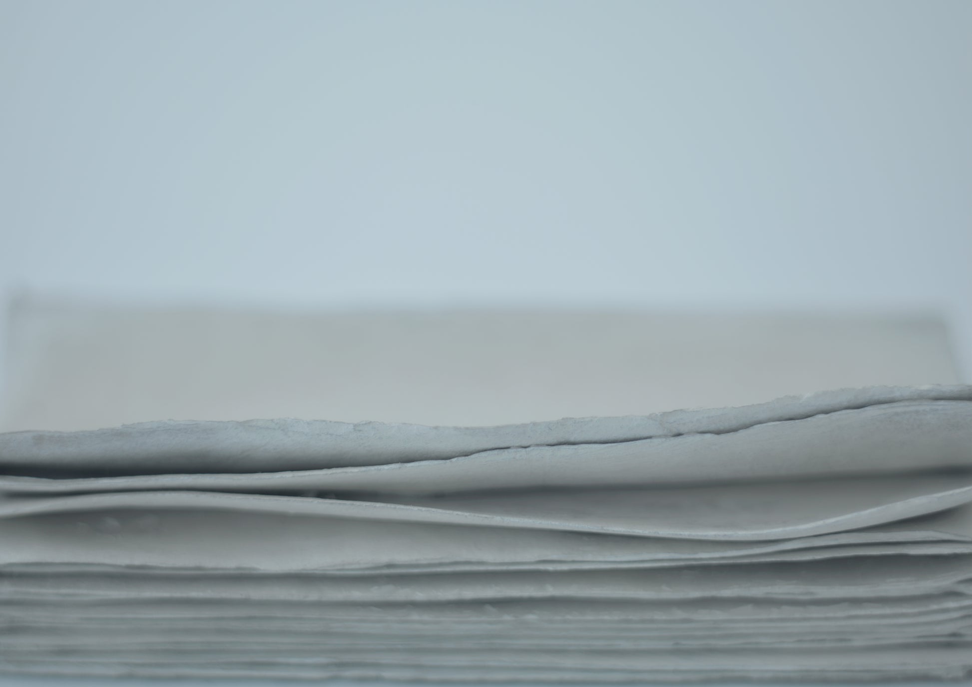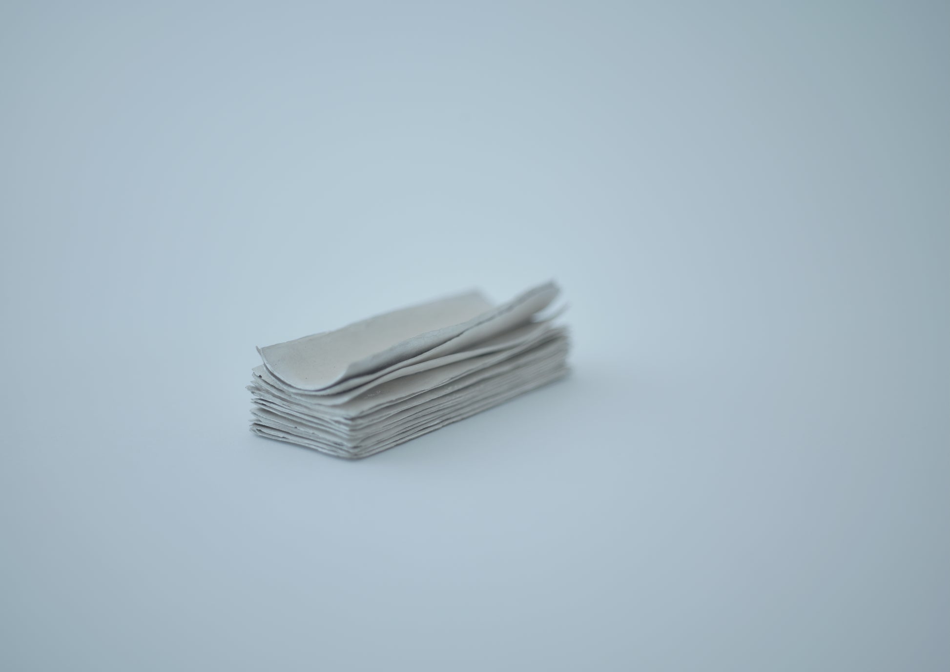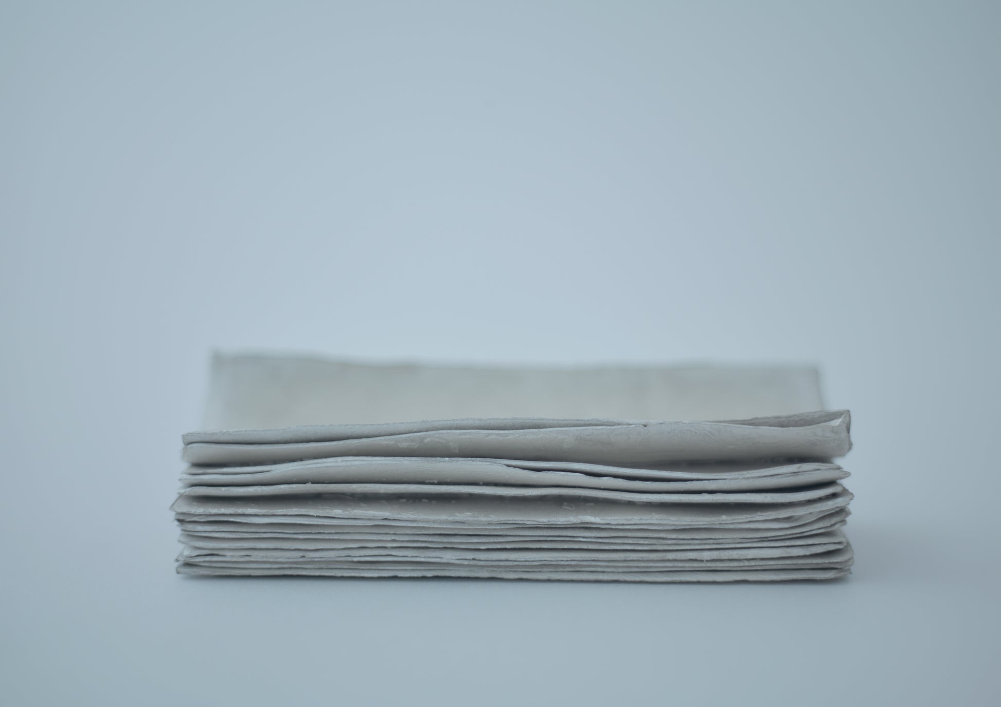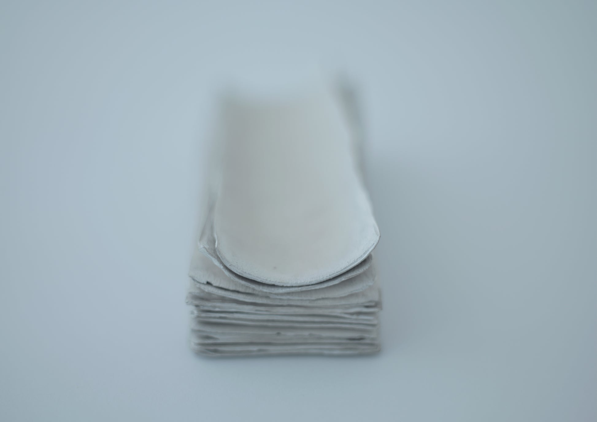 When the dried pieces of paper are unglazed, a thin piece of porcelain clay is formed that transcribes the expression of the washi, but at the same time the washi is burned away, leaving only its shadow. The instantaneous form of the paper and the way it changes its expression over time is like the layering of time that knows no bounds.