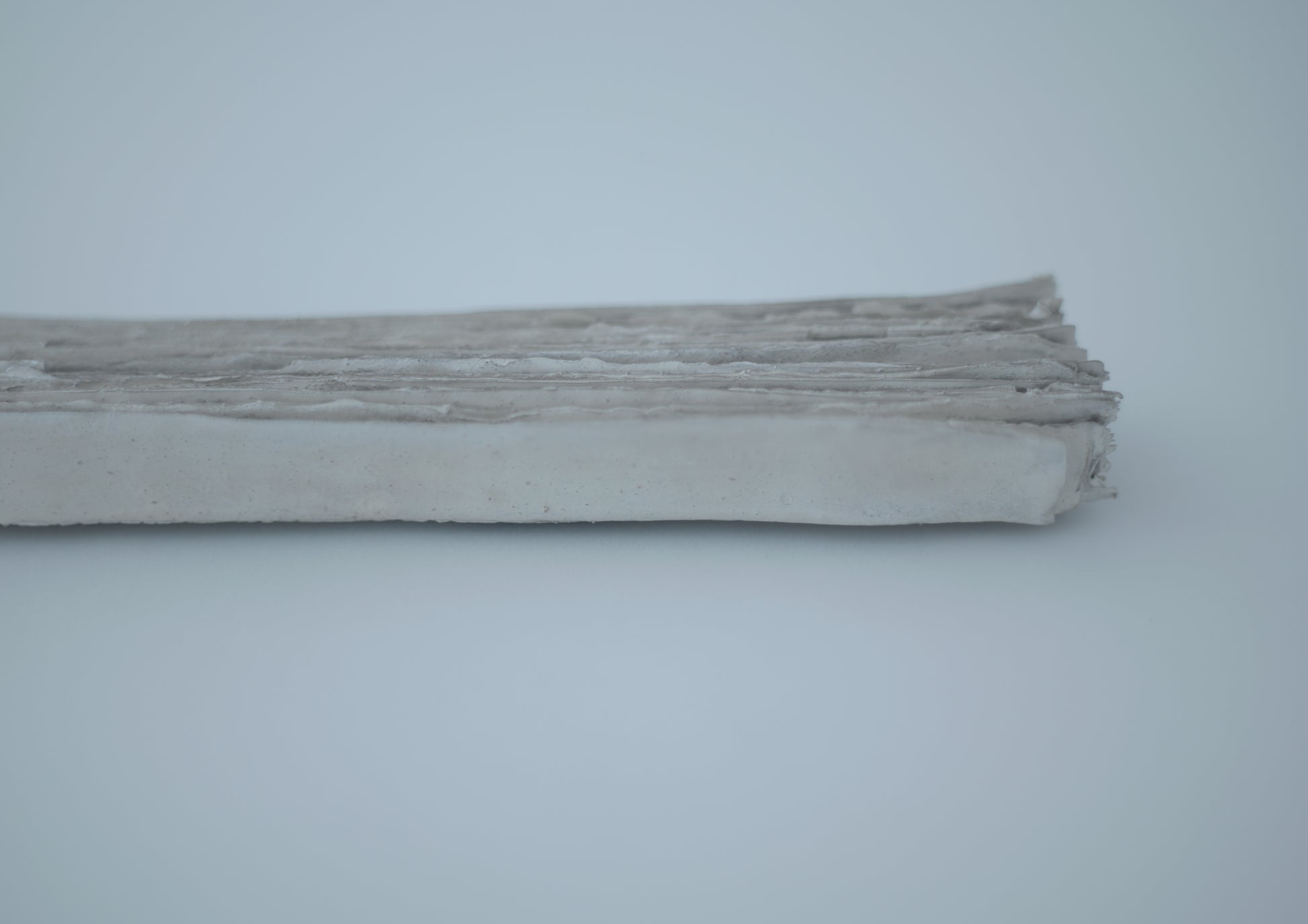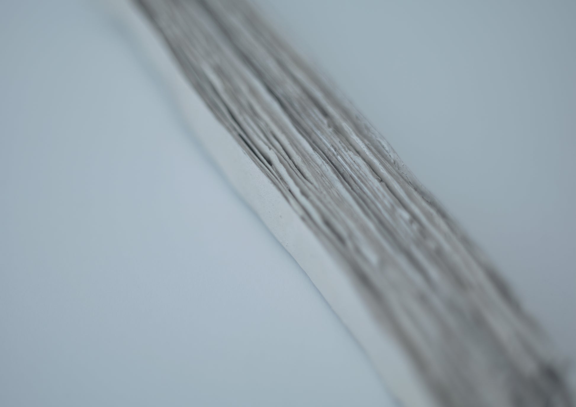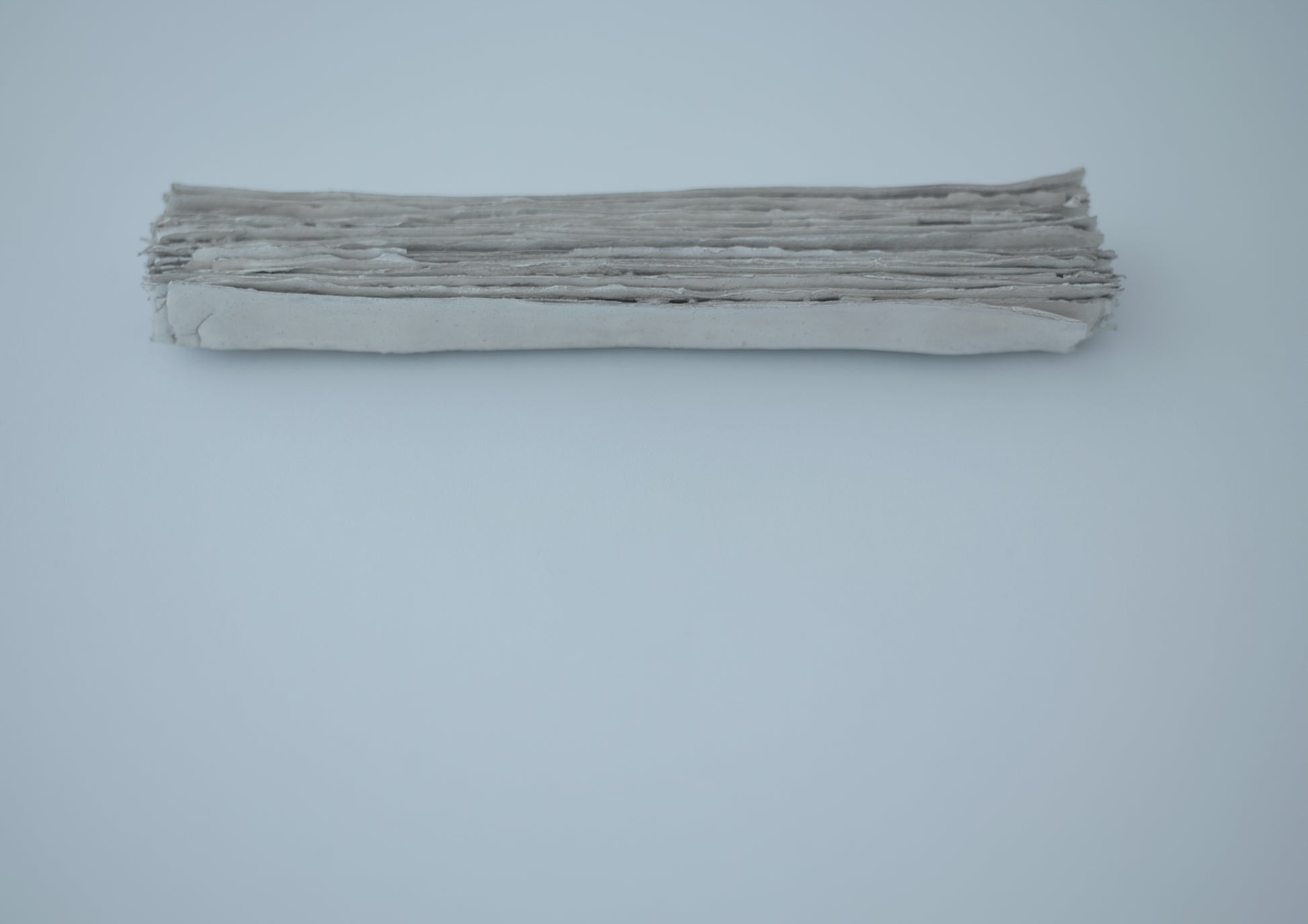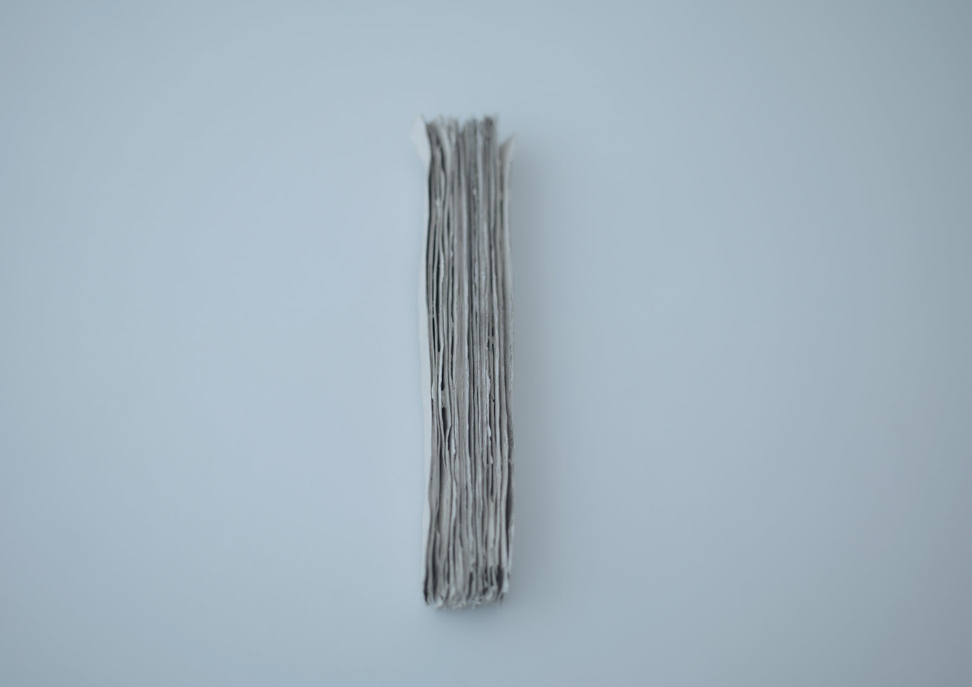 When the dried pieces of paper are unglazed, a thin piece of porcelain clay is formed that transcribes the expression of the washi, but at the same time the washi is burned away, leaving only its shadow. The instantaneous form of the paper and the way it changes its expression over time is like the layering of time that knows no bounds.