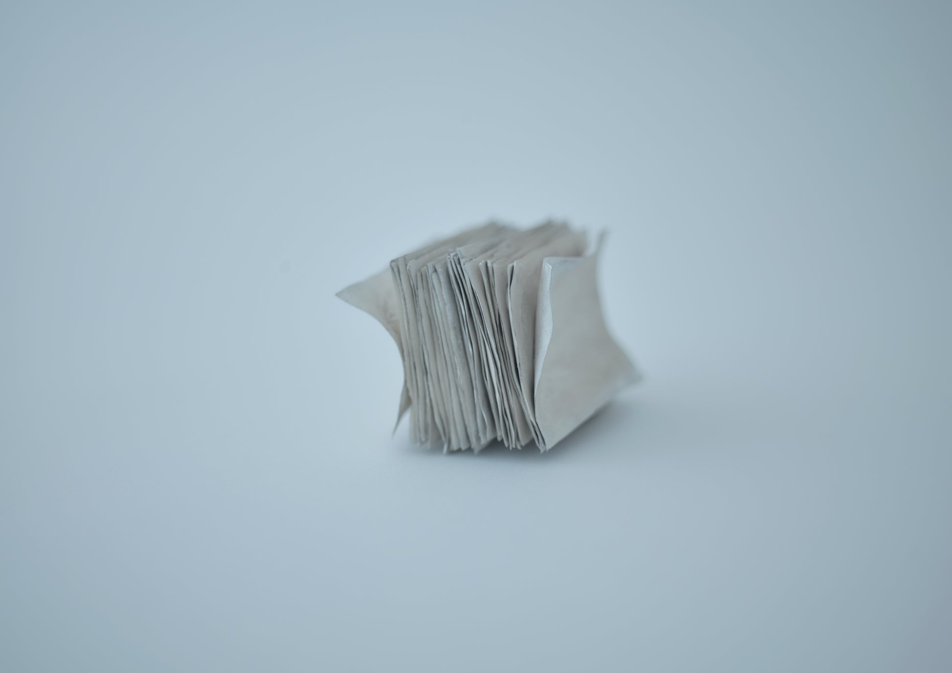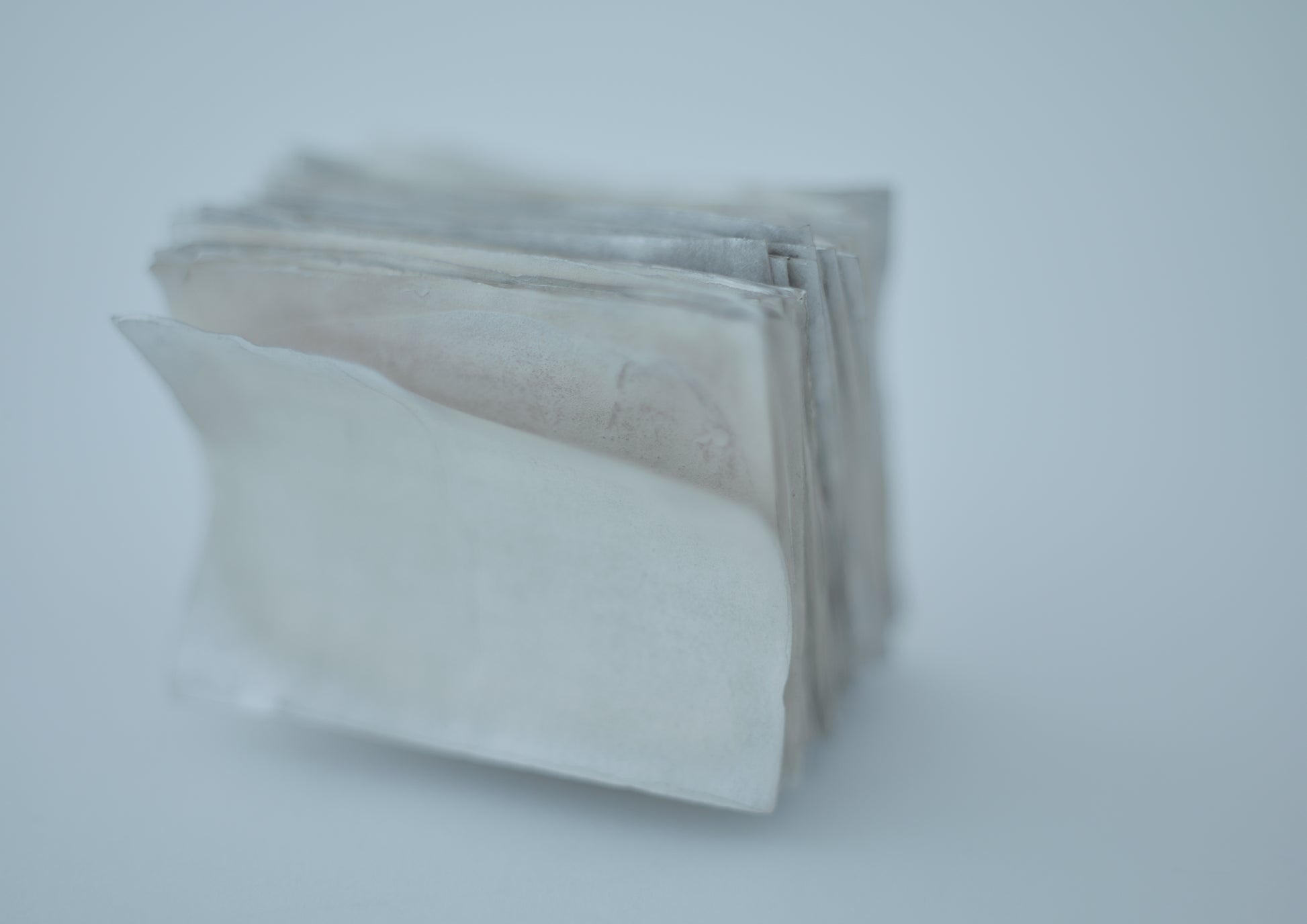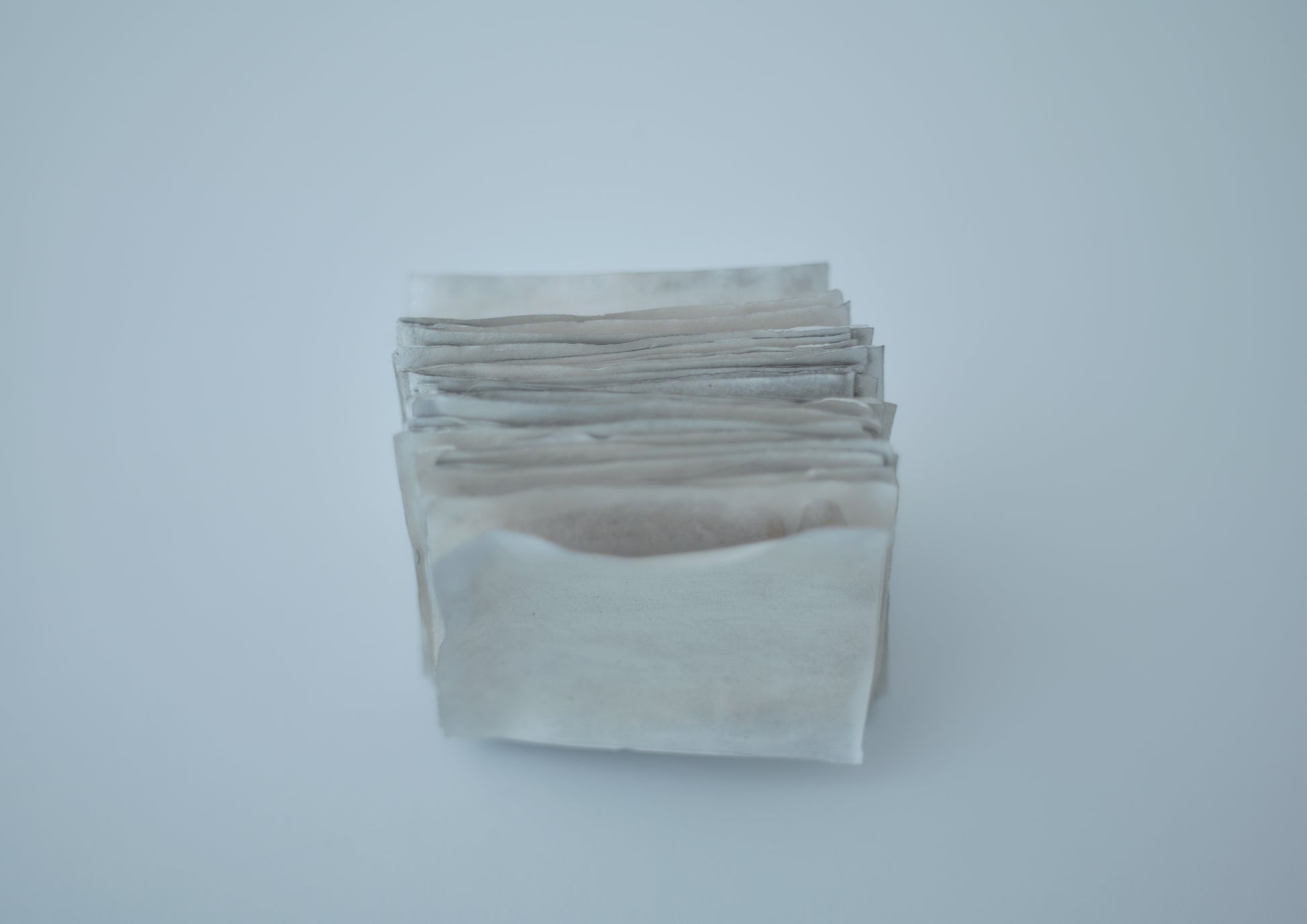 When the dried pieces of paper are unglazed, a thin piece of porcelain clay is formed that transcribes the expression of the washi, but at the same time the washi is burned away, leaving only its shadow. The instantaneous form of the paper and the way it changes its expression over time is like the layering of time that knows no bounds.