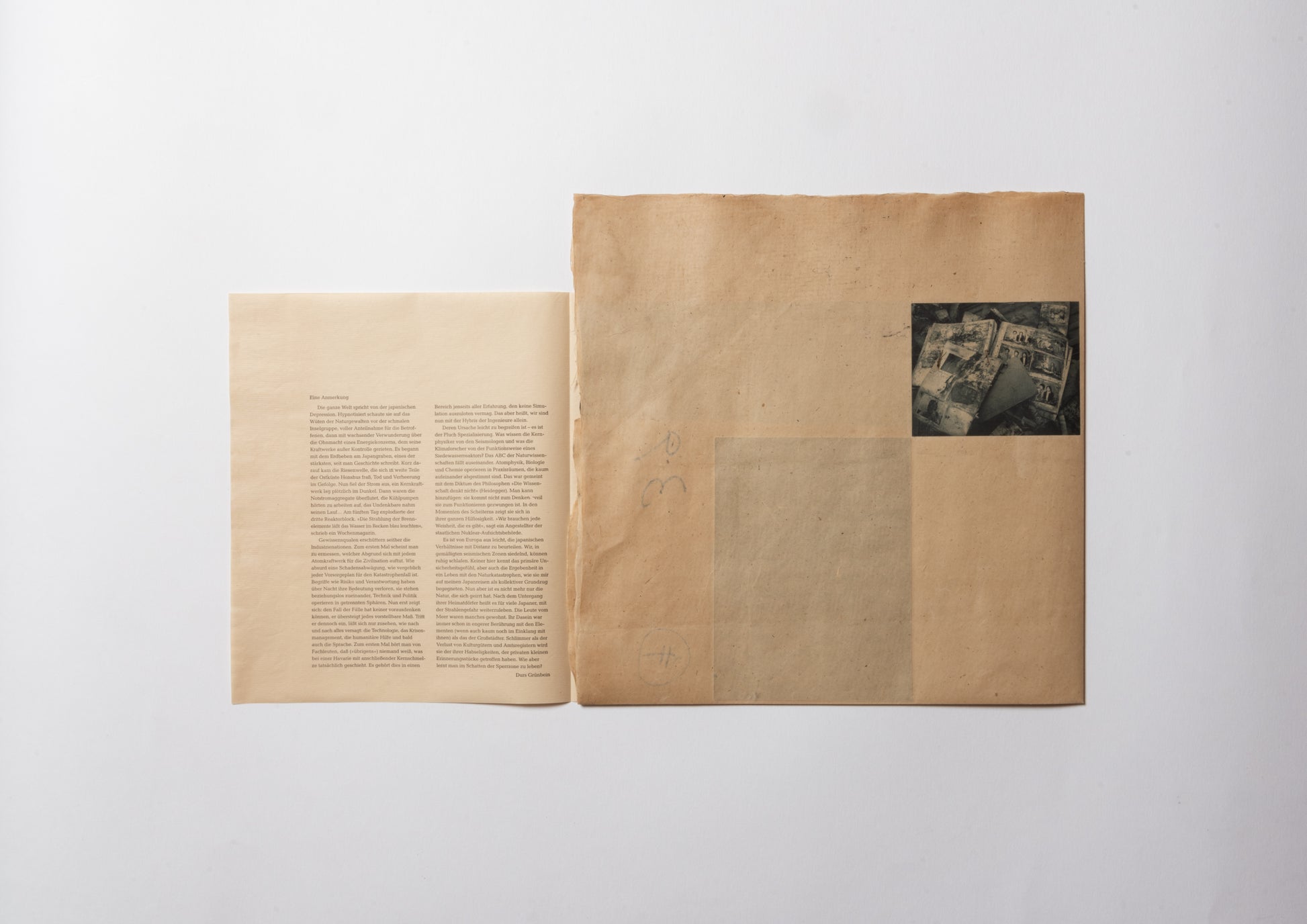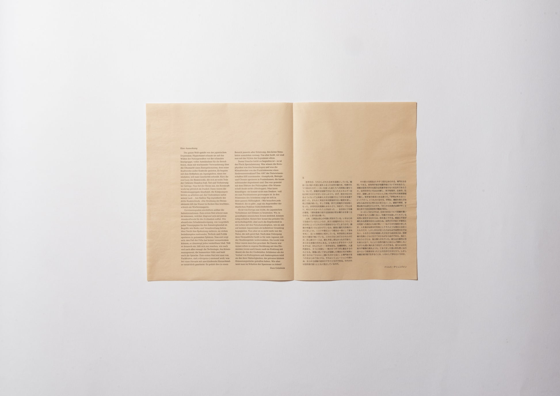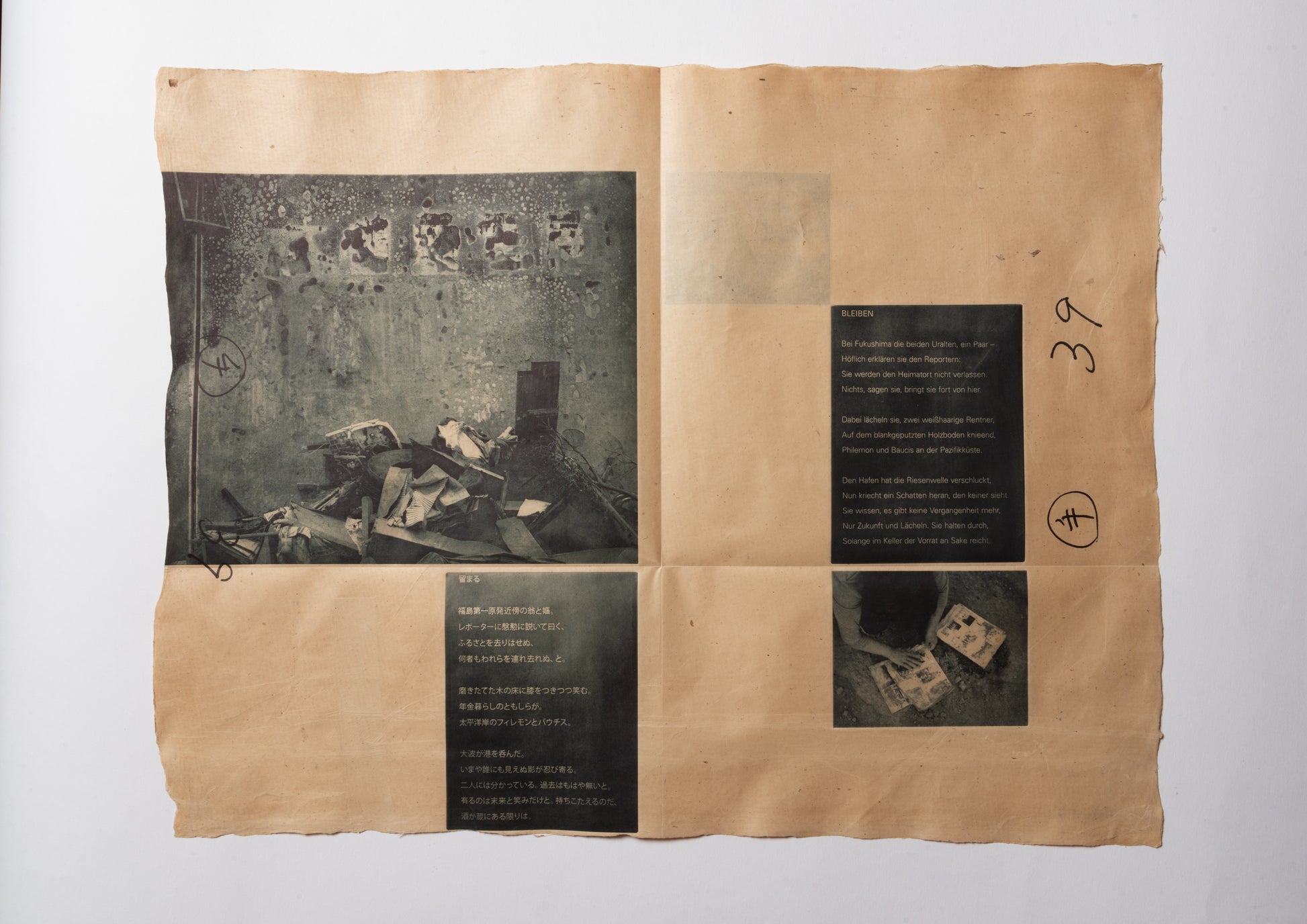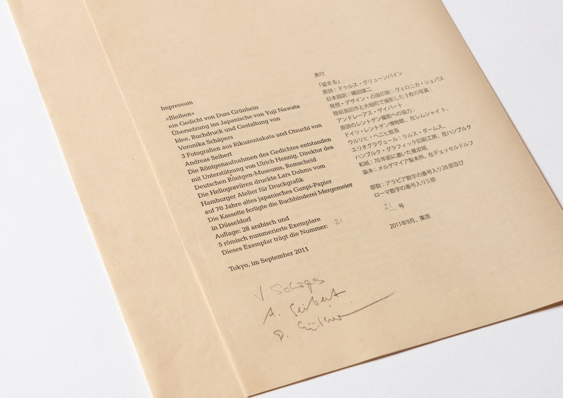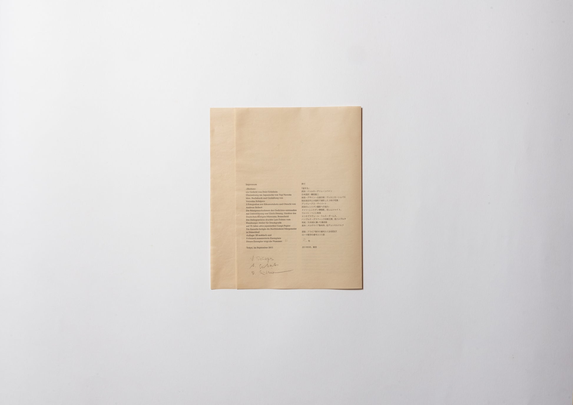 - 70年前の日本産雁皮紙に、ハンブルクの版画工房ラース・ダームスによって刷られた5点のヘリオグラヴュール。奥付と注記:雁皮紙に活版印刷。デュッセルドルフのメルゲマイヤー製本工房による、首(くび)付き・銀のタイトル箔押し入りの箱。ドイツ語原文と日本語訳の初版刊行。Letterpress print on ganpi paper. Translated into Japanese by Yuji Nawata. 3 photographs taken in Rikuzentakata and Otsuchi by Andreas Seibert. Ulrich Hennig, Director of the German X-ray Museum in Remscheid, took the x-ray images. Five photogravures printed by Lars Dahms in Hamburg on 70-year-old Japanese ganpi paper. Colophon and remarks: Letterpress print on ganpi paper. Case with embossed title by Bookbindery Mergemeier in Düsseldorf. First edition of the German text and its Japanese translation. ––– 1 sheet, about 68 x 52 cm. Edition of 28 copies using Arabic numerals and 5 copies using Roman numerals –– Tokyo, 2011