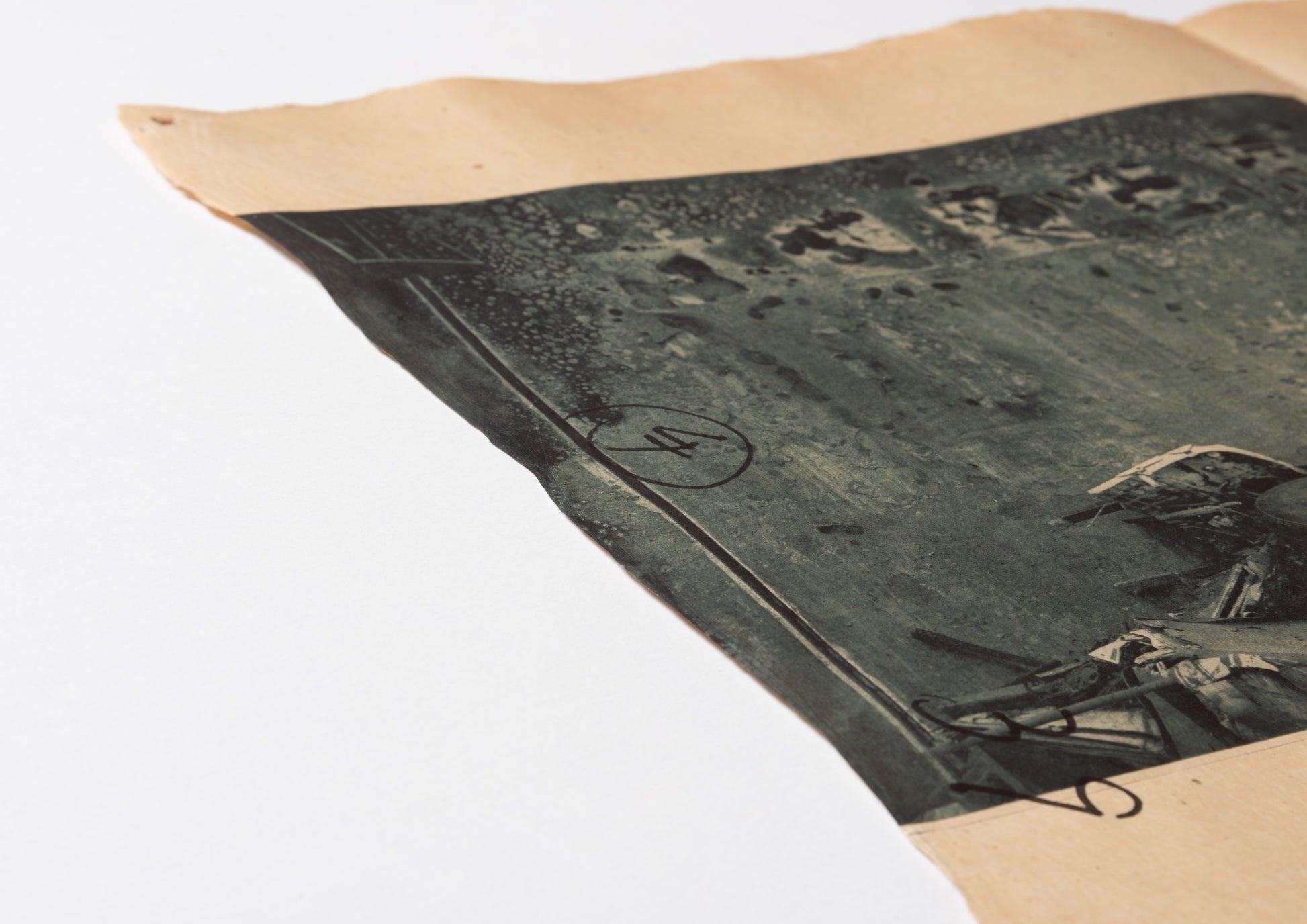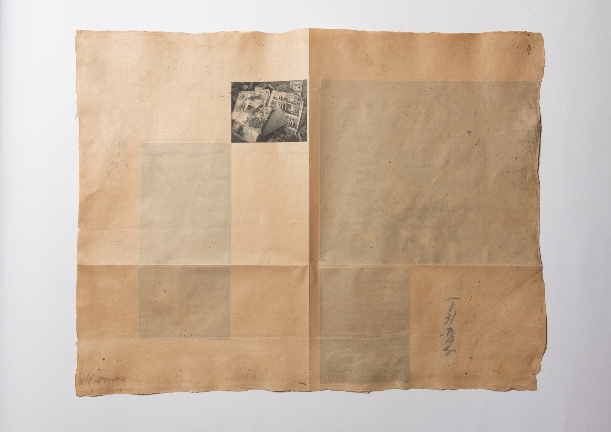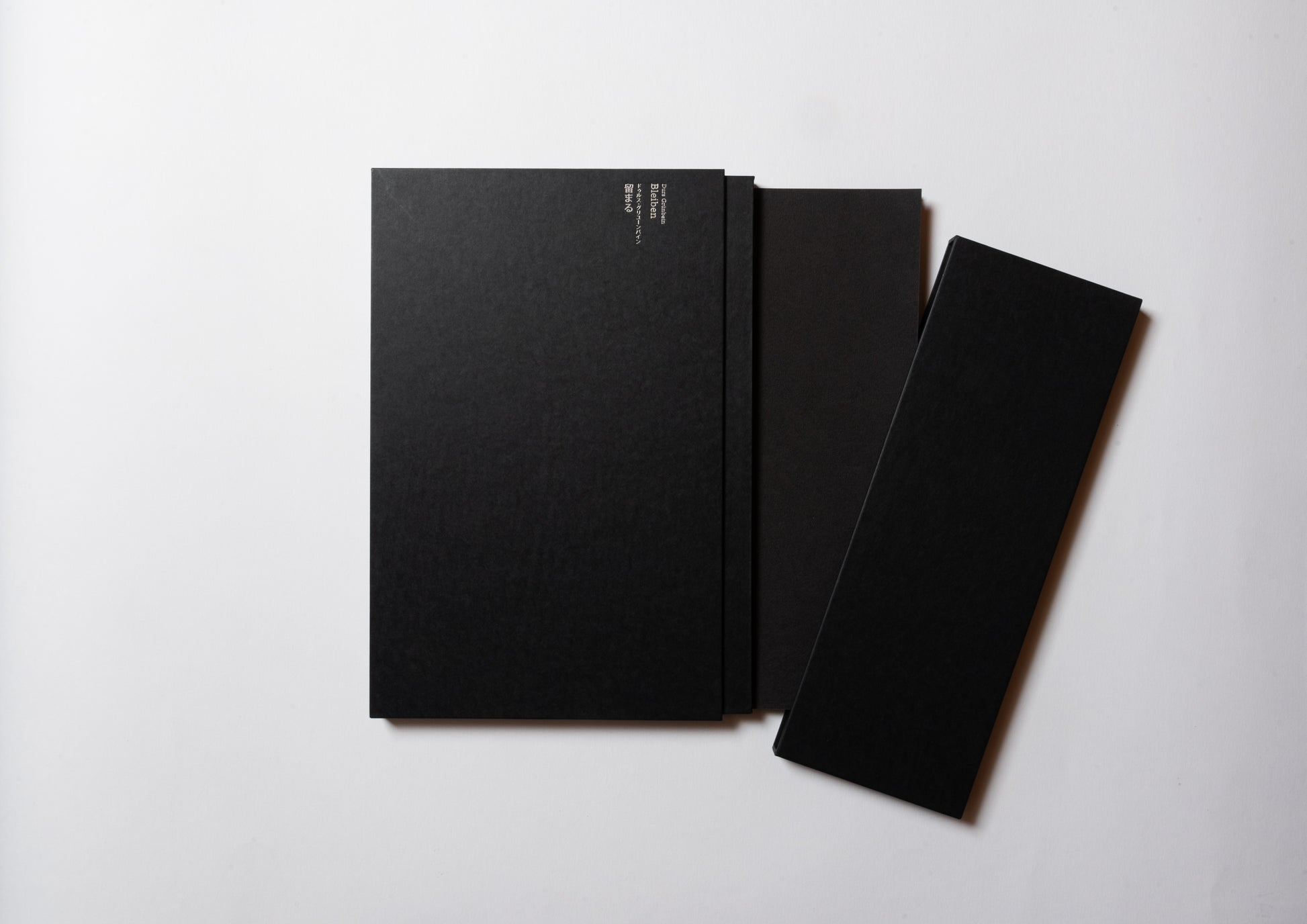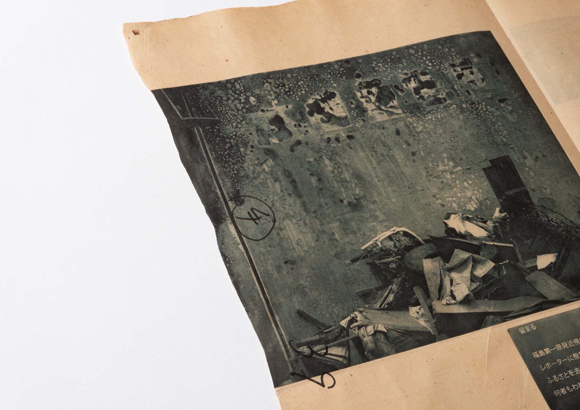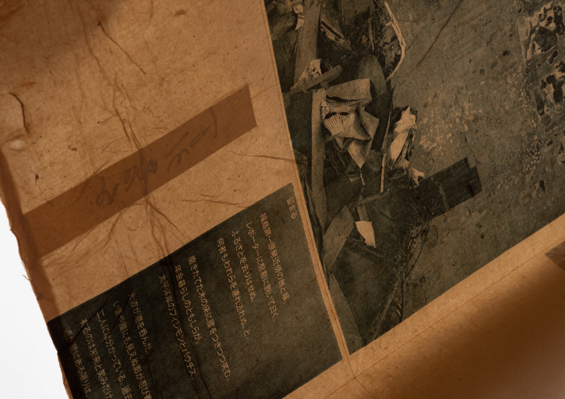 - 70年前の日本産雁皮紙に、ハンブルクの版画工房ラース・ダームスによって刷られた5点のヘリオグラヴュール。奥付と注記:雁皮紙に活版印刷。デュッセルドルフのメルゲマイヤー製本工房による、首(くび)付き・銀のタイトル箔押し入りの箱。ドイツ語原文と日本語訳の初版刊行。Letterpress print on ganpi paper. Translated into Japanese by Yuji Nawata. 3 photographs taken in Rikuzentakata and Otsuchi by Andreas Seibert. Ulrich Hennig, Director of the German X-ray Museum in Remscheid, took the x-ray images. Five photogravures printed by Lars Dahms in Hamburg on 70-year-old Japanese ganpi paper. Colophon and remarks: Letterpress print on ganpi paper. Case with embossed title by Bookbindery Mergemeier in Düsseldorf. First edition of the German text and its Japanese translation. ––– 1 sheet, about 68 x 52 cm. Edition of 28 copies using Arabic numerals and 5 copies using Roman numerals –– Tokyo, 2011