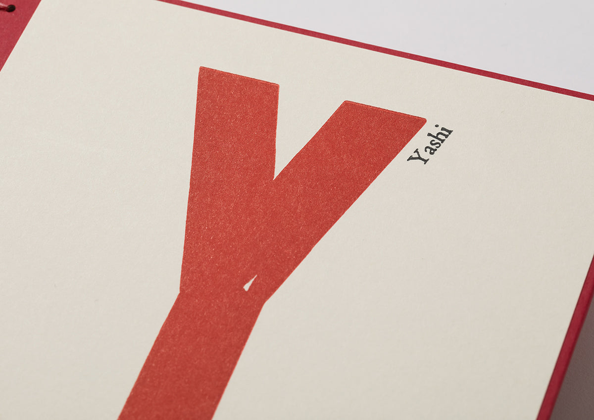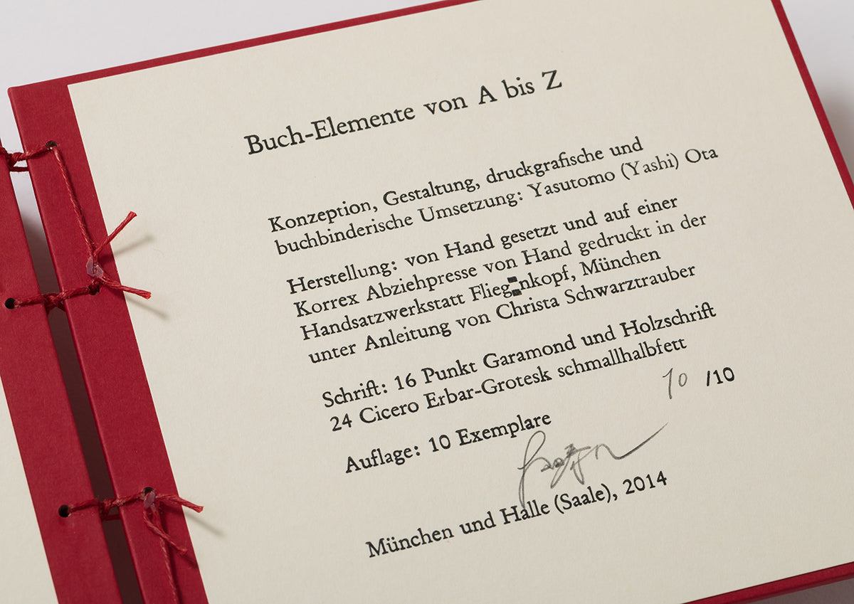 For example, D is printed with "Druckvemerk" which means "stamp", and E is printed with "Exlibris" which means "bookplate". The Y page is a little different, and it is printed with "Yashi", the nickname of Yasutomo Ota during his time in Germany. Because the person himself is indispensable to the making of a book.