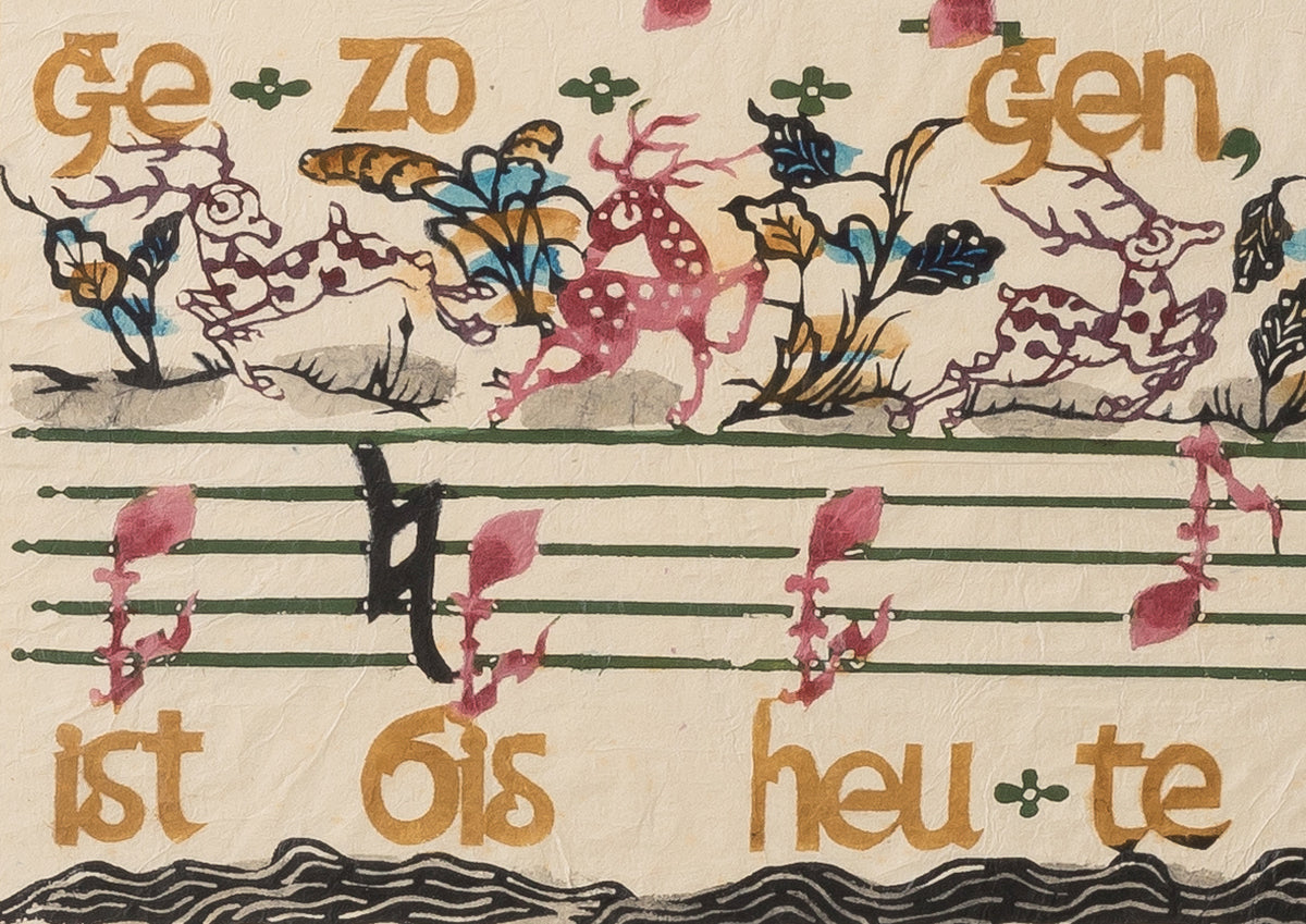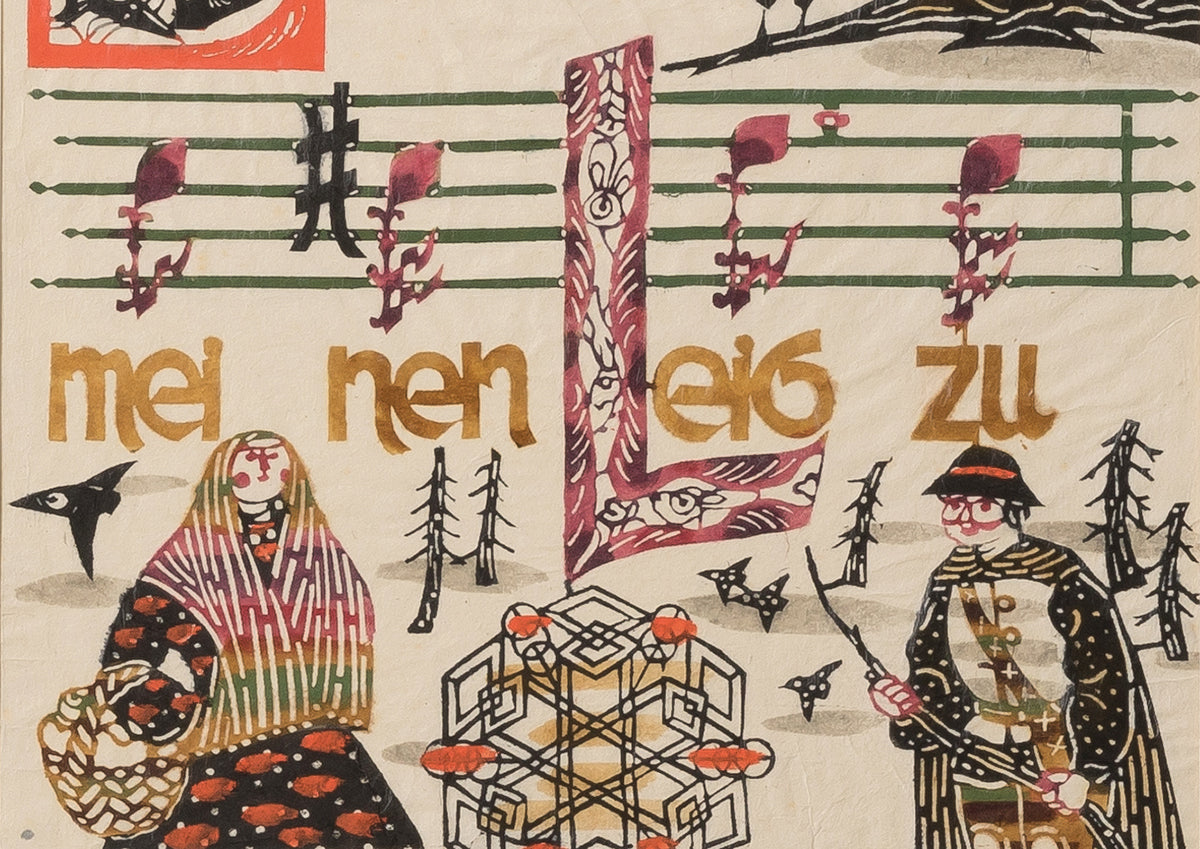 The stencil-dyed music score in this book features a crow and a traveller.In the West, crows "Connecting this world with the next" symbol, thatA song about a crow clinging to a traveller and not letting goThis scene truly symbolizes the darkness that Schubert's friends detested. If you look closely at the works of Tokujiro Kojima,The twelve stencil-dyed scores are all richly colorful and evocative of death.There is no sign of any gloomy scenes. Where have the graveyard crows, the ominous crows gone? Rather, they are depicted as "traveling crows" that travel with us.