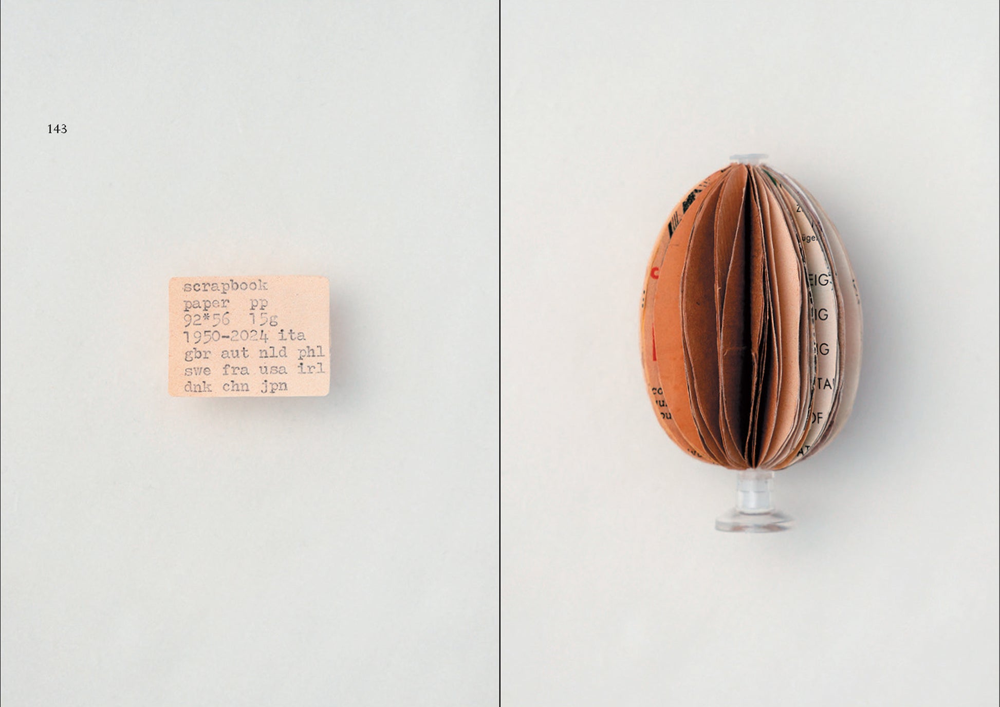 偶然、骨董市で見つけた「フォトカッター」という道具を使っています。証明写真などを切り抜くための機械で、角が丸く落ちるのが気に入って。そこにタイプライターで素材・寸法・重さ・国名などを打ち込んでいます。紙は古書の空白ページや包装紙の裏、薄くした段ボール、アルミホイルなど。どれも、その時手元にあったものでつくっています。