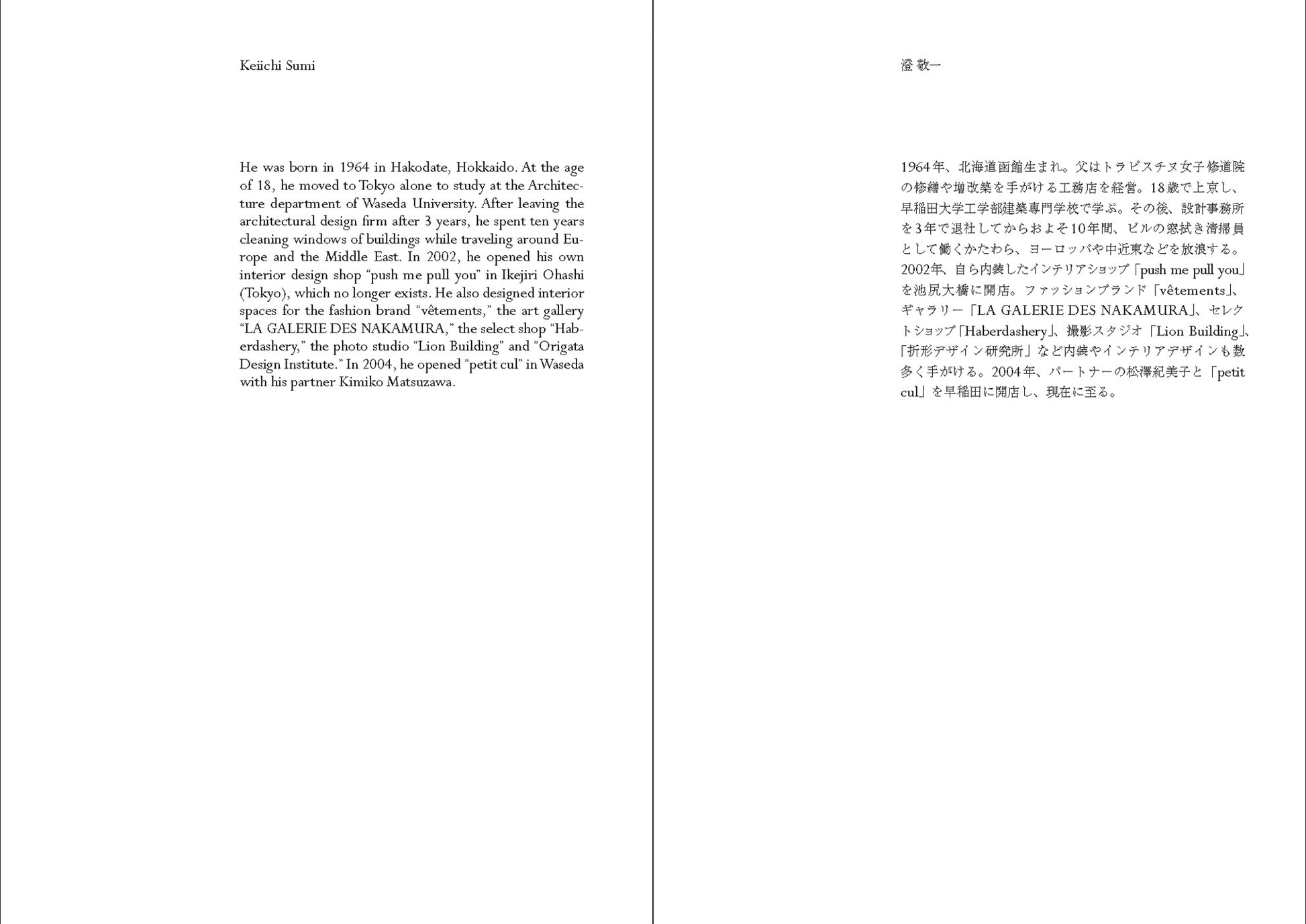 1964年、北海道函館生まれ。父はトラピスチヌ女子修道院の修繕や増改築を手がける工務店を経営していた。18歳で上京し、早稲田大学工学部建築専門学校で学ぶ。その後、設計事務所を3年で退社。それからおよそ10年間、ビルの窓拭き清掃員として働きながら、ヨーロッパや中近東などを放浪する。2002年、自ら内装したインテリアショップ「push me pullyou」を池尻大橋に開店。ファッションブランド「vêtements」、ギャラリー「LA GALERIE DES NAKAMURA」、セレクトショップ「Haberdashery」、撮影スタジオ「Lion Building」、「折形デザイン研究所」など数多くの内装やインテリアデザインを手がける。2004年、パートナーの松澤紀美子と「petitcul」を早稲田に開店し、現在に至る。