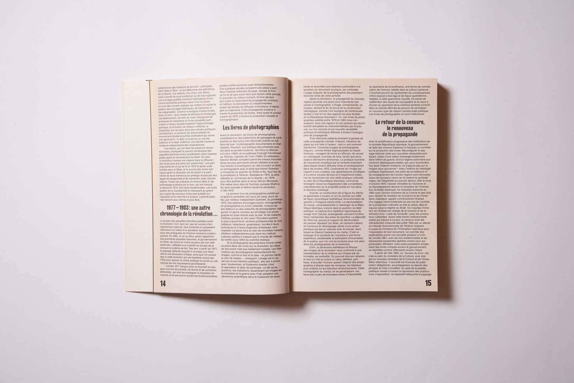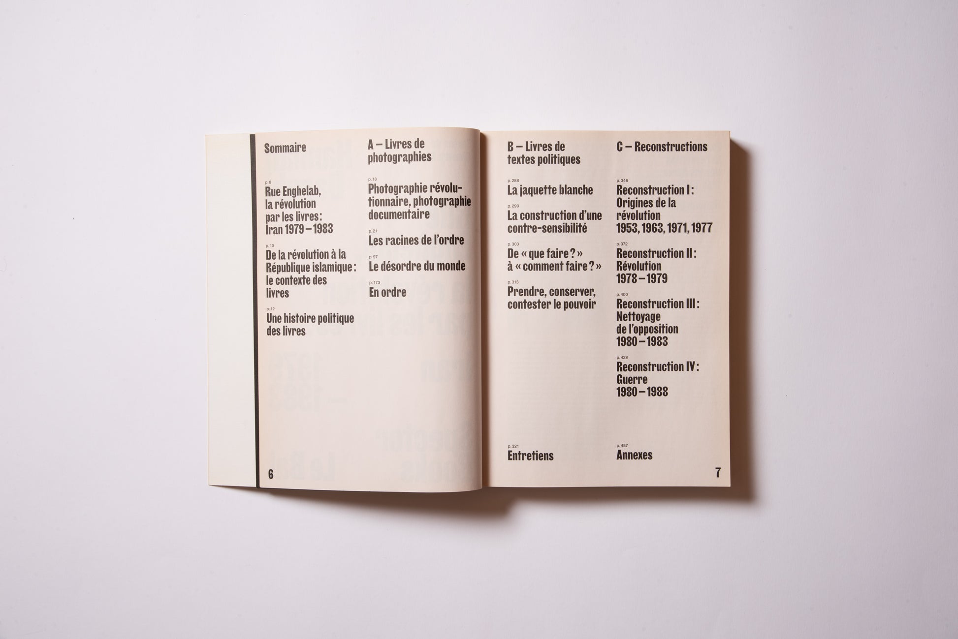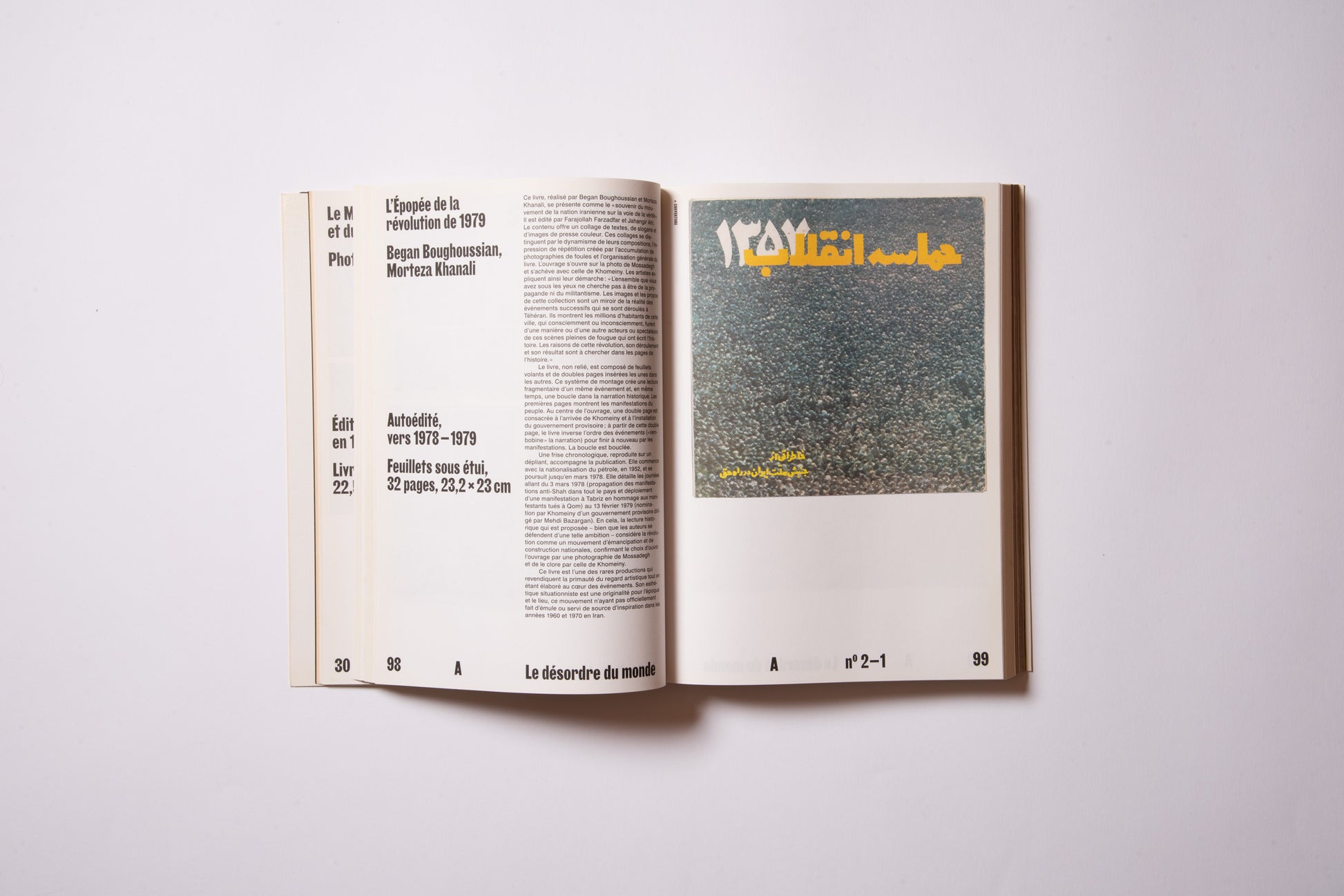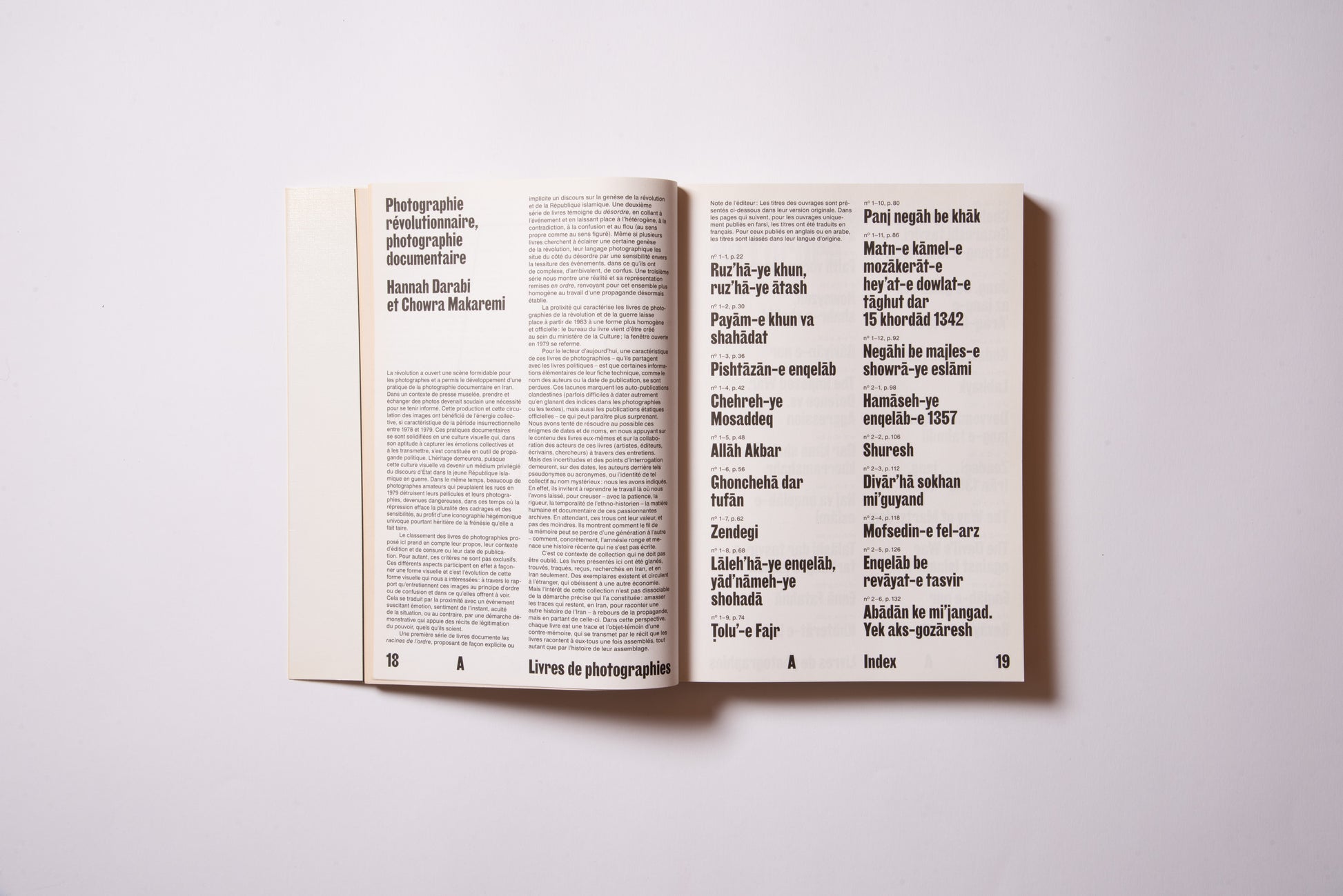 The publication was prompted by the exhibition of the same name, Hannah Darabi, Enghelab Street, A Revolution through Books: Iran 1979–1983, which was held at LE BAL in Paris from January 9 to February 11, 2019, and was supported by grants from the French National Center for Art and Design (CNAP) and the European Research Centre (ERC).