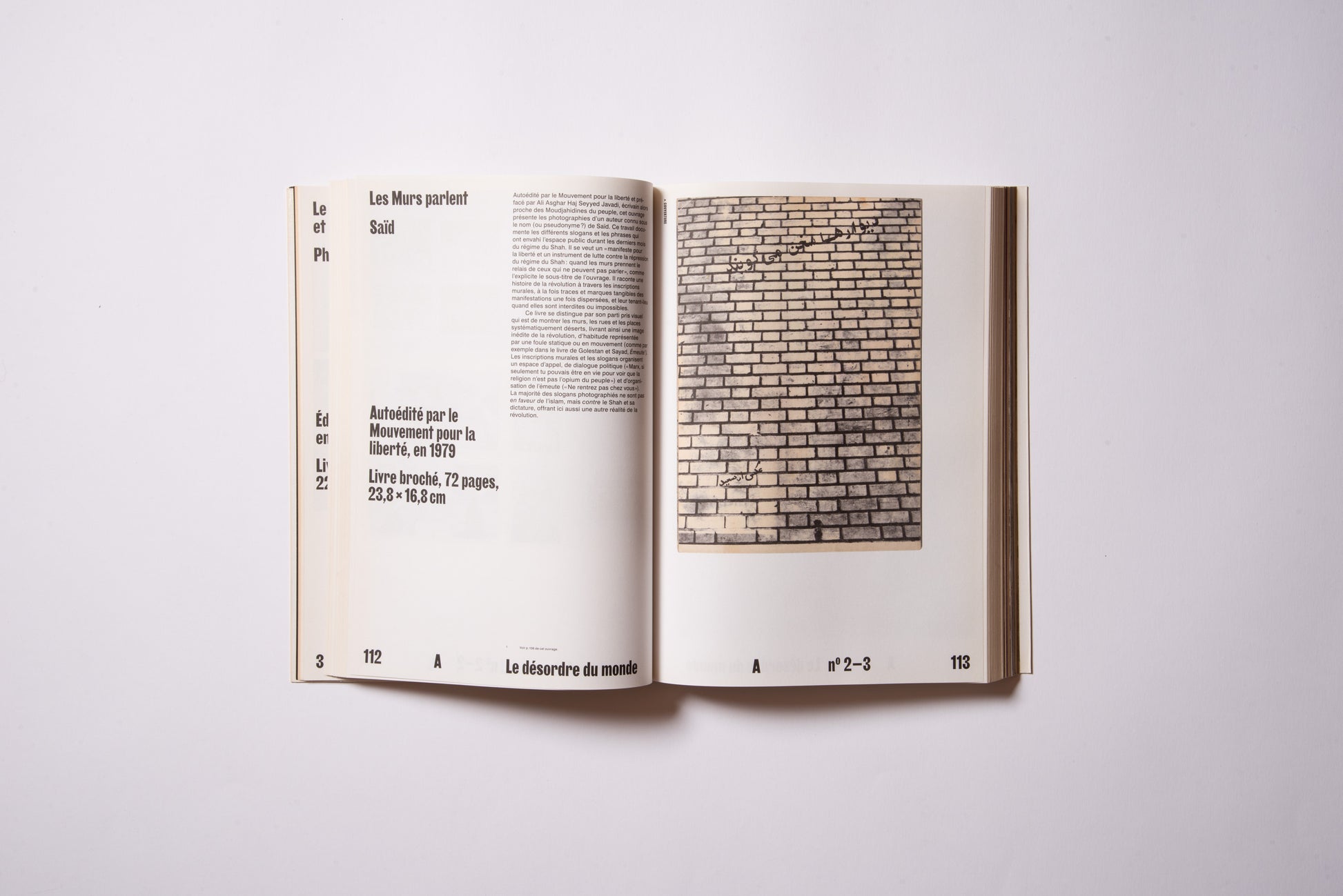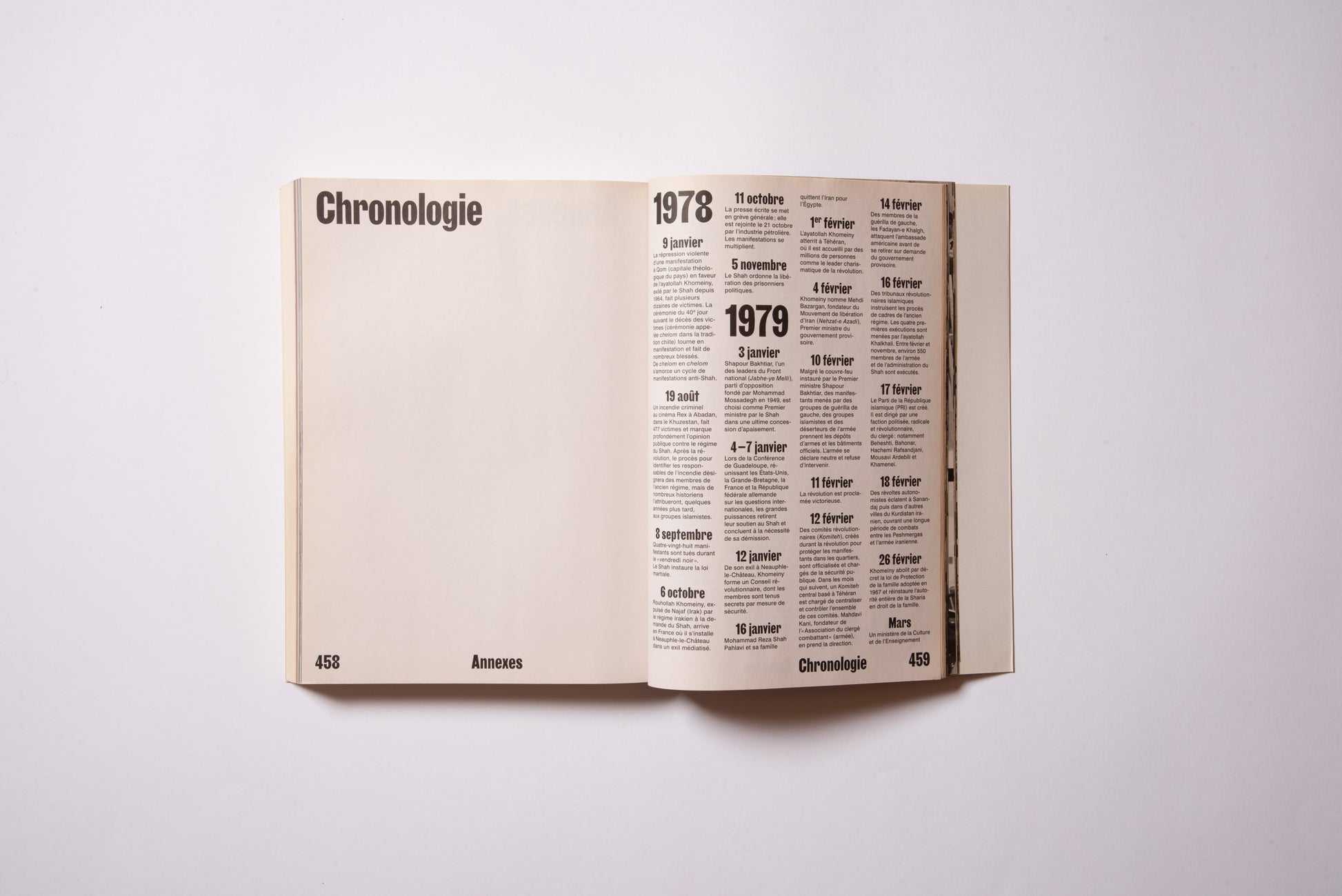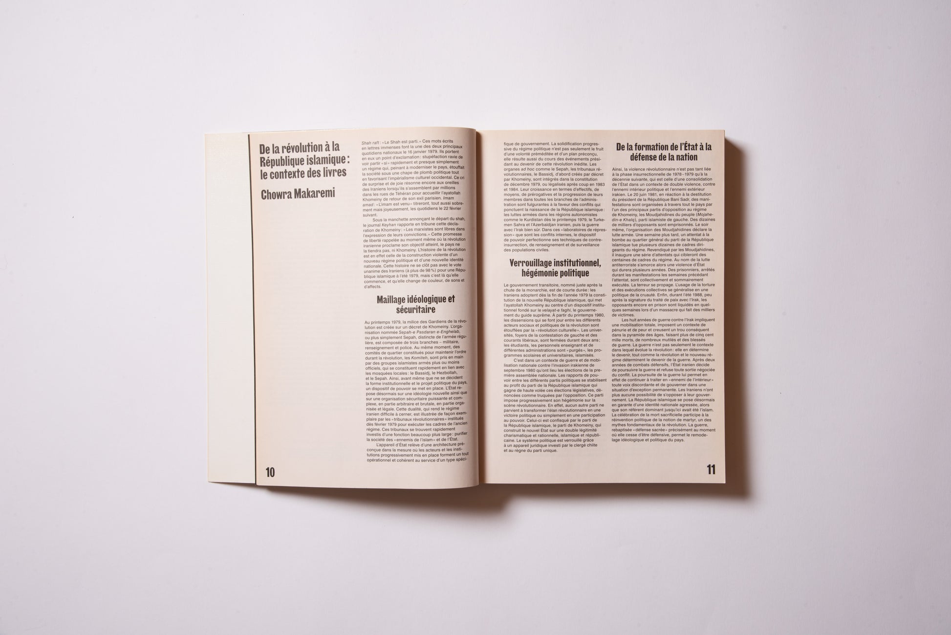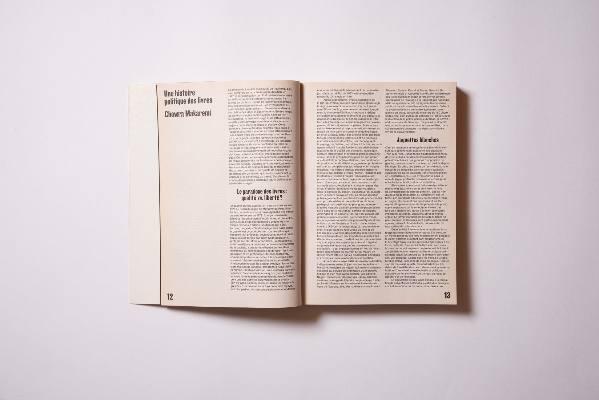 The publication was prompted by the exhibition of the same name, Hannah Darabi, Enghelab Street, A Revolution through Books: Iran 1979–1983, which was held at LE BAL in Paris from January 9 to February 11, 2019, and was supported by grants from the French National Center for Art and Design (CNAP) and the European Research Centre (ERC).