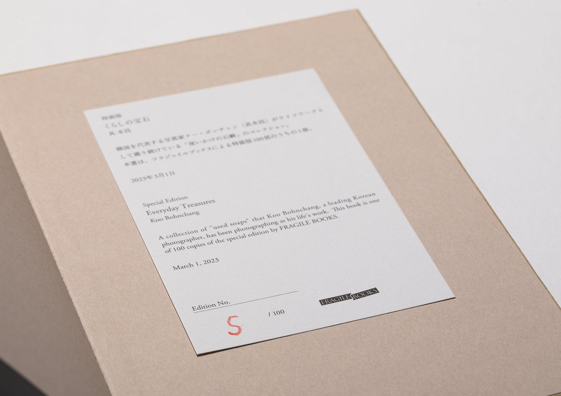 The cover of the special edition is made of thick paper, matte gray with small colored grains visible and hidden, reminiscent of colorful soaps. The custom paper box that holds the book has a different soap photo pasted in the middle of the lid. All special edition books are personally signed by Koo Bohnchang.