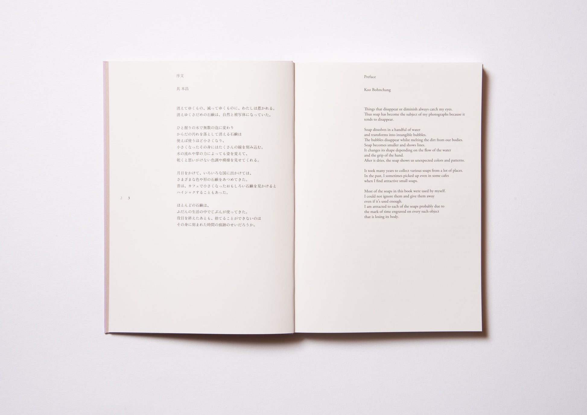 This book is a collection of “used soaps” photographed as his life's work by Koo Bohnchang, a leading Korean photographer. 112 pages of the book include 52 photographs and a preface by the author and the book's designer, Nobuhiro Yamaguchi. The 112-page text includes 52 photographic images and a preface by the author and the book's designer, Nobuhiro Yamaguchi. At the end of the book, there is an introduction by the author and the book's designer, Nobuhiro Yamaguchi,