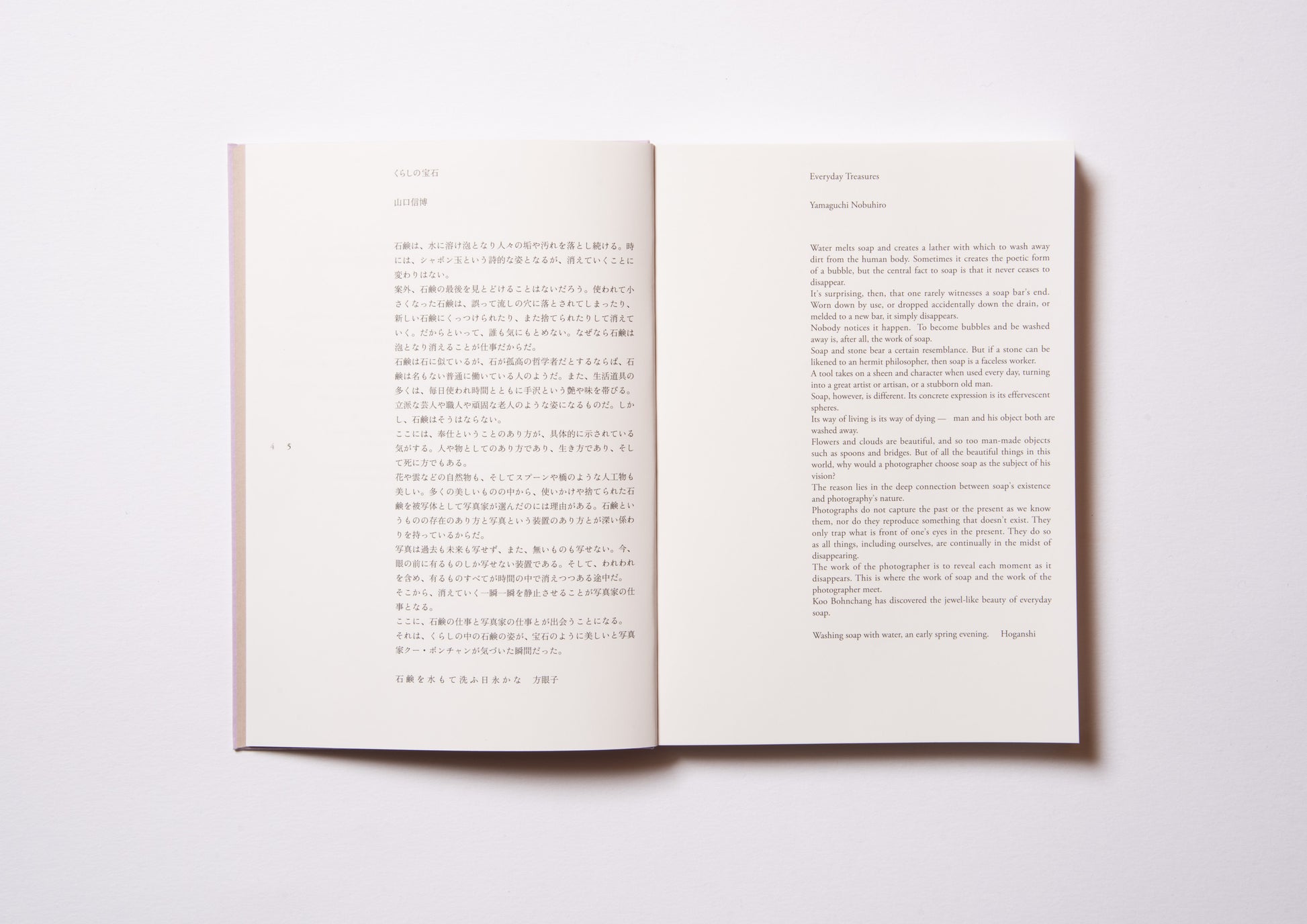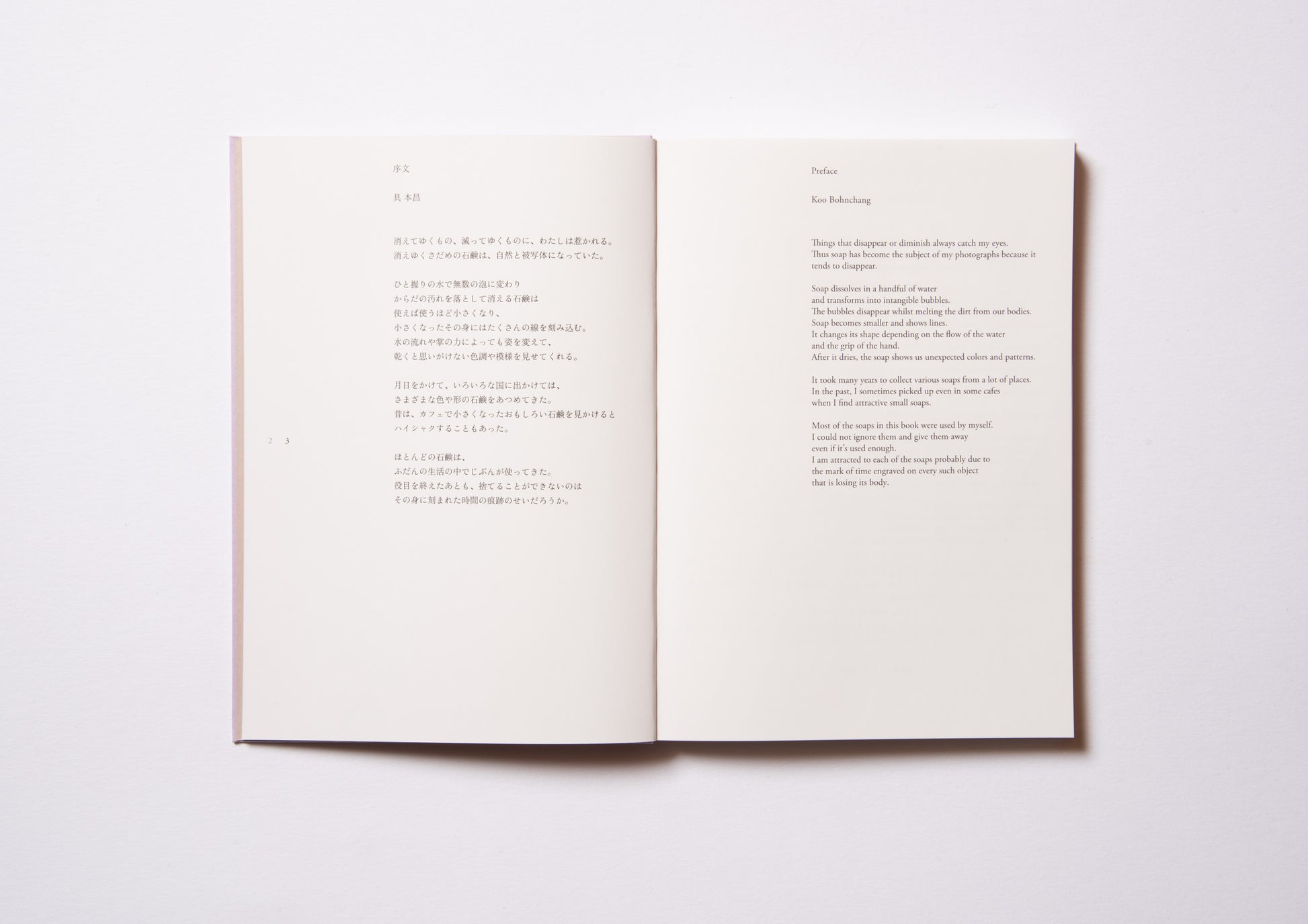 A collection of "half-used soap" photographed by Korea's leading photographer Koo Bon-chan as his life's work. For the first time in 16 years, the book has been republished with a new look and with major changes to the photos and structure. The 112-page text includes 52 photographic images and a preface by the author and the book's designer, Yamaguchi Nobuhiro. At the end of the book,Includes a chronology of photographer Koo Bonchan.