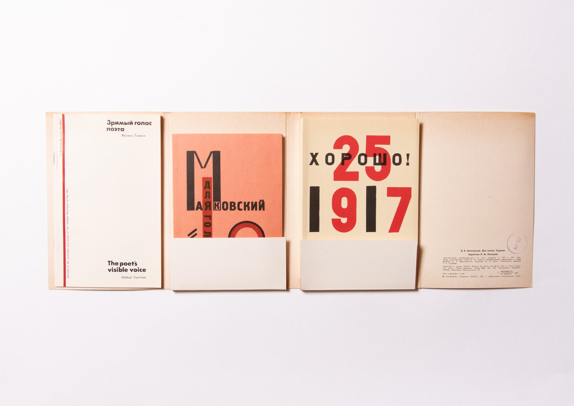 This three-volume set includes facsimile versions of the originals of "Dlja golosa/For the Voice" and "Khorosho! Oktyabrskaya poema/Good! October poem," a collaboration between the Russian Futurist poet Mayakovsky and the artist El Lissitzky, as well as an explanatory essay by art historian Mikhail Yurievich German entitled "The Visible Voice of the Poet" (in Russian/in English).