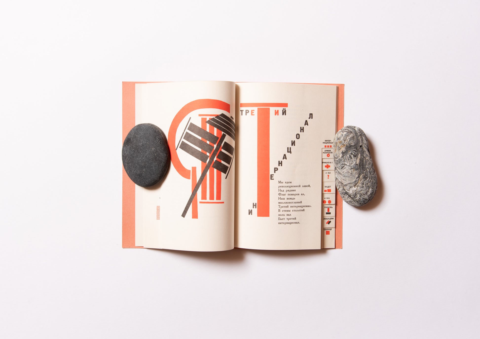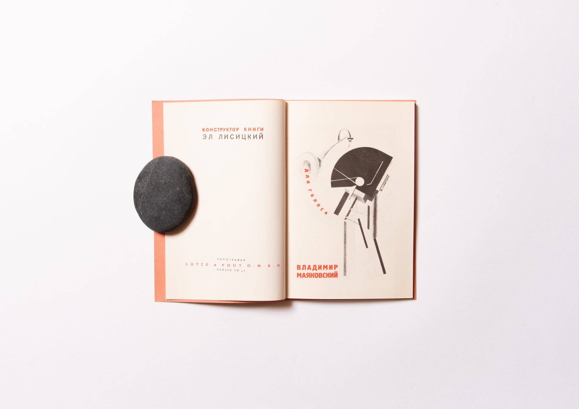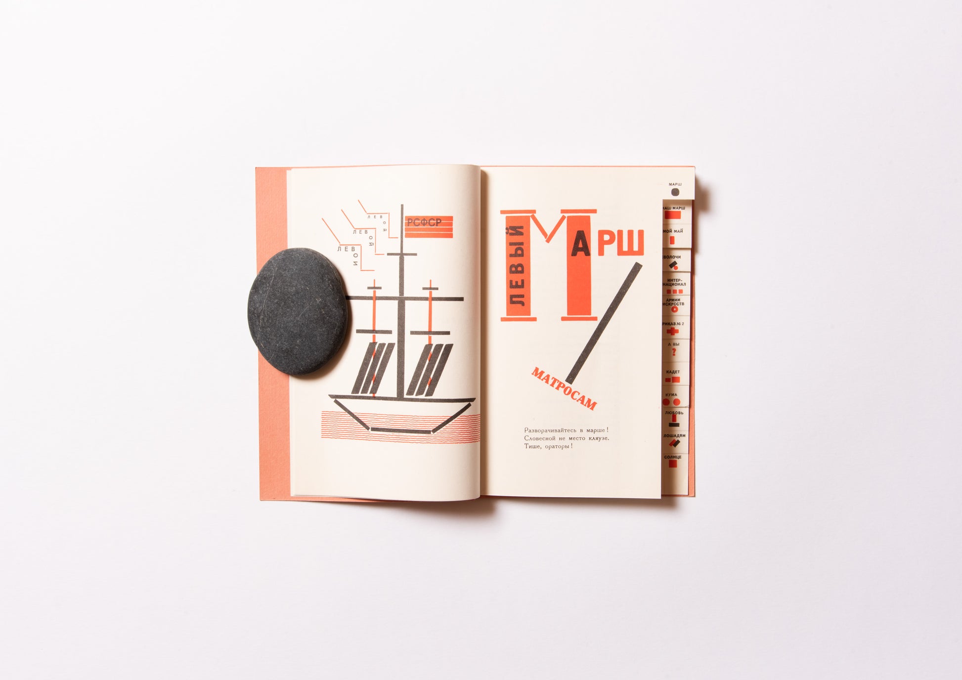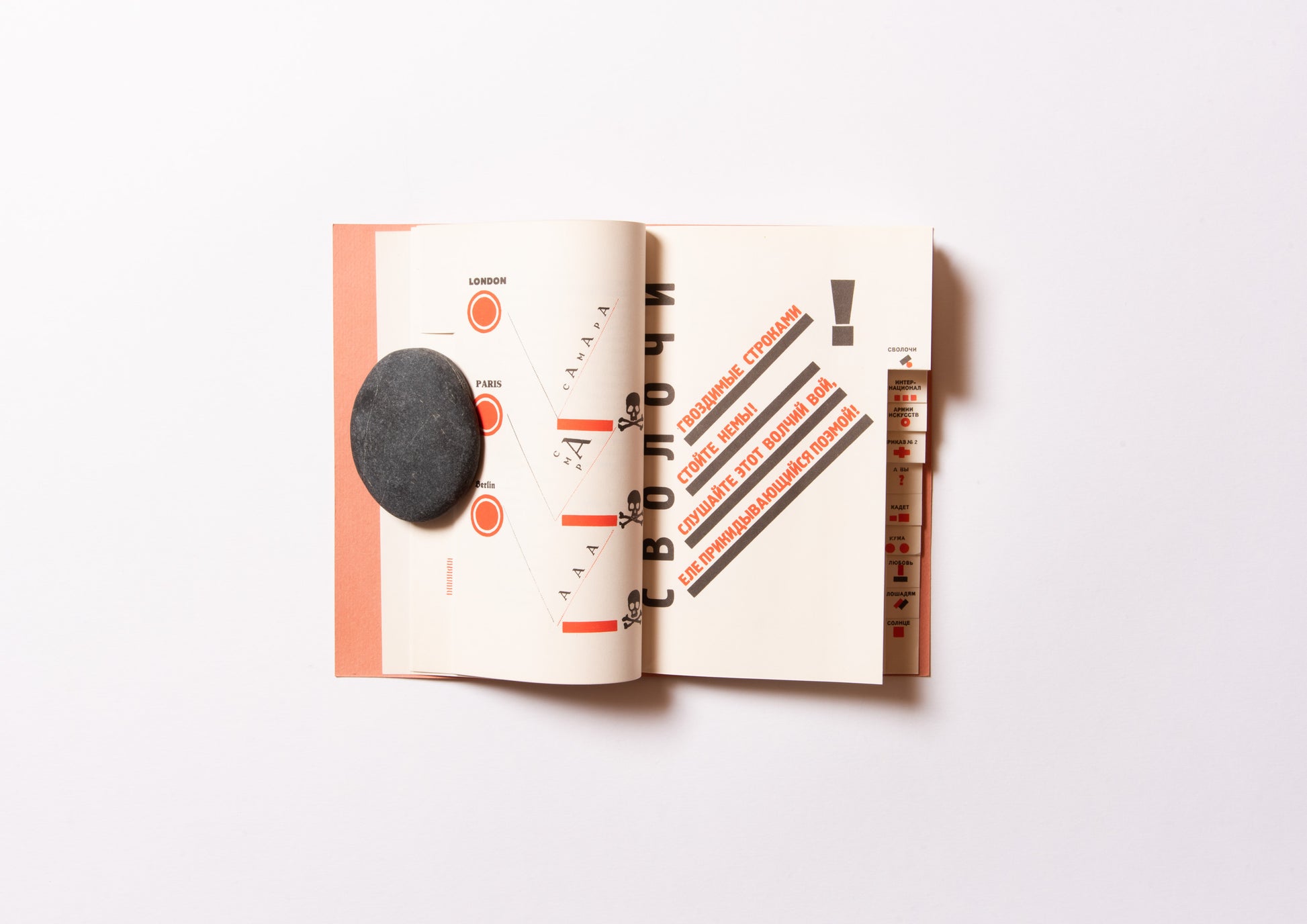 It was published in 1987, just before the collapse of the Soviet Union, to commemorate the 70th anniversary of the October Revolution, which marked the first time in human history that the country left capitalism and embarked on the path to socialism. The book is designed to store the two volumes mentioned above in an inner pocket that opens on both sides. It also retains the nail-hook index that was (supposedly) the first in the world to be designed by Lissitzky for Dlja golosa/For the Voice. Based on 13 poems by Mayakovsky,An innovative attempt at book design that treats poetry and typography equallyAccording to Lissitzky, the aim of the binding design was to create a "book to be read out loud".
