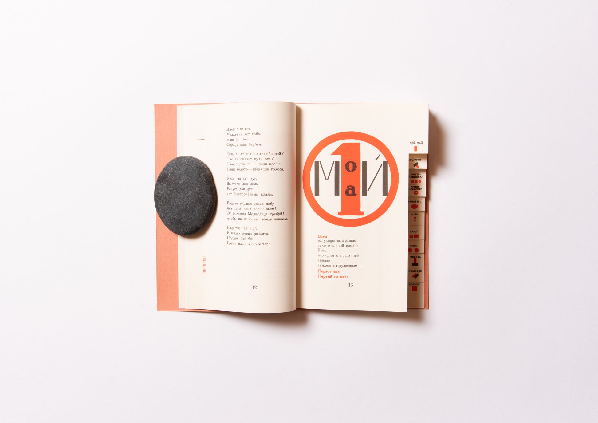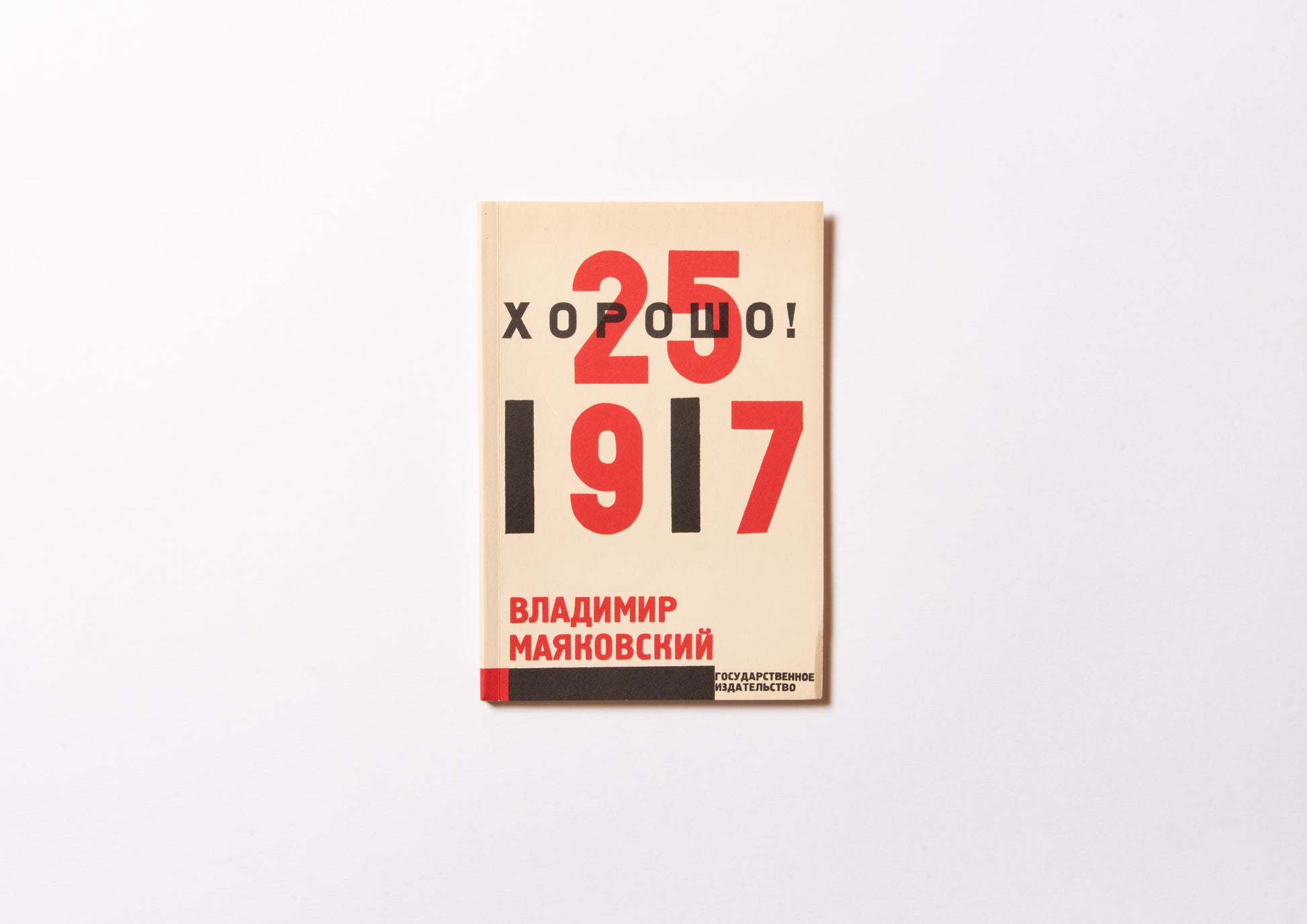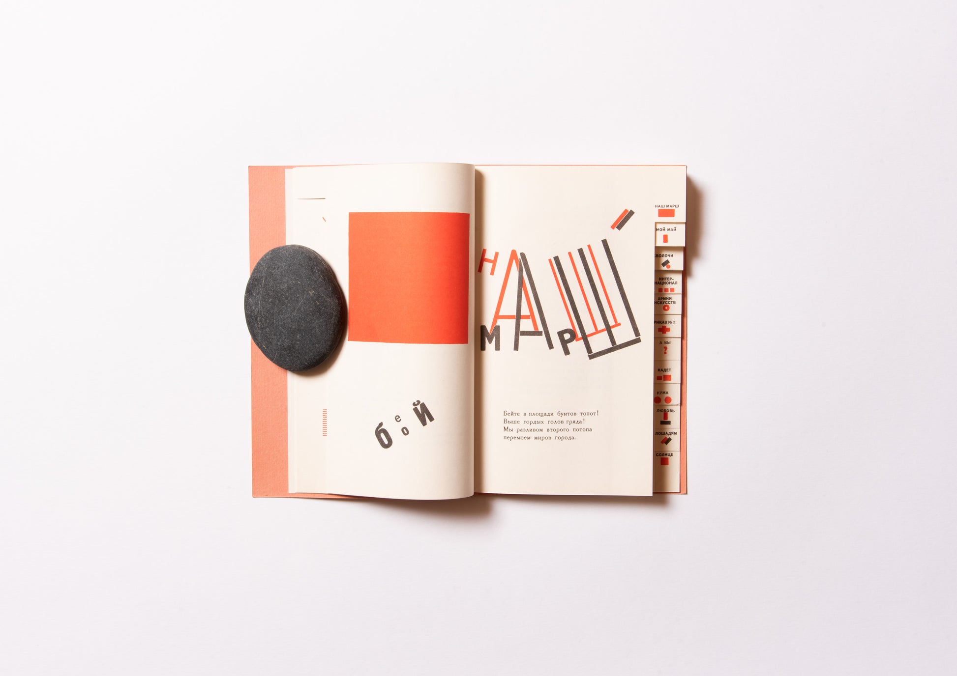 It was published in 1987, just before the collapse of the Soviet Union, to commemorate the 70th anniversary of the October Revolution, which marked the first time in human history that the country left capitalism and embarked on the path to socialism. The book is designed to store the two volumes mentioned above in an inner pocket that opens on both sides. It also retains the nail-hook index that was (supposedly) the first in the world to be designed by Lissitzky for Dlja golosa/For the Voice. Based on 13 poems by Mayakovsky,An innovative attempt at book design that treats poetry and typography equallyAccording to Lissitzky, the aim of the binding design was to create a "book to be read out loud".