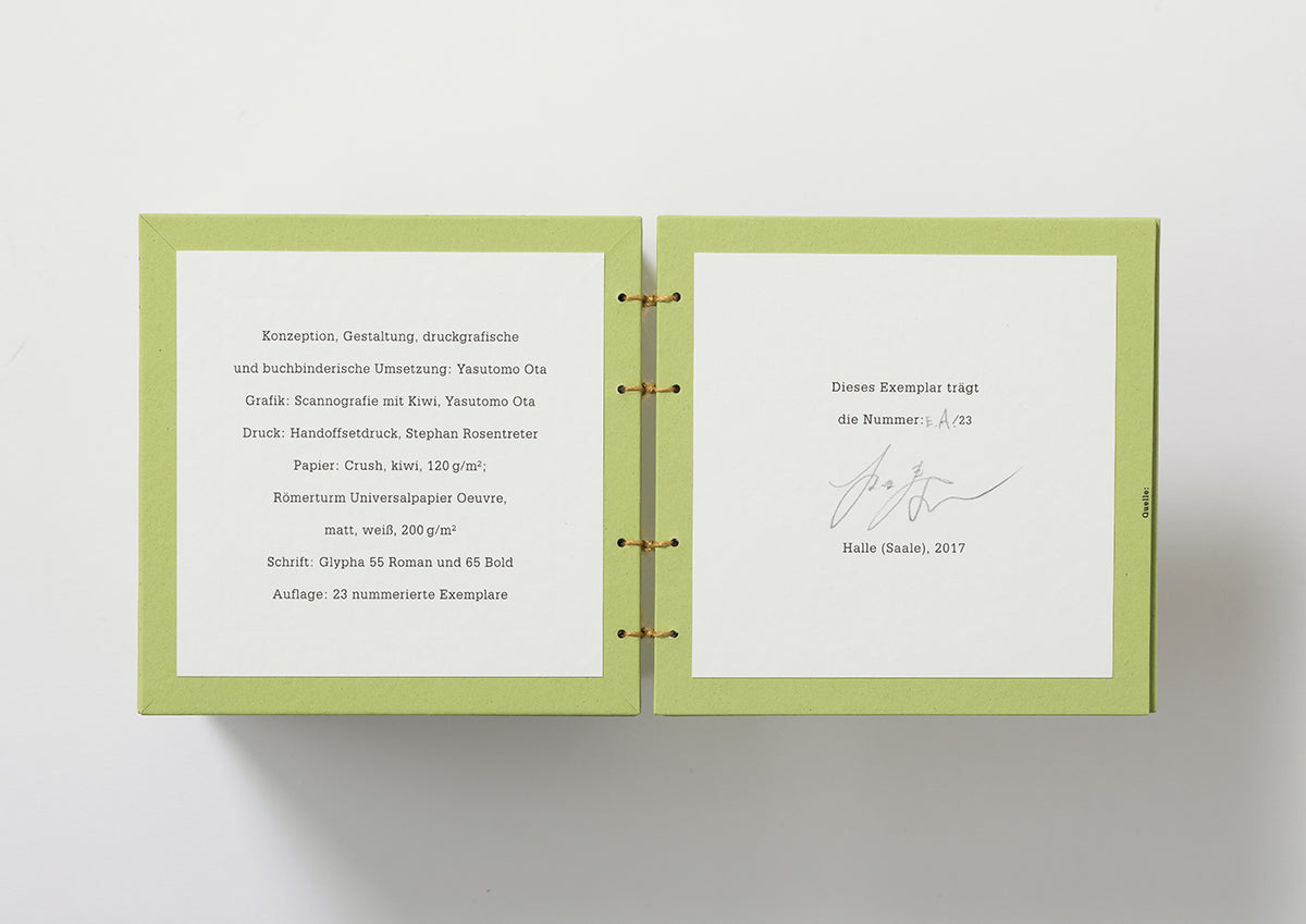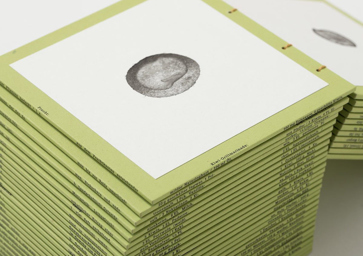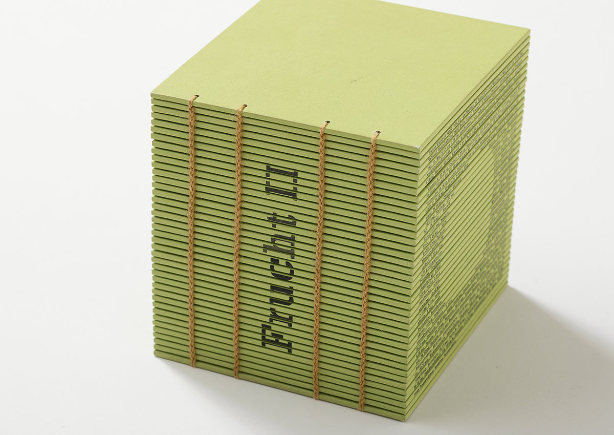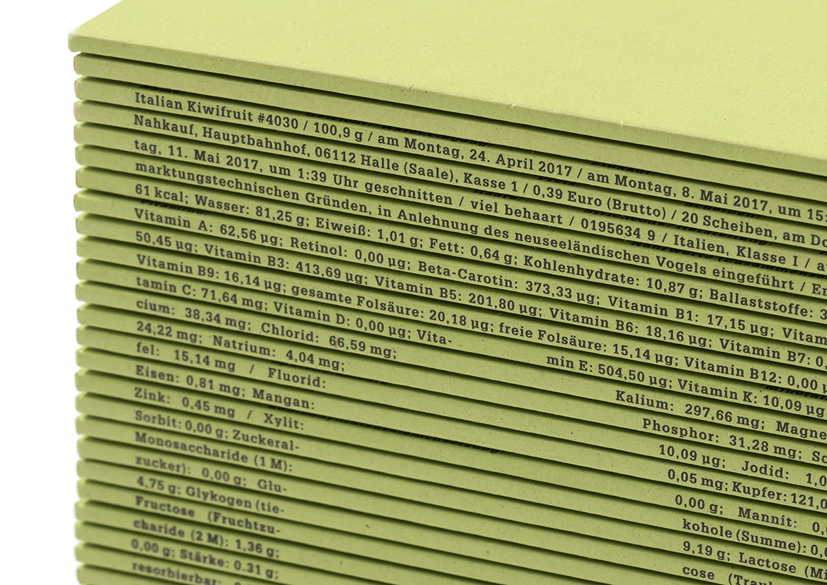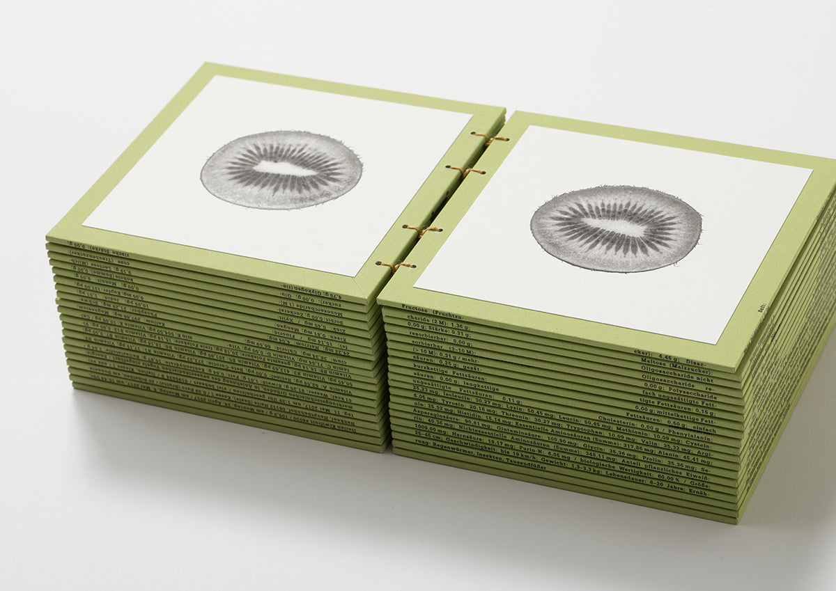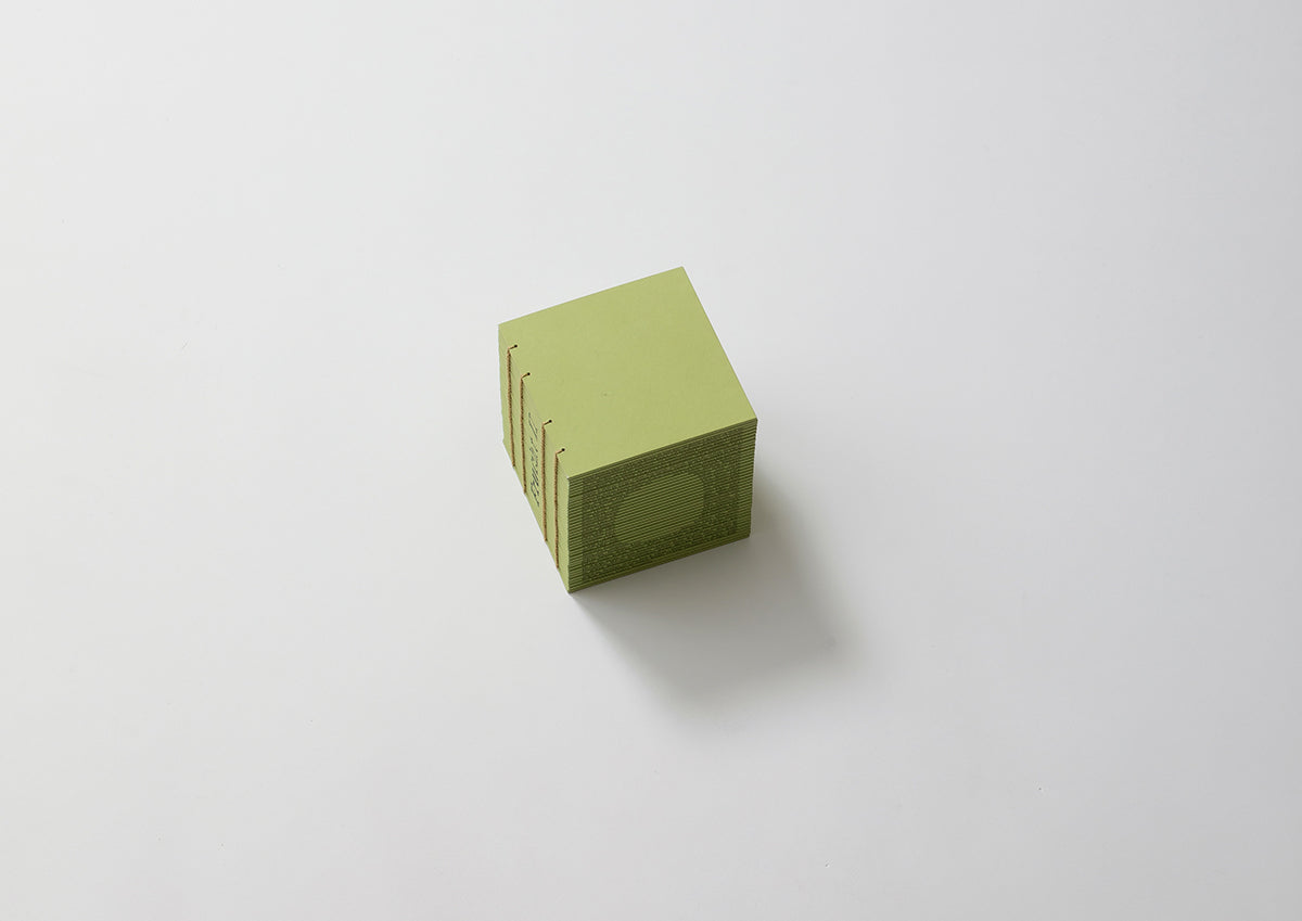 The dull, light green cube contains a whole kiwi fruit. The outline of the kiwi fruit that appears on three edges is a reflection of the outline of the kiwi fruit itself, which the artist purchased himself and sliced into 2mm pieces. Upon closer inspection, the outline is highlighted by German text written just 2mm wide. Each side is inscribed with information about the fruit, an overview of the kiwi fruit, and recipes using kiwi fruit. When you open the page, a cross section of a kiwi fruit sliced to the same thickness as the paper (2mm) appears, and the diameter changes slightly as you turn the page.