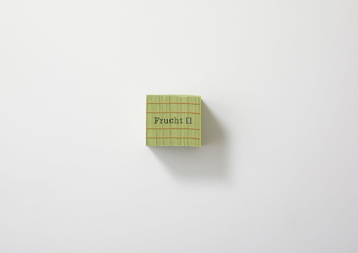 "Frucht II" is a work that brings to fruition the duality of the intuitive action of transferring something other than a book into a book, and the visual effect of the piled-up thin layers evoking the image of a book as an object.