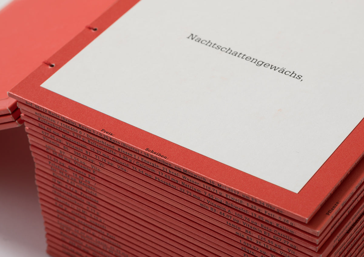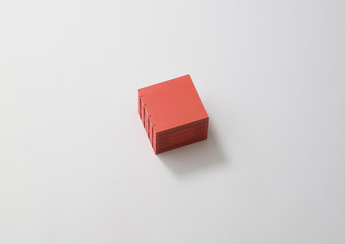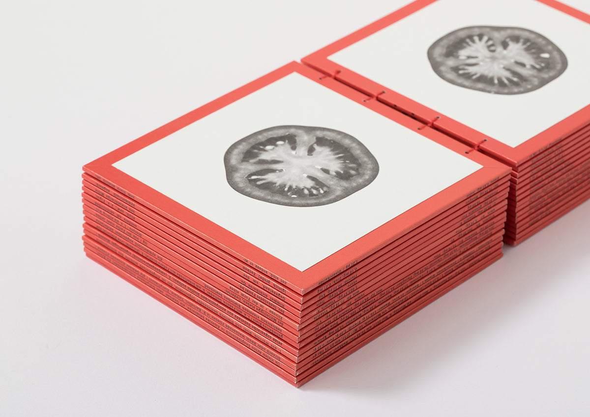 The tomato-coloured cube contains a whole tomato. The outline of the tomato that appears on three edges is a projection of the actual tomato, which the artist purchased himself and sliced into 2mm pieces. Upon closer inspection, the outline is highlighted by German characters written just 2mm wide. Each side contains information about the tomato, an overview of the tomato, and a recipe that uses the tomato. When you open the pages, the cross-section of a tomato sliced to the same thickness as the paper (2mm) appears, and the diameter changes slightly as you turn the page.