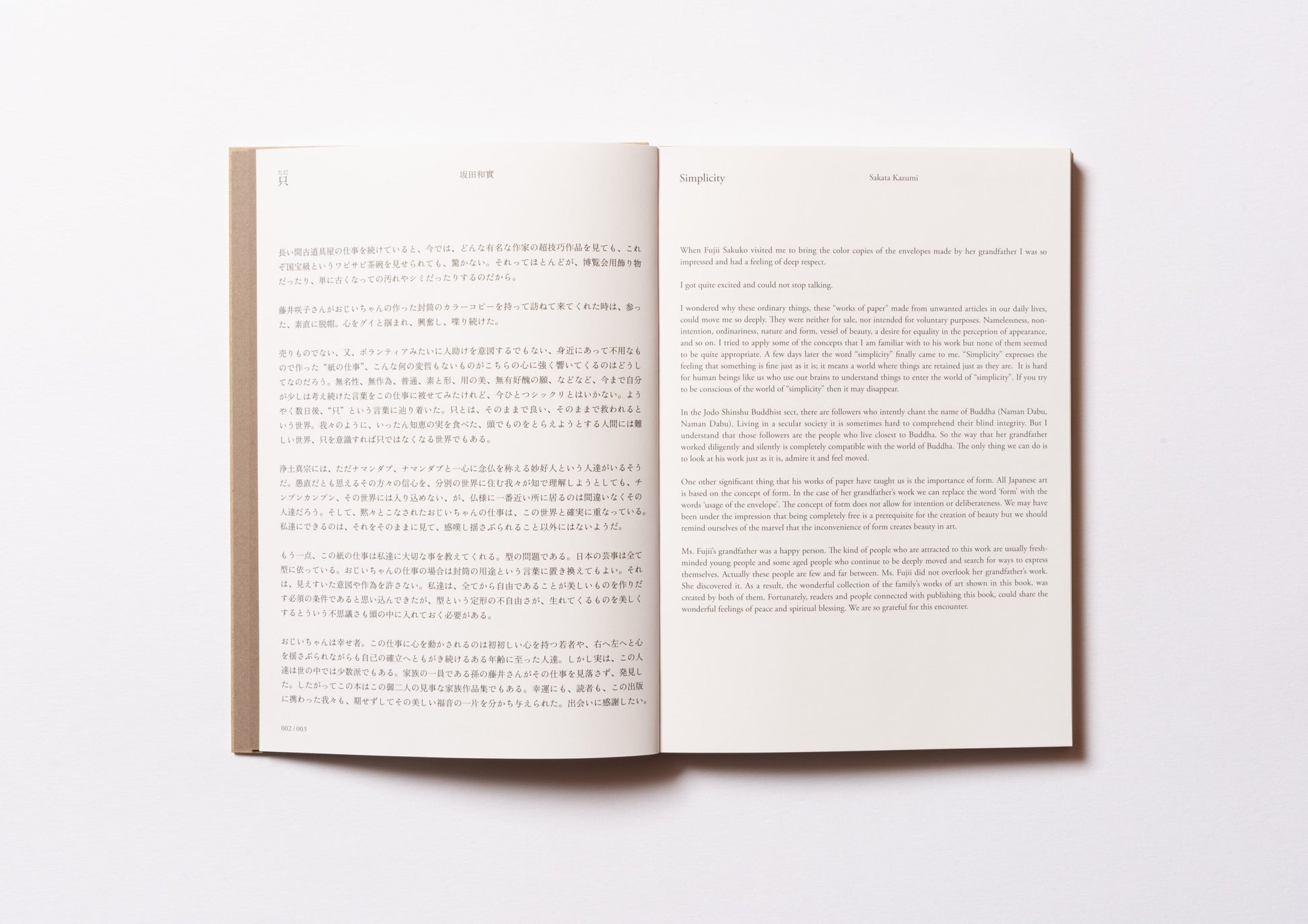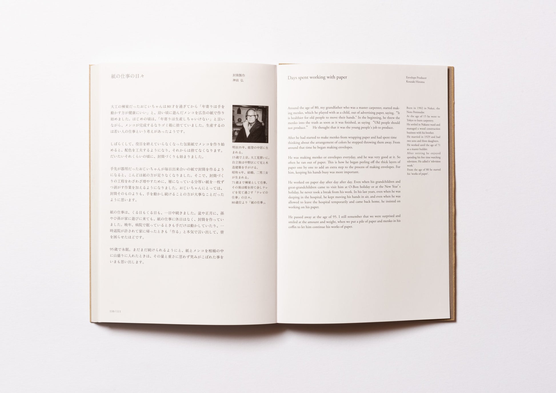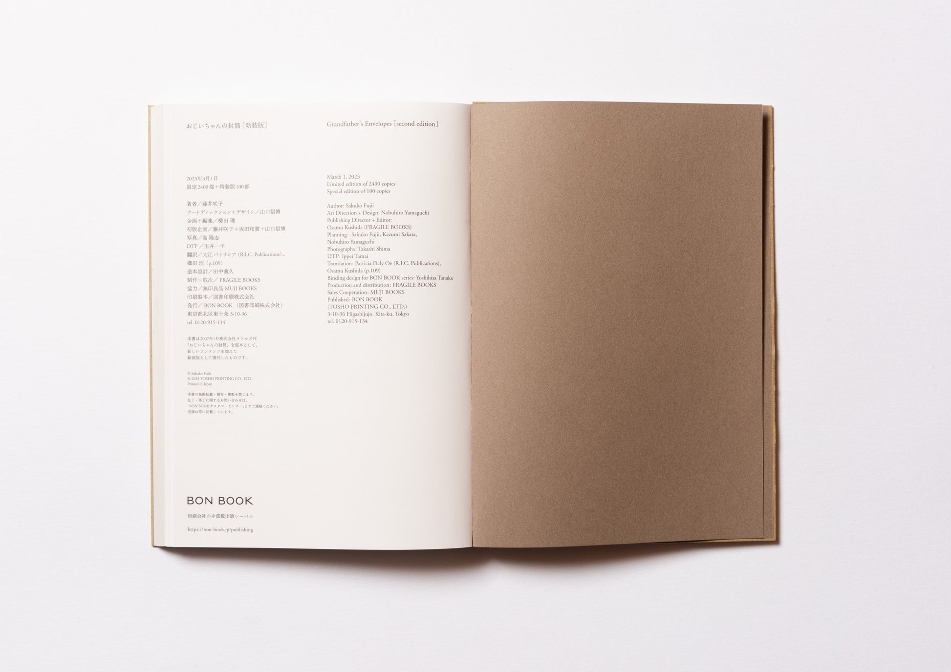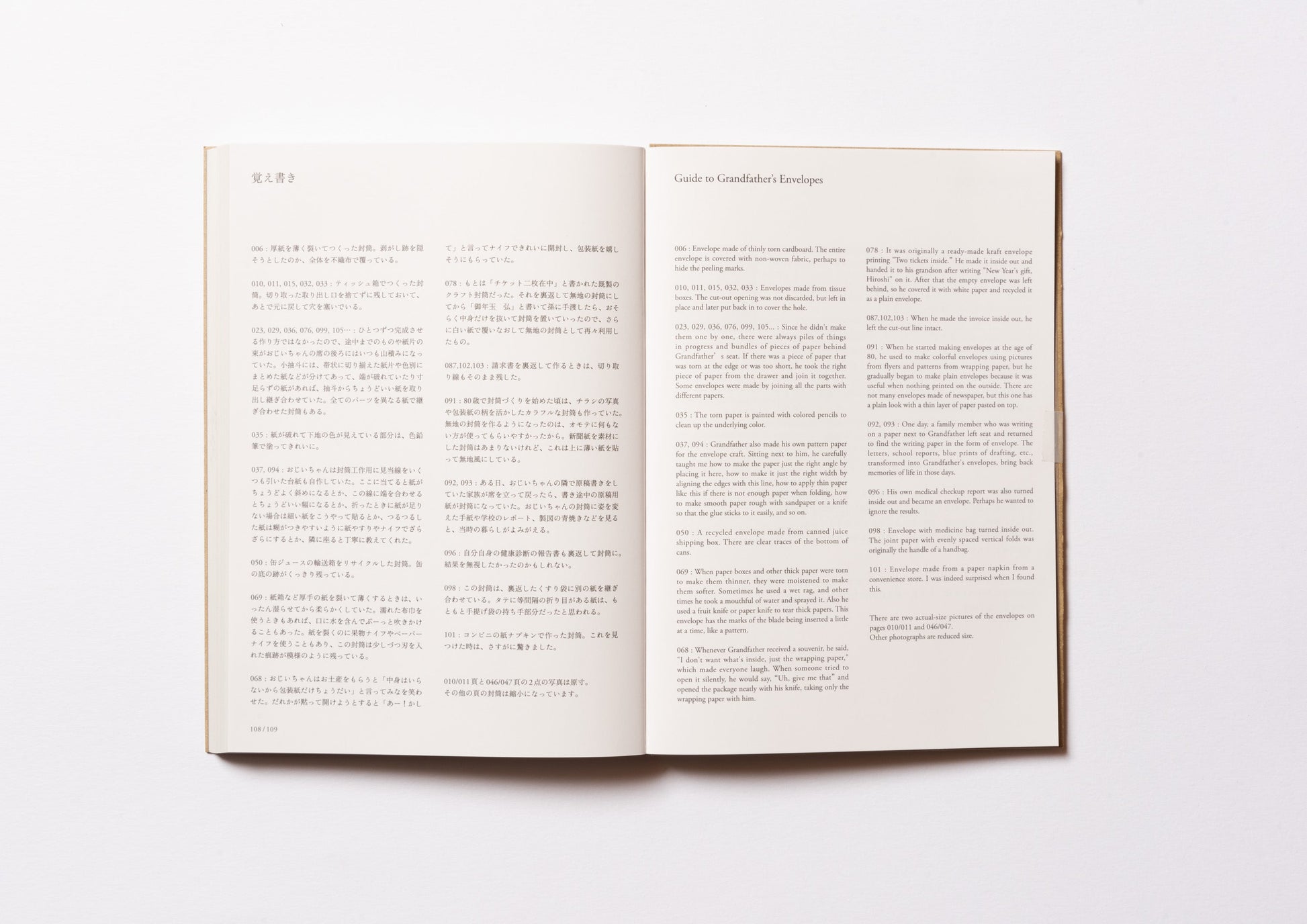 The first edition published by Rutles in 2007 is reprinted as a second edition with the addition of "Guide to Grandfather's Envelopes" which is Memorandums by the author. ラトルズから2007年に刊行された初版に「覚え書き」を加えた新装版 / Translation by Patricia Daly Oe (R.I.C. Publications) 大江パトリシア, Osamu Kushida 櫛田 理 (p.109) / Book Design by Yoshihisa Tanaka 田中義久 / Sales Cooperation by 無印良品 MUJI BOOKS / Printing and Binding by TOSHO PRINTING CO., LTD. 図書印刷株式会社