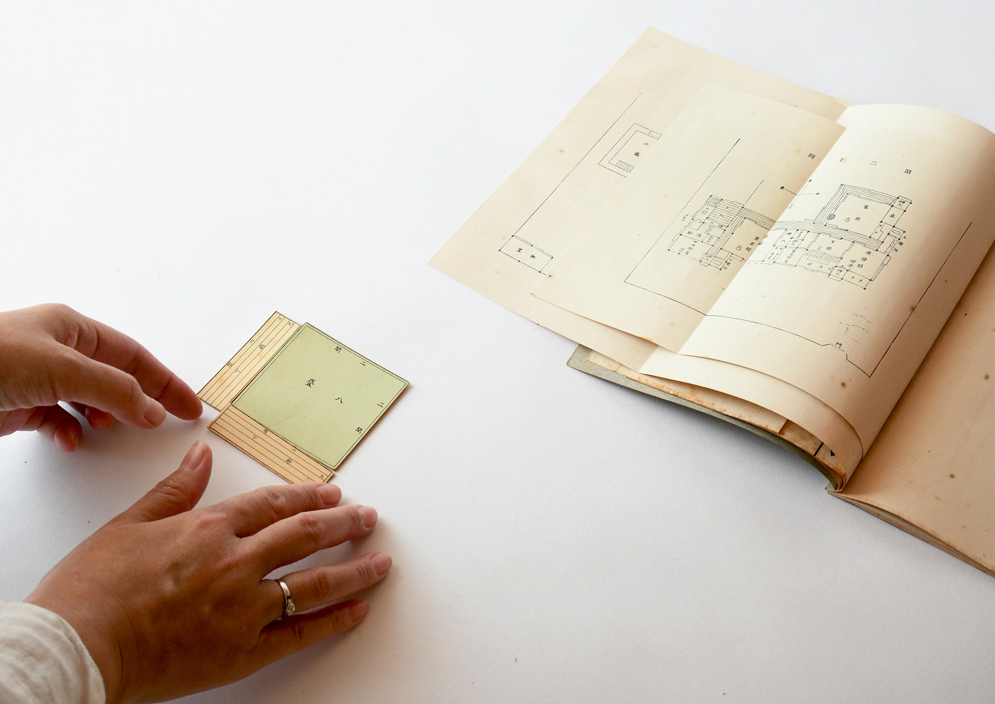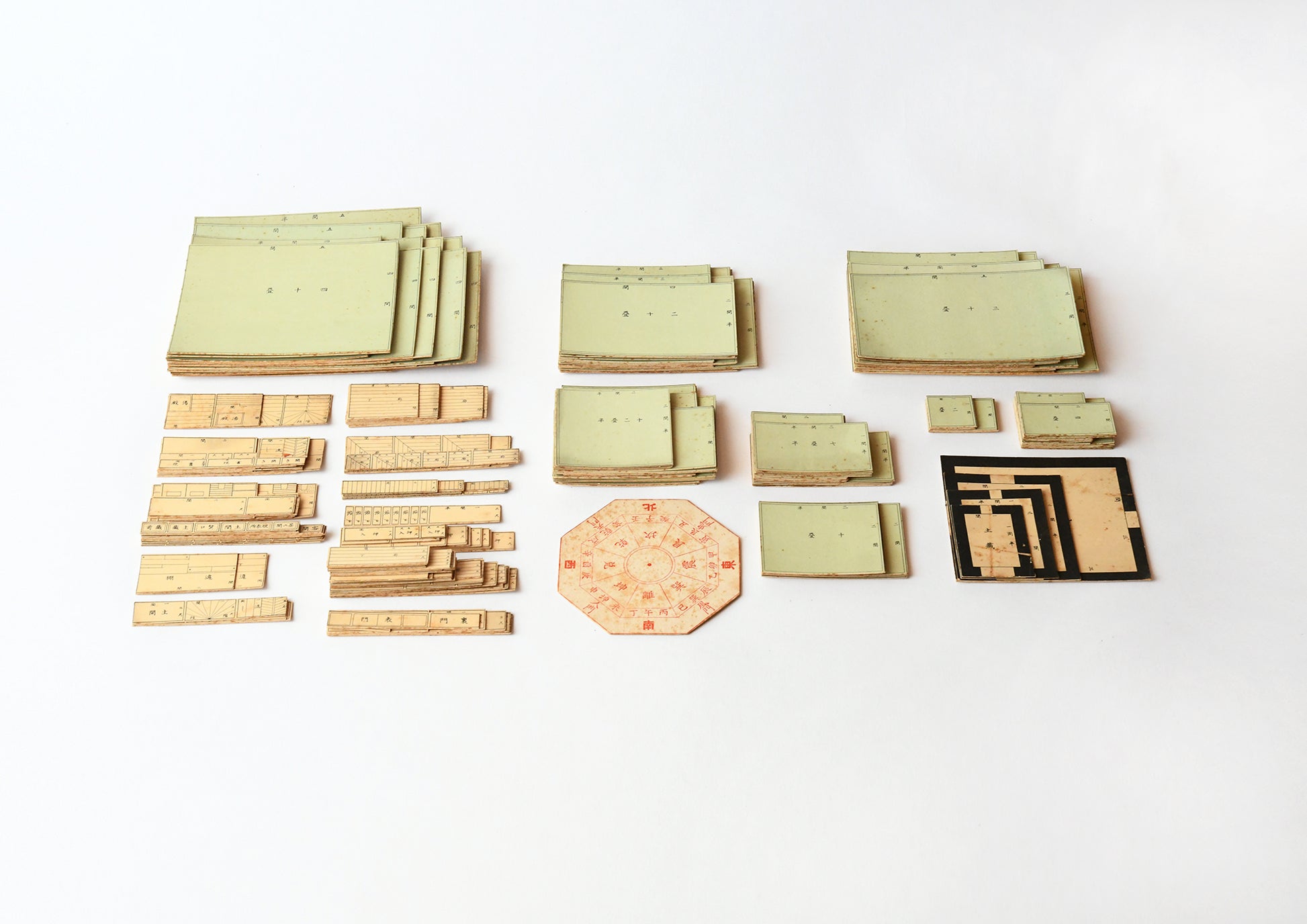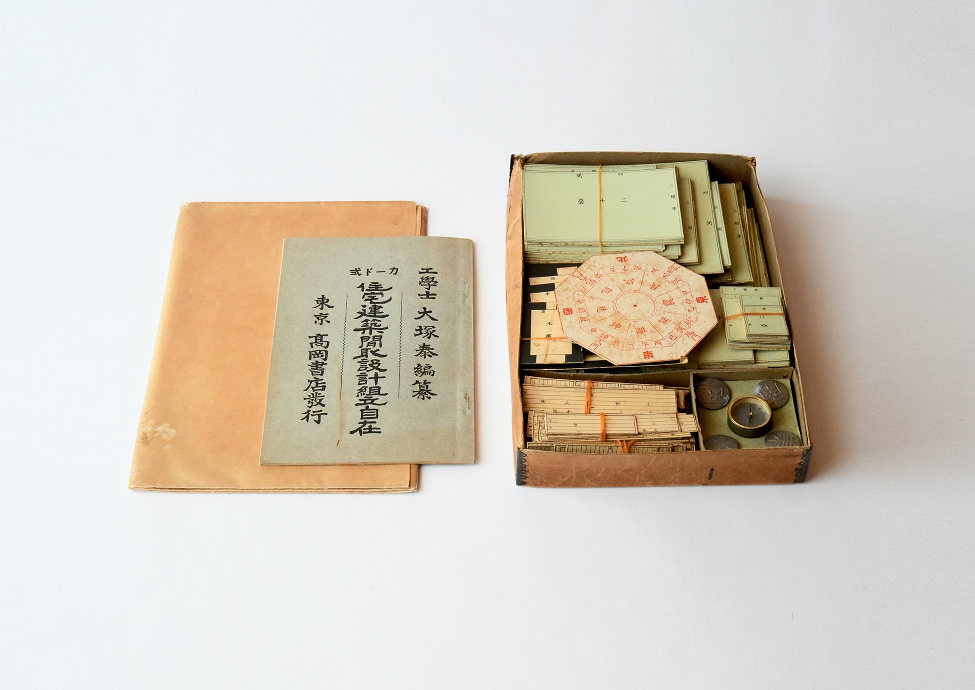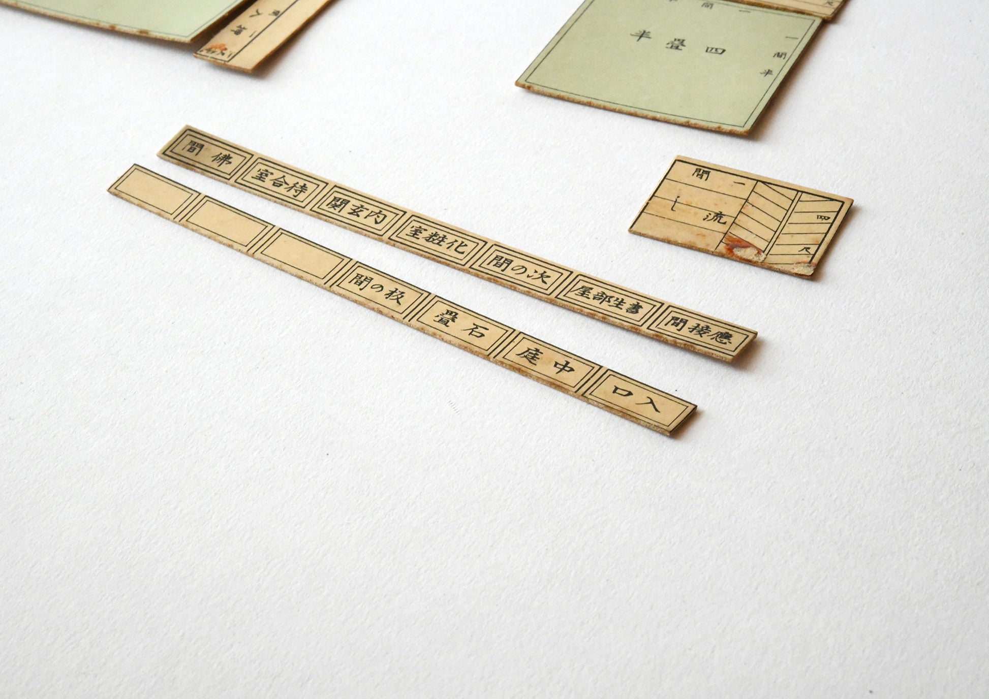 1畳から60.5畳まで面積別畳部屋、1間半から3間半までの土蔵、廊下、階段、湯殿、押入れ、門、戸袋、床(床の間)、違い棚、書院など、パーツ別カード点数170点超・全点厚紙製。マス目入り坪割図台紙、方位図、方位磁石、東西南北を示す鋲4点(畳用)、使用方法と間取りの基本知識をまとめた25Pの小冊子付き。