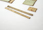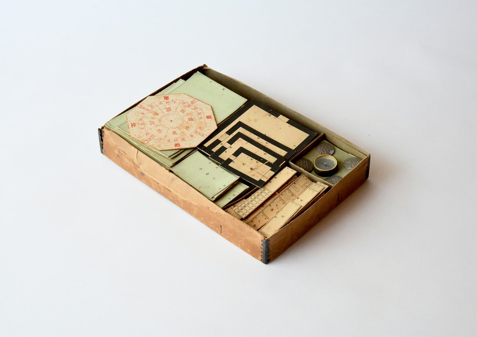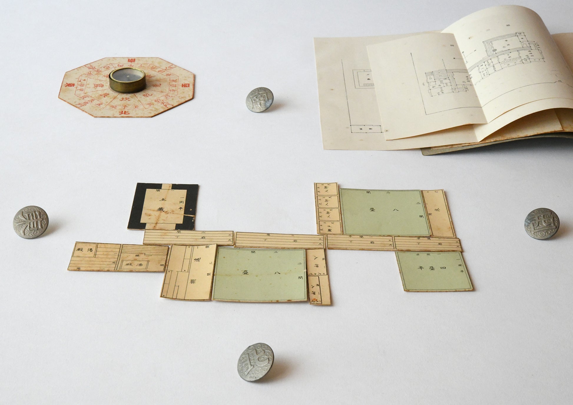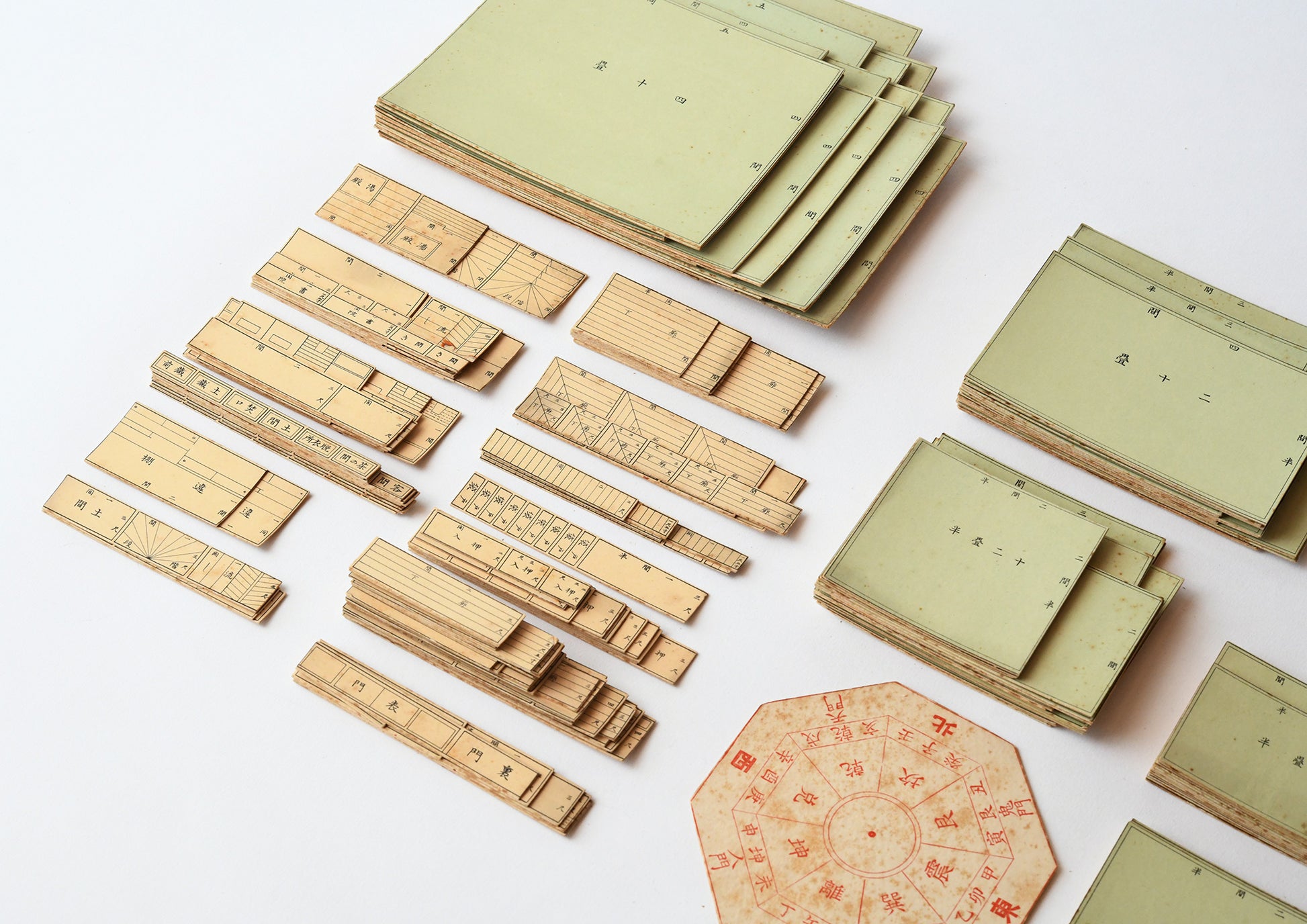 1畳から60.5畳まで面積別畳部屋、1間半から3間半までの土蔵、廊下、階段、湯殿、押入れ、門、戸袋、床(床の間)、違い棚、書院など、パーツ別カード点数170点超・全点厚紙製。マス目入り坪割図台紙、方位図、方位磁石、東西南北を示す鋲4点(畳用)、使用方法と間取りの基本知識をまとめた25Pの小冊子付き。