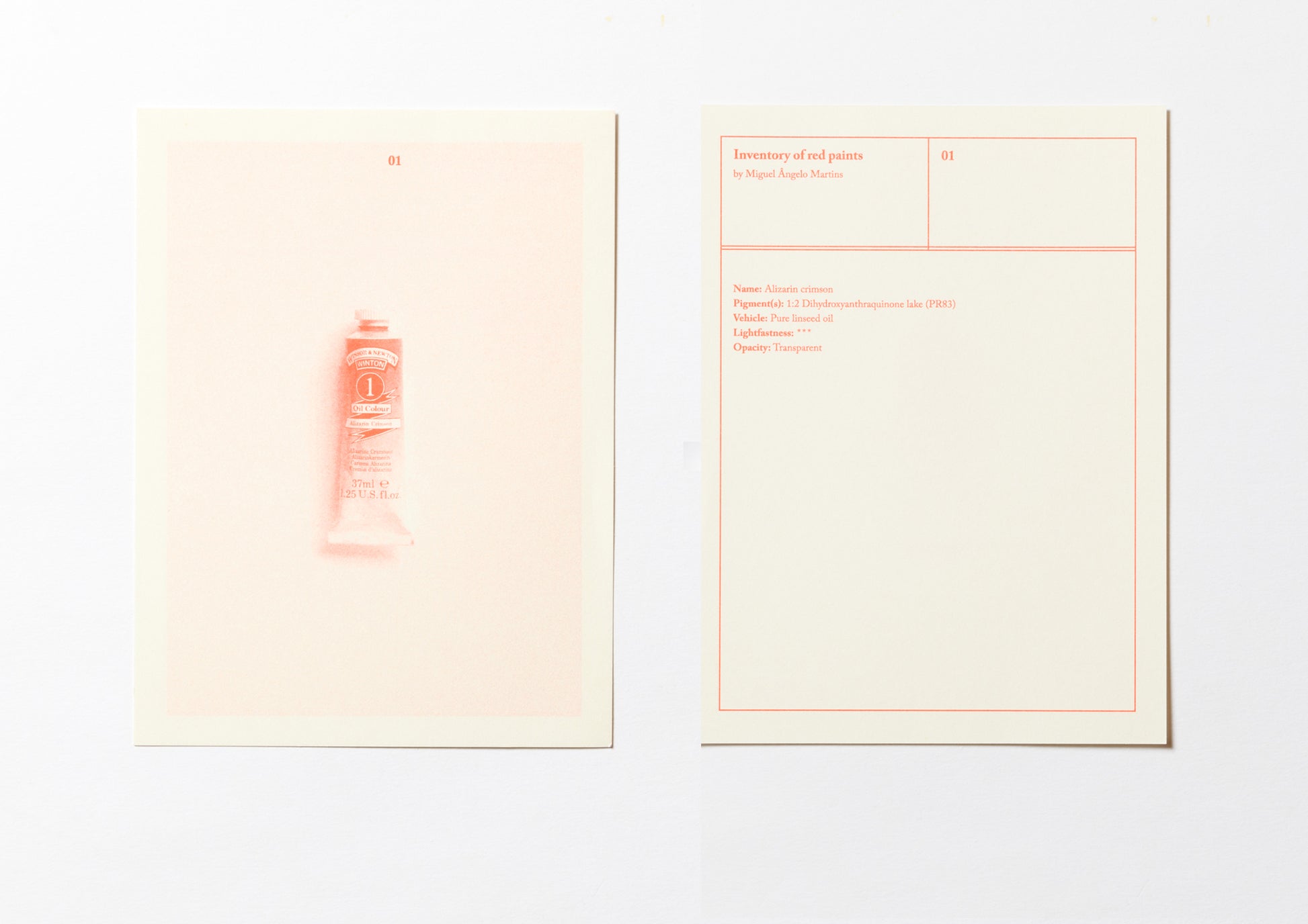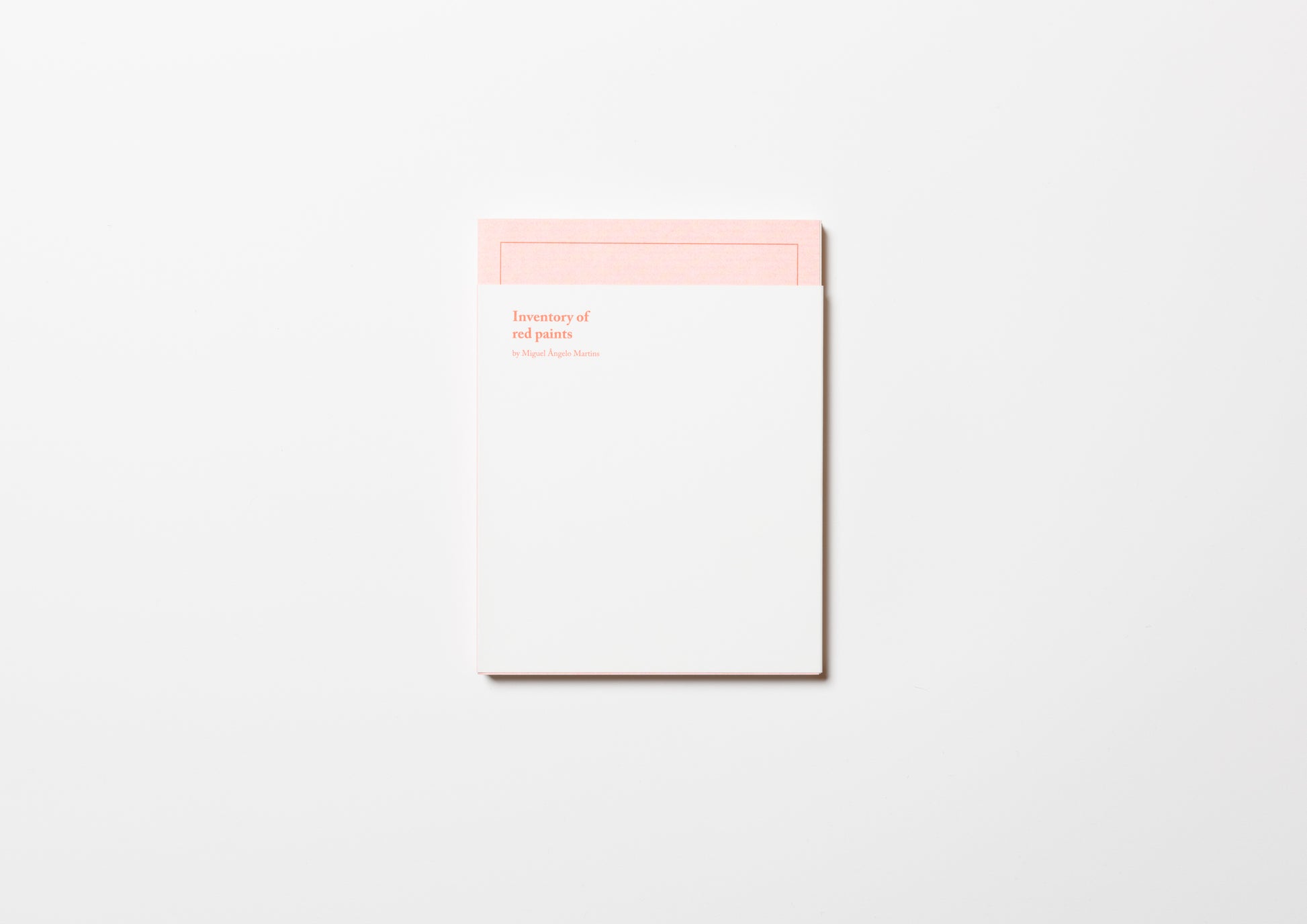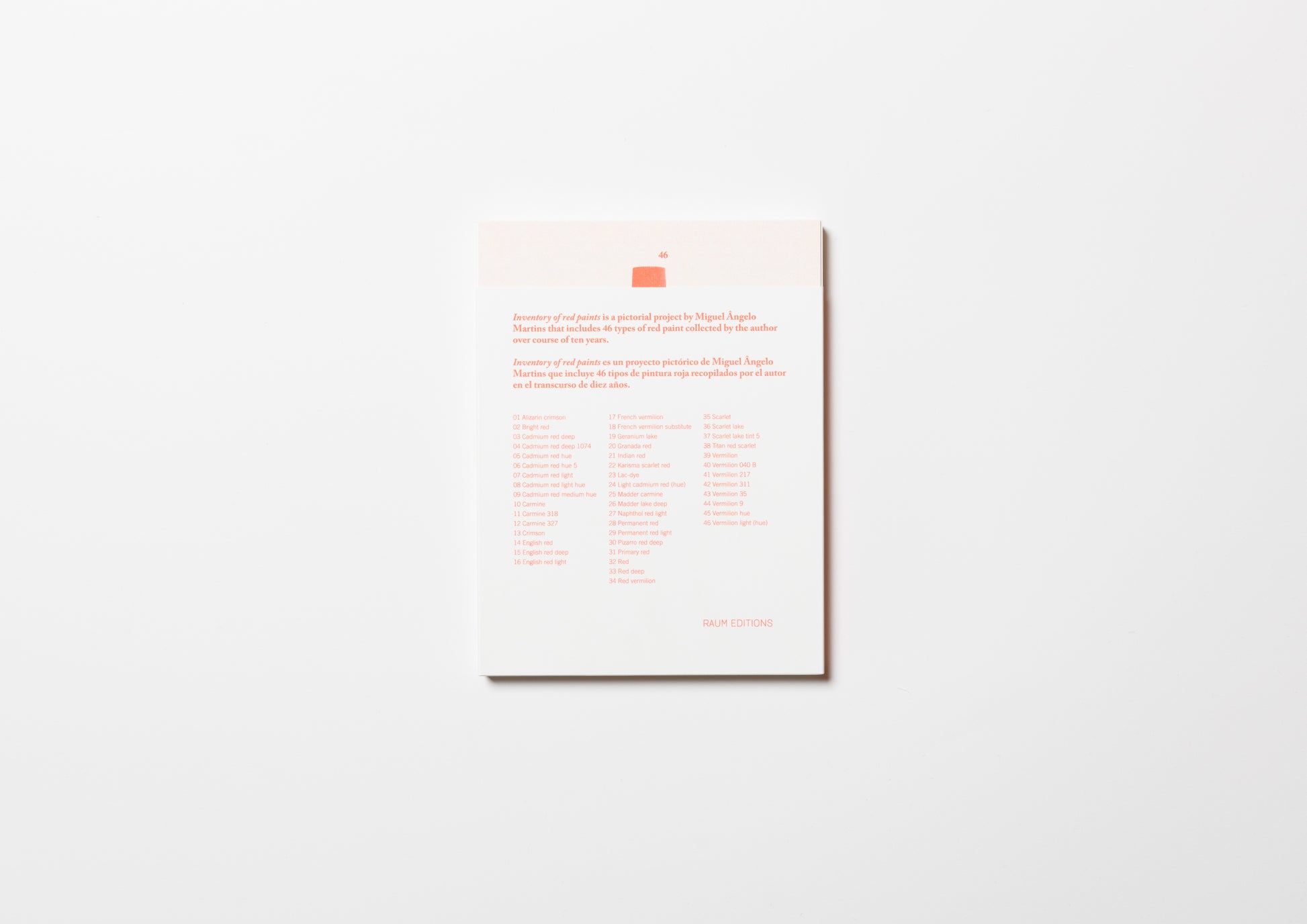 "Inventory of Red Paints" contains 46 different red paints collected by Spanish artist Miguel Ângelo Martins over a period of 10 years. The book is also the first work published by Raum Editions, a label founded by Miguel and his partner Laura Pilar Delgado.