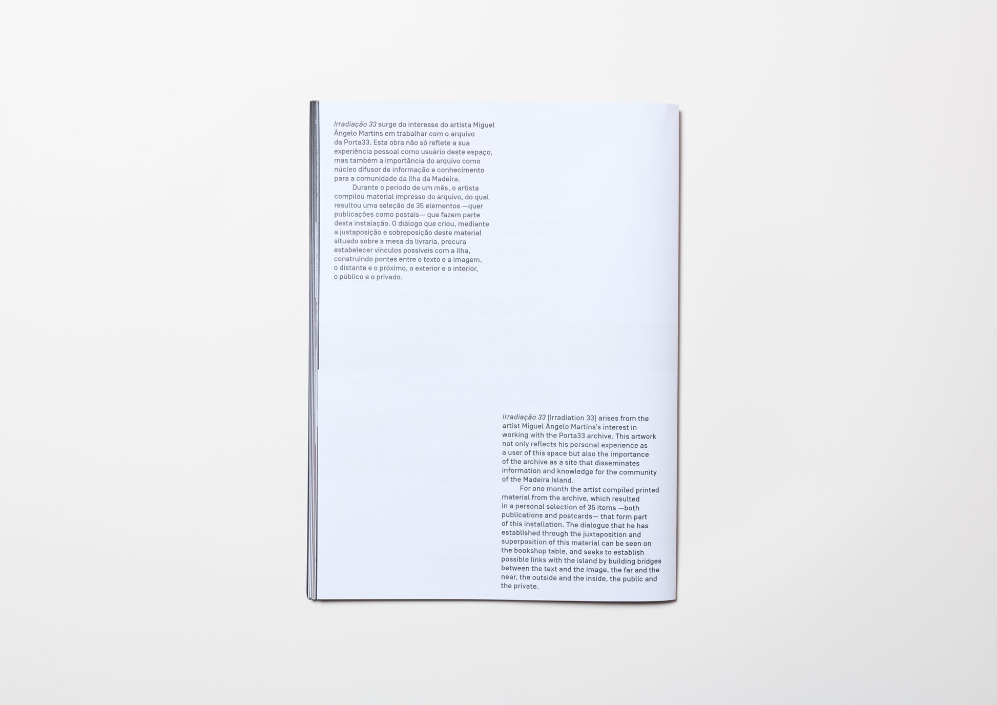 This book was born out of Miguel's interest in creating an archive for the art Porta33 (a contemporary art production project by artists of Madeira Islands origin that began in 1989). The content reflects not only his personal experience as a user of porta33, but also the importance of the archive as a site to disseminate information and knowledge to the Madeira Island community.