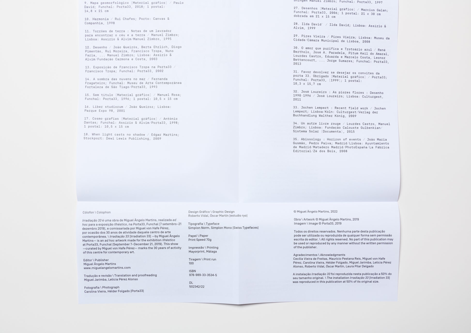 Editor, Publisher: Miguel Angelo Martins / Translation and proofreading: Miguel Jarimba, Leticia Pérez Alonso / Typeface: Simplon Norm, Simplon Mono (Swiss Typefaces)
