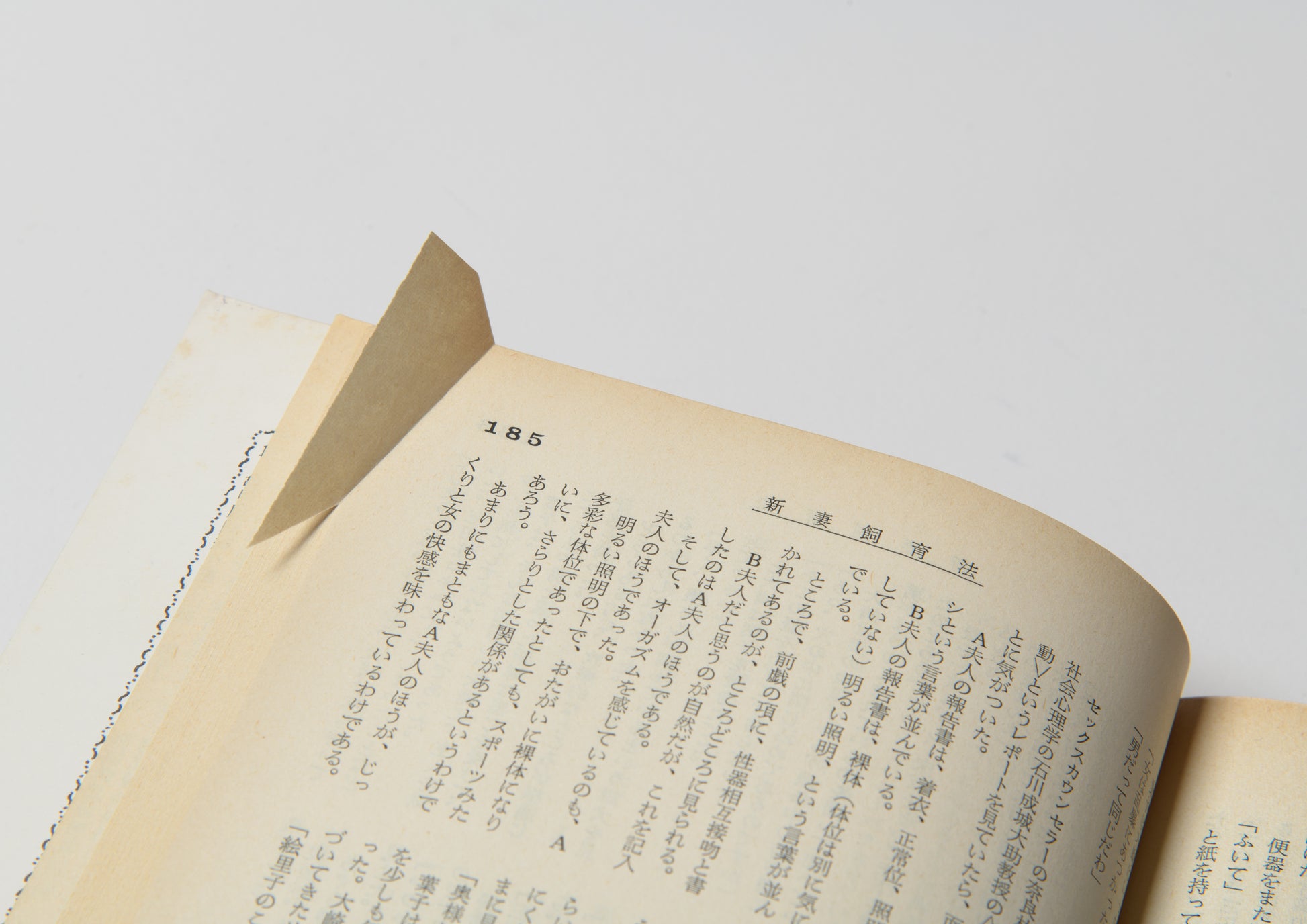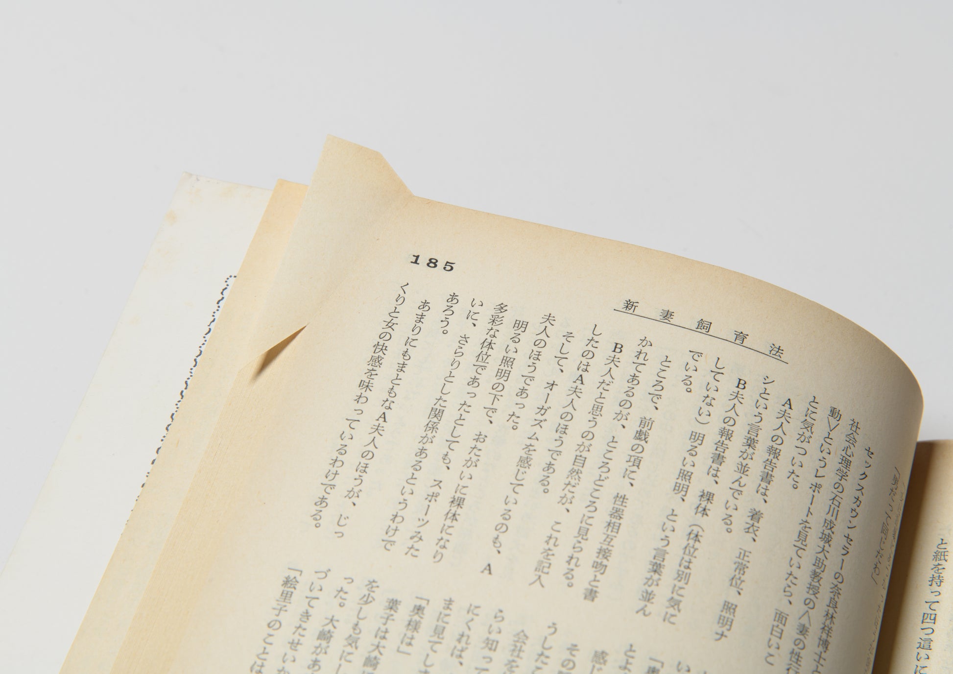 I found a pair of white petal-like ears folded demurely in the middle of this book. It was right at the top of the page of Yoshino Mayumi's "New Bride Training Method," which follows Dan Oniroku's serial novel "Flowers and Snakes." Although the lucky ears were an unintentional machine error, the coincidence of which book and which page they appeared on and how they appeared stimulates our imagination.