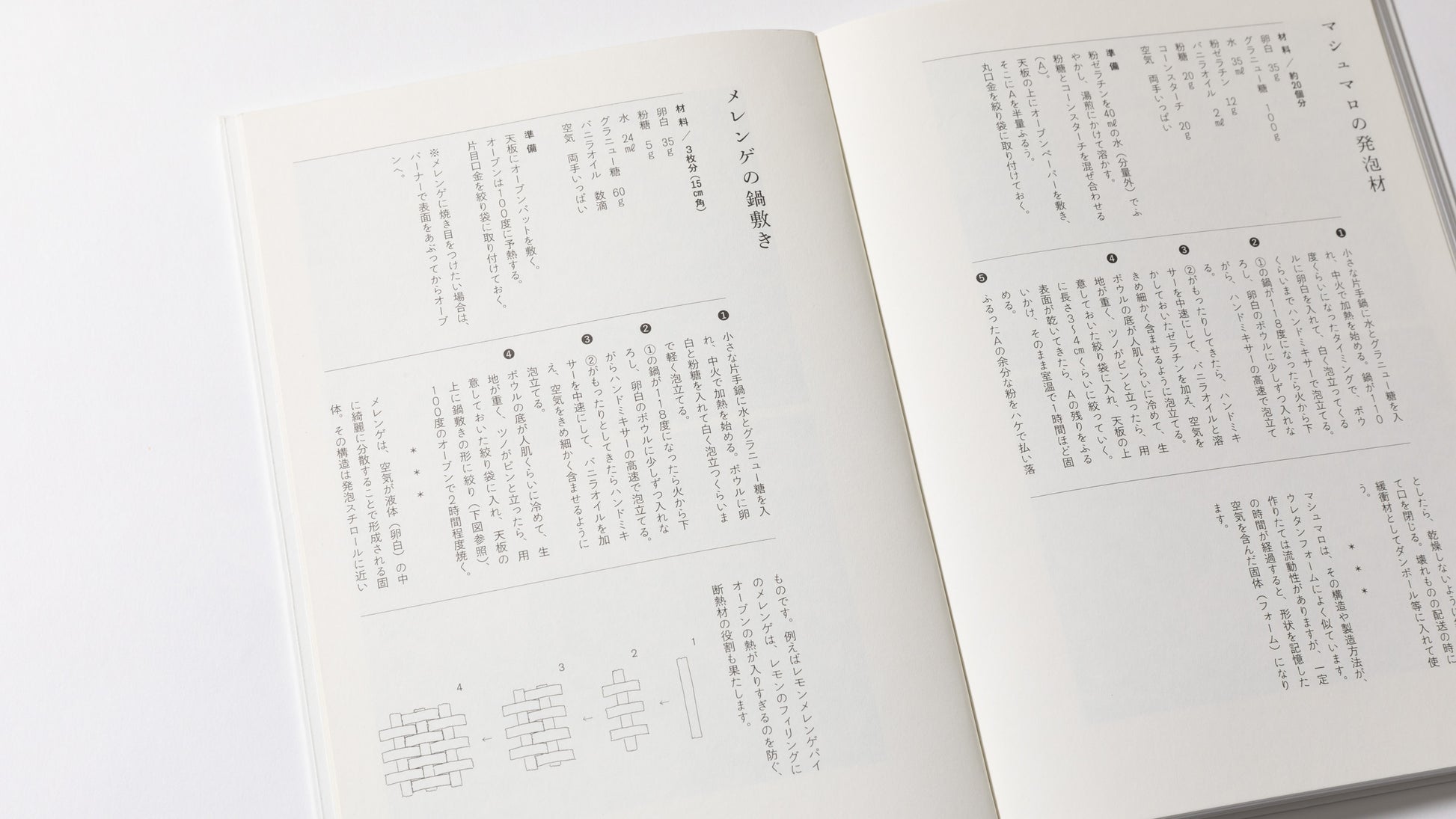Ten years have passed since Tsuchitani started his career as a confectioner, but he has not yet published a recipe book. This time, he introduces the recipes for the eight types of airy sweets that appear in the first half of this book. The distinctive feature of the recipes is, of course, that they contain air as an ingredient. Only by skillfully incorporating air can you make delicious airy sweets, and this must have been a world first. Confectionery, which mainly uses refined ingredients, is much more chemical than cooking in terms of both the way it is made and the structure. Tsuchitani's short notes explain sweets from a chemical perspective, so they are a must-read.