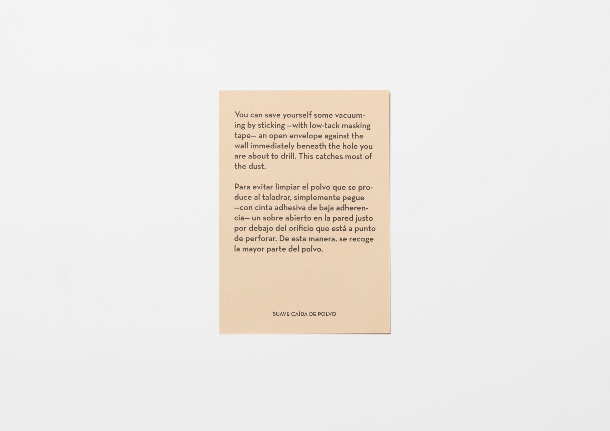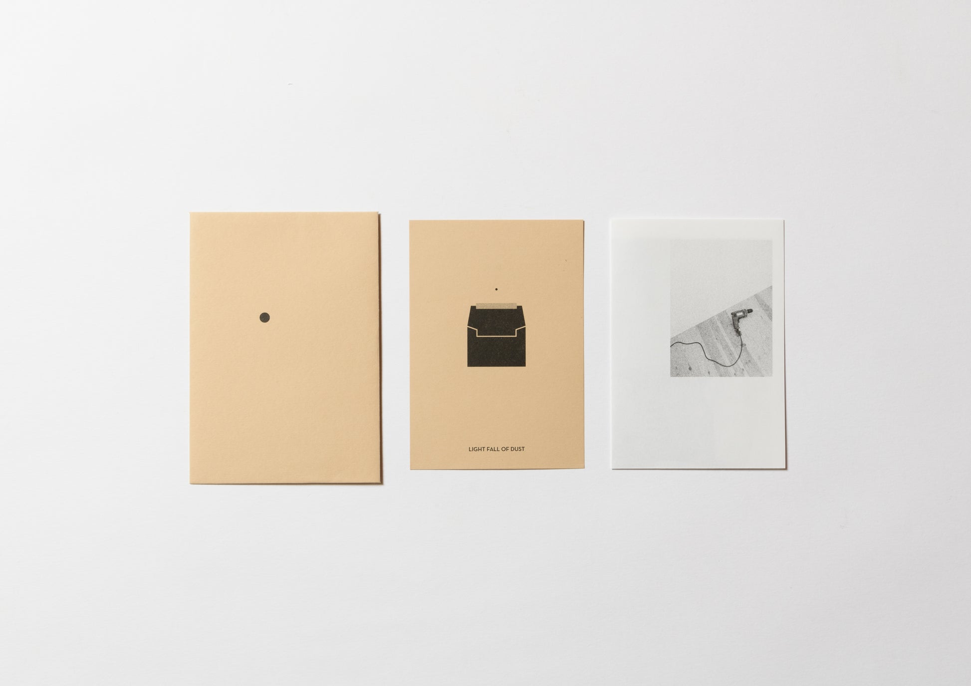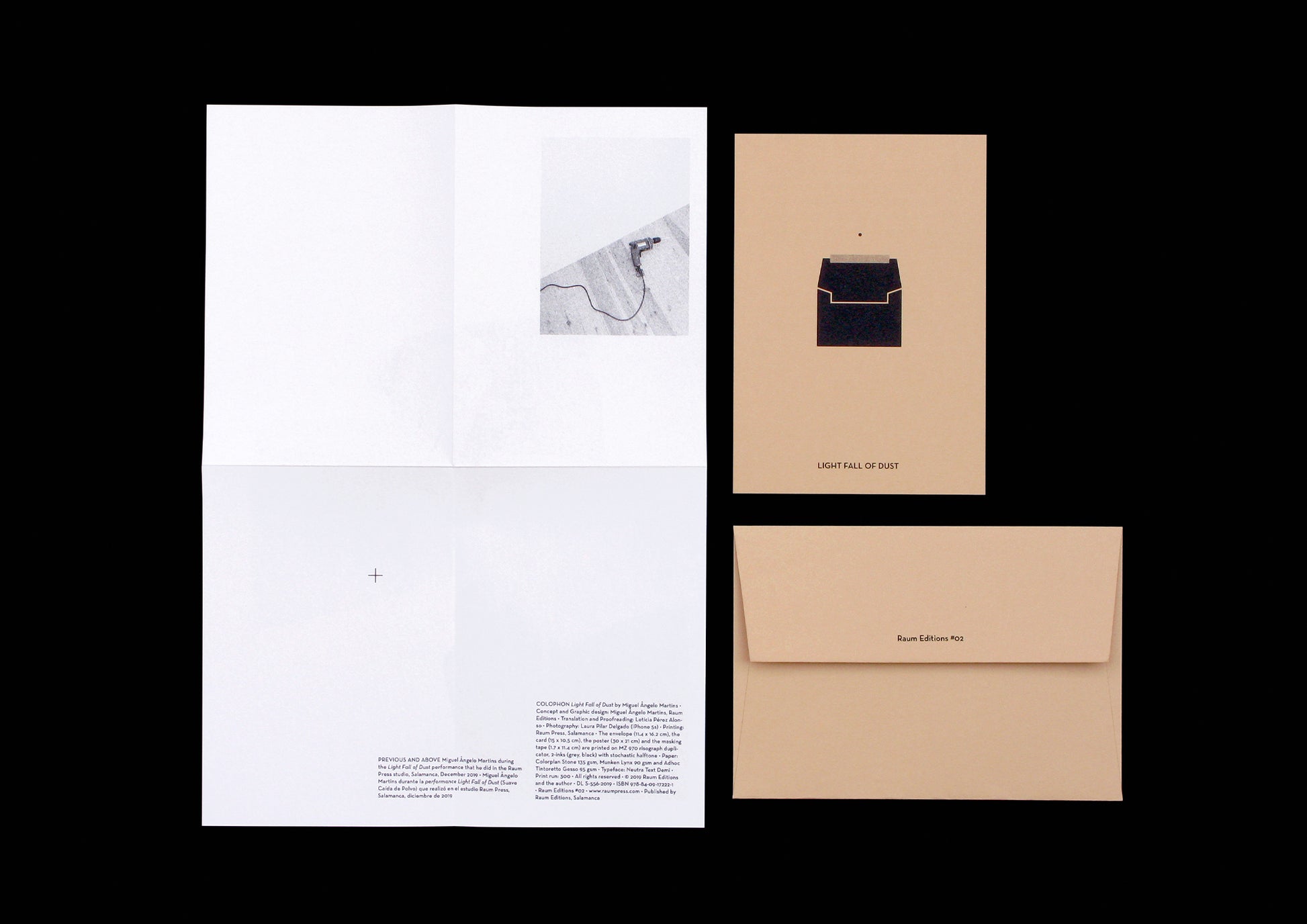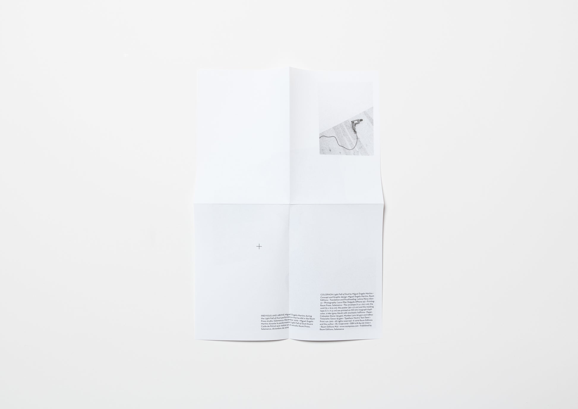 Documentation of a performance that took place on December 31, 2019, at the Raum Press Studio in Salamanca, Spain. Up until that time, every time the artist Miguel made a hole in the wall of the exhibition space to hang his work, he always put an envelope just below the hole with masking tape to prevent dust from scattering on the floor. Before long, it began to feel like a ritual, and I realized that there was an aspect of physical documentation. He then decided to make this book, Light Fall of Dust.