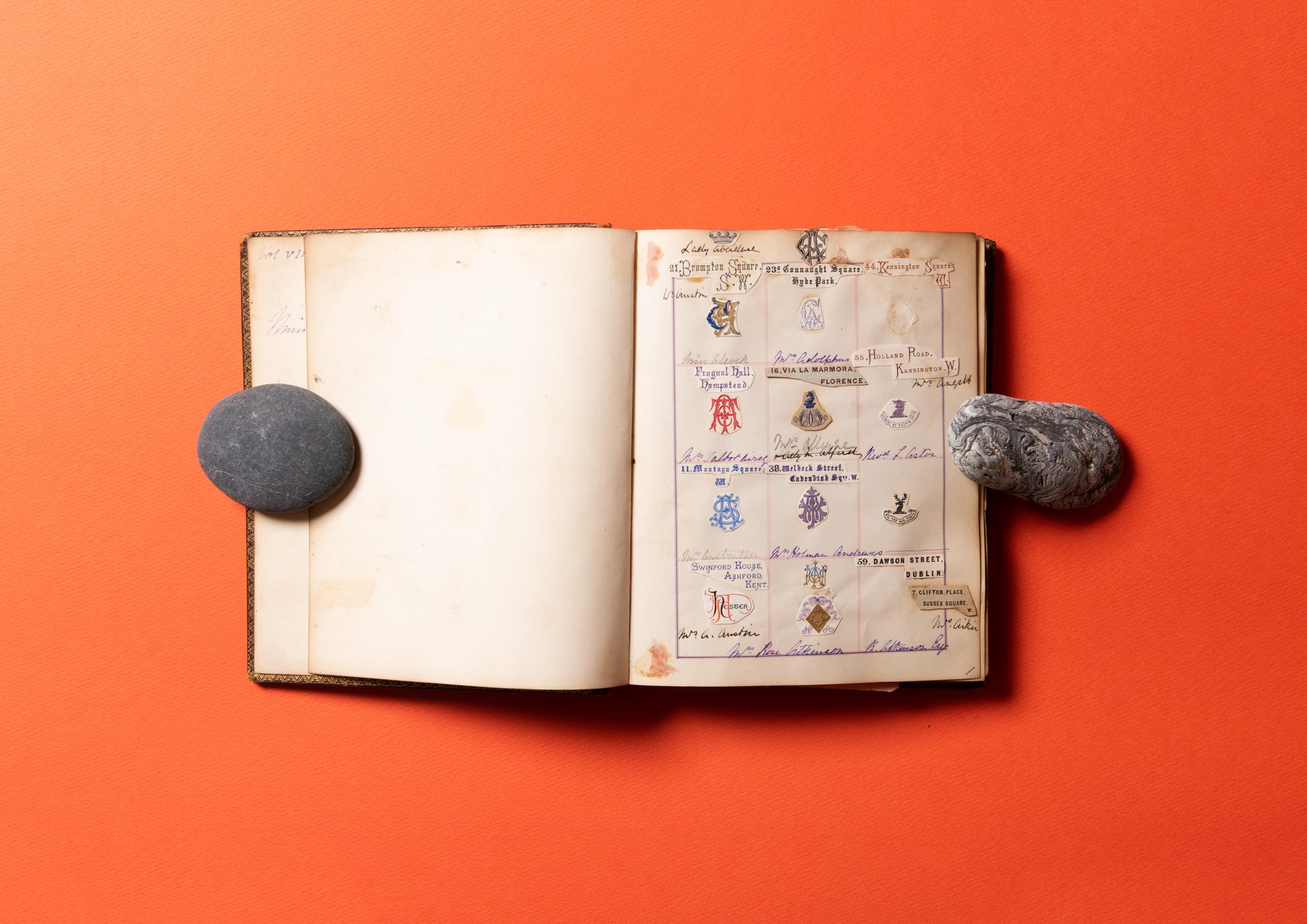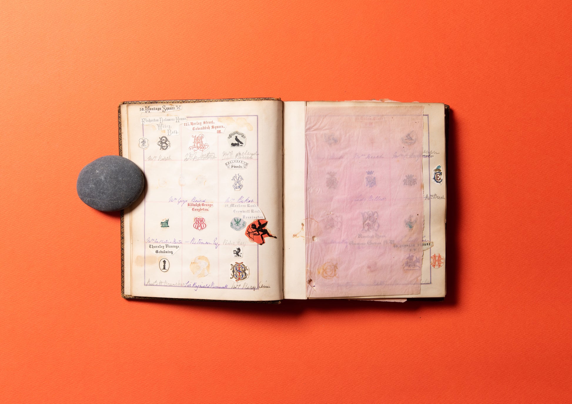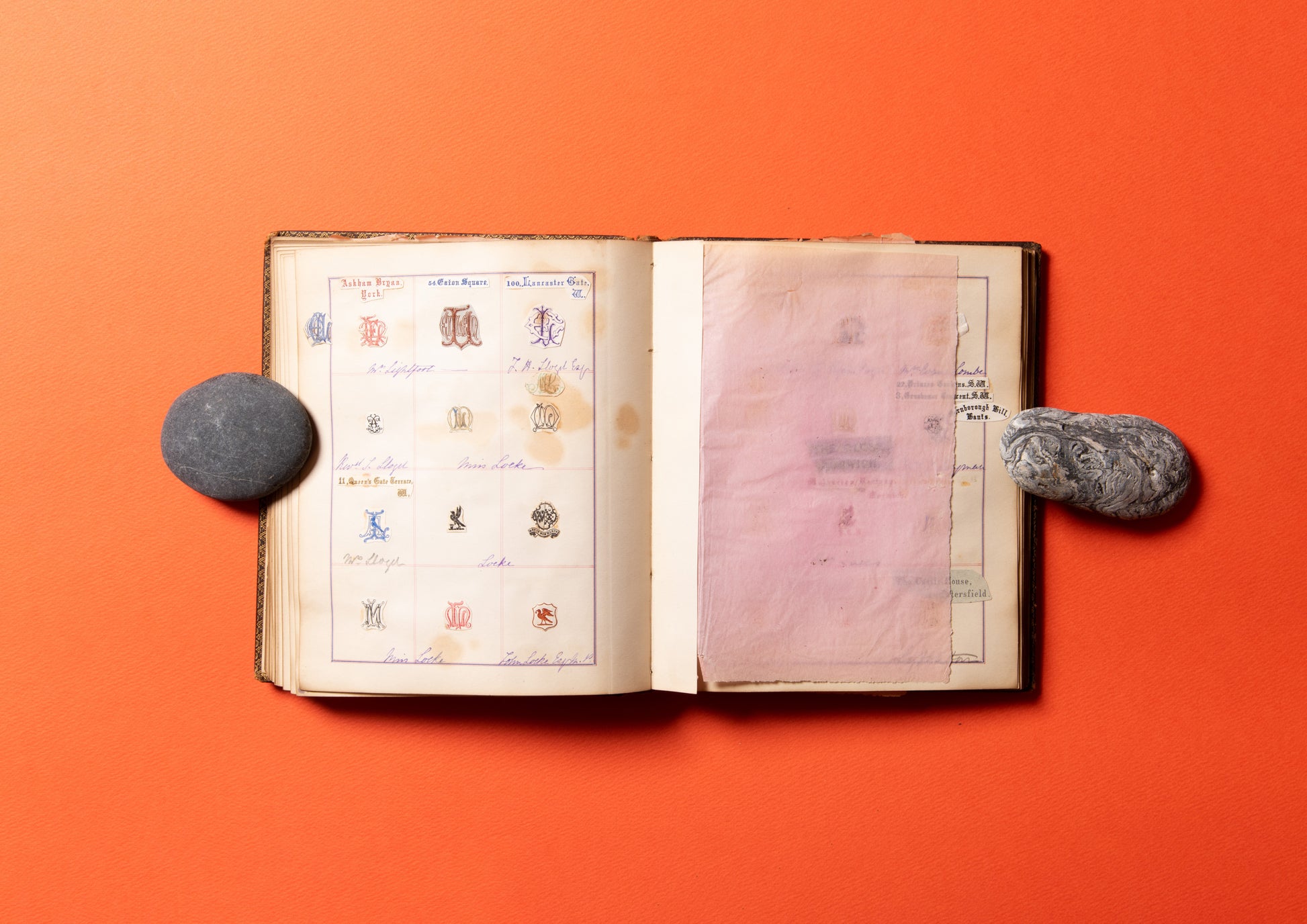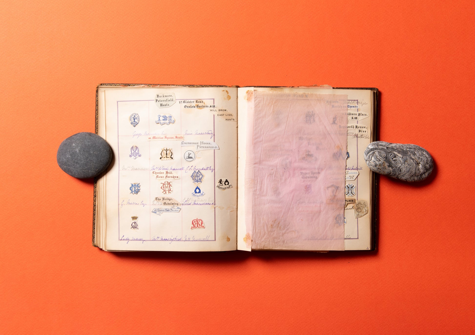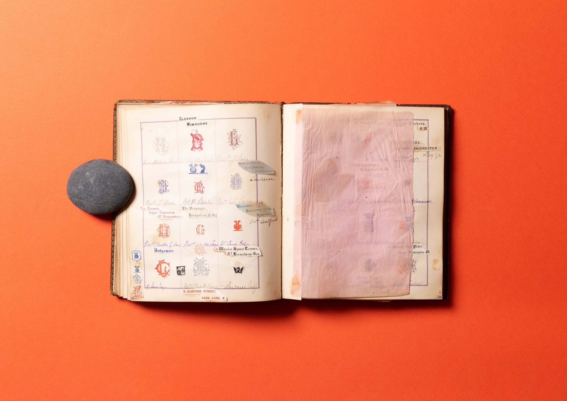 Unique private book with 1,000 monograms and crests based on personal names pasted on it, along with a piece of paper with the address. / 個人名に基づくモノグラムや紋章を住所の紙片とともに貼り込んだ私家本