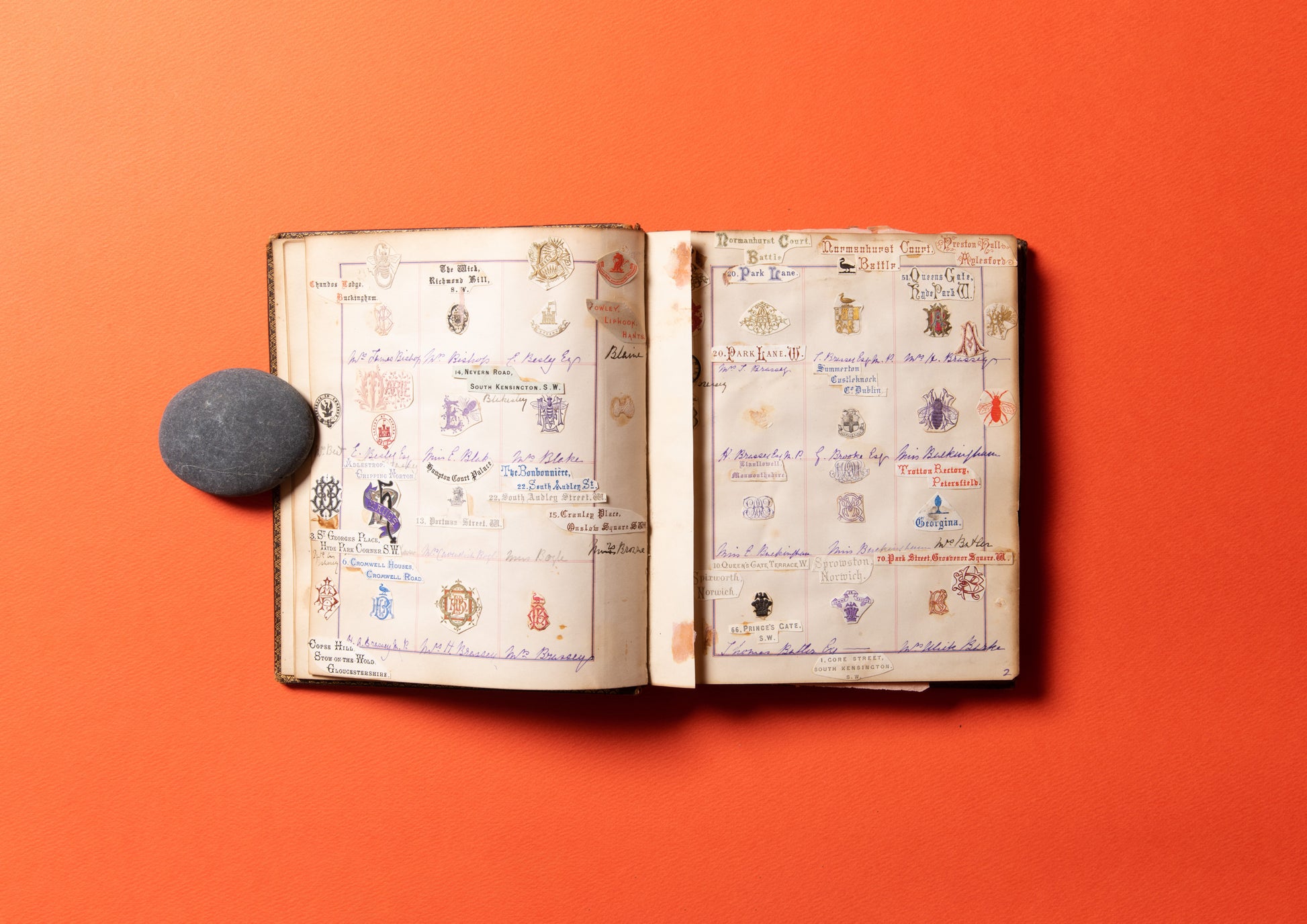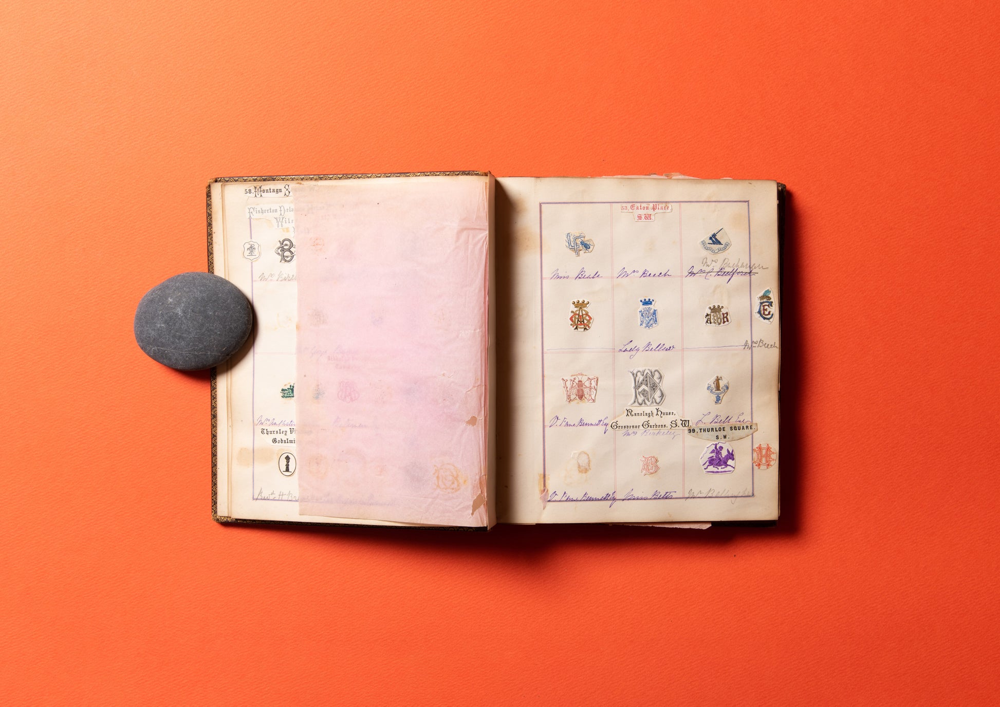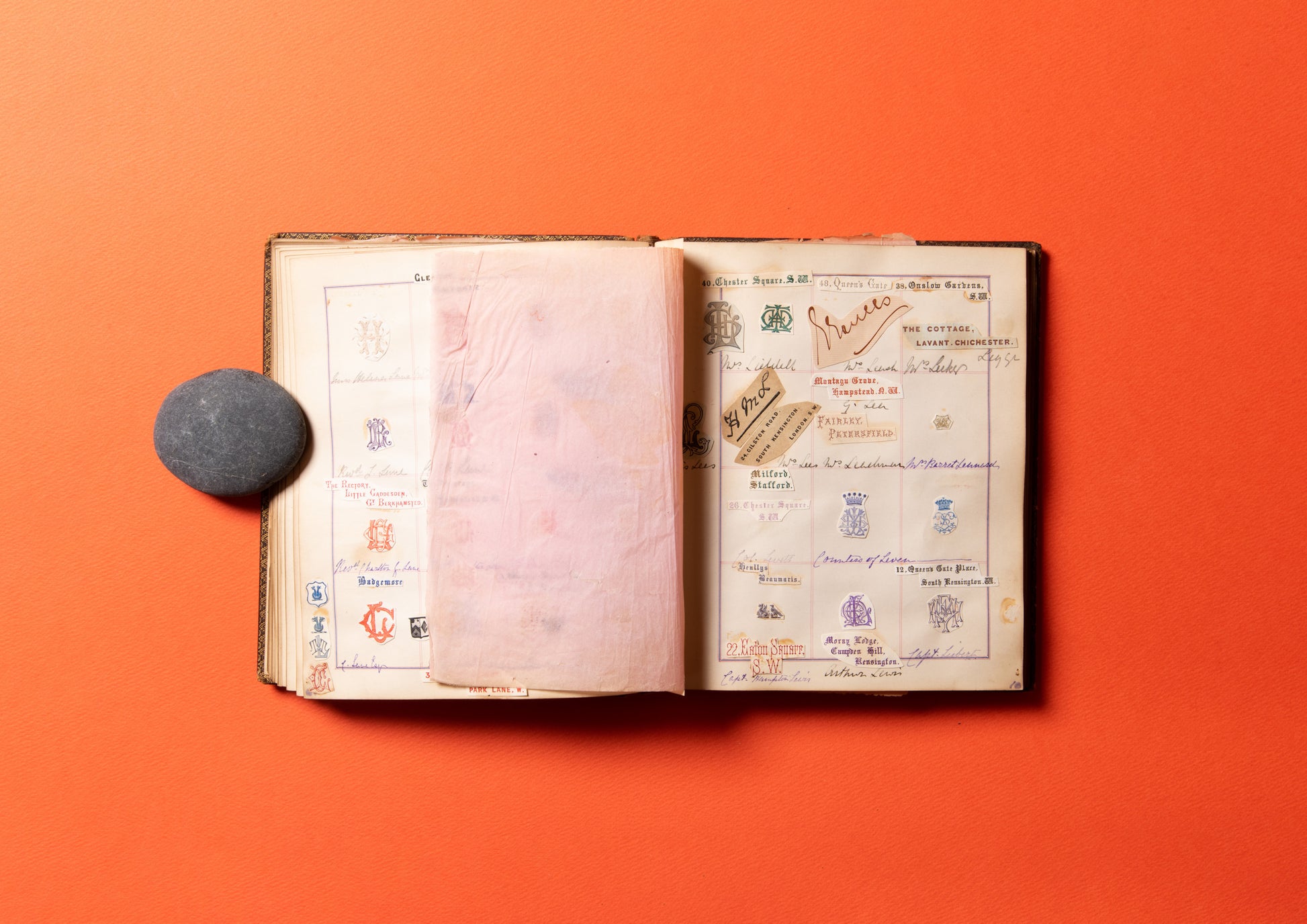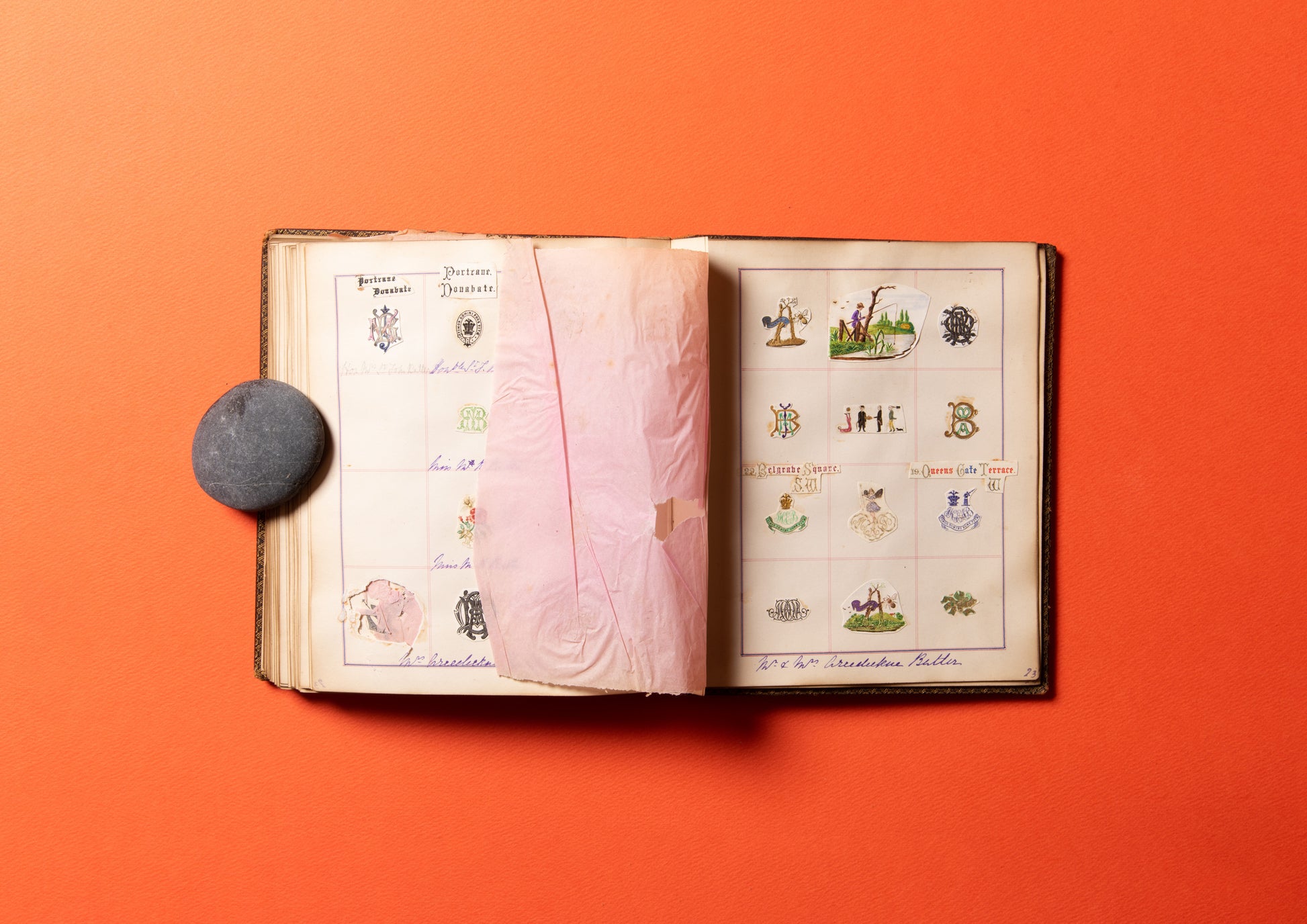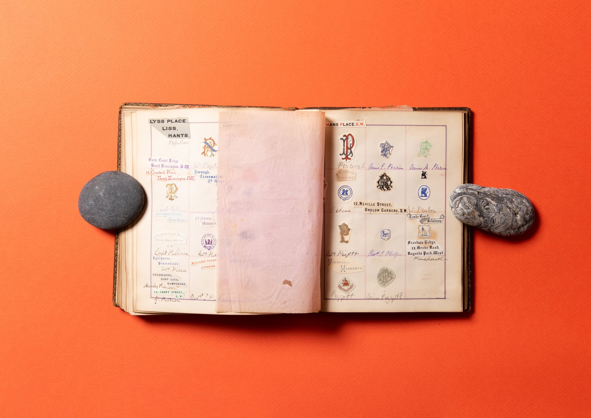 Unique private book with 1,000 monograms and crests based on personal names pasted on it, along with a piece of paper with the address. / 個人名に基づくモノグラムや紋章を住所の紙片とともに貼り込んだ私家本