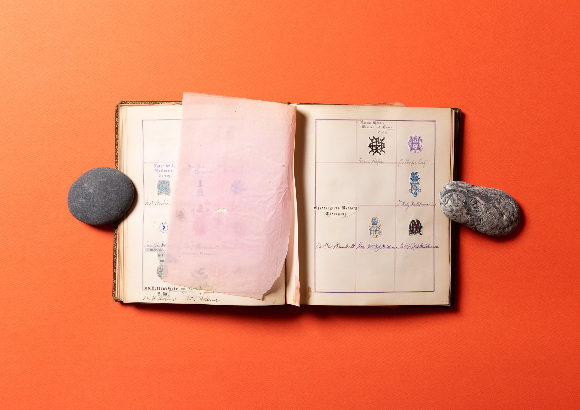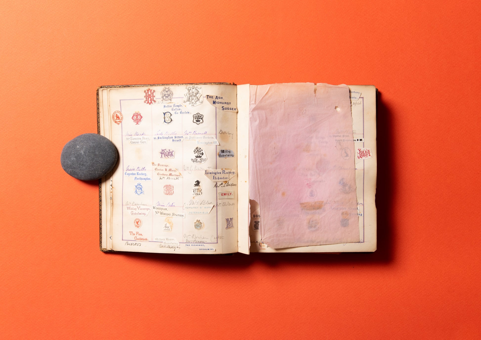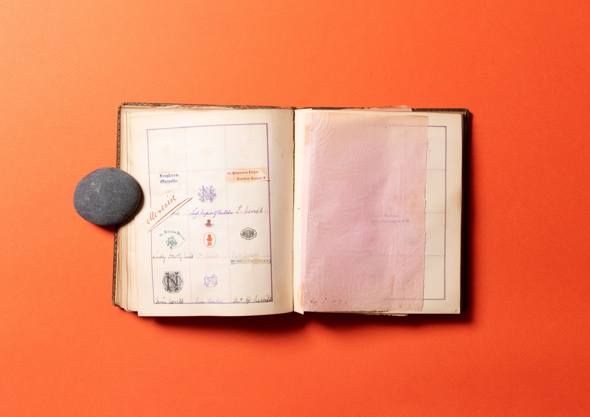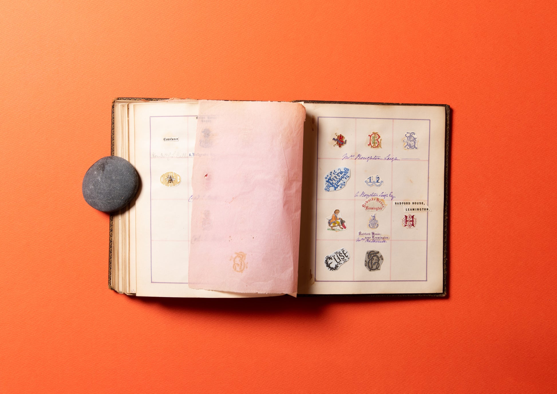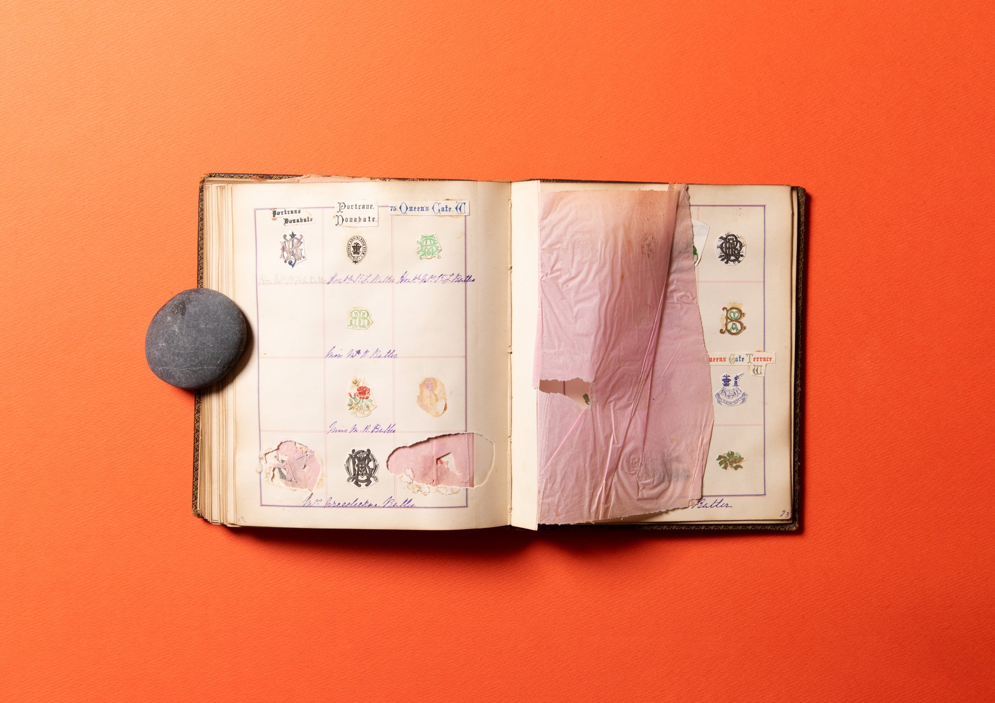 Unique private book with 1,000 monograms and crests based on personal names pasted on it, along with a piece of paper with the address. / 個人名に基づくモノグラムや紋章を住所の紙片とともに貼り込んだ私家本