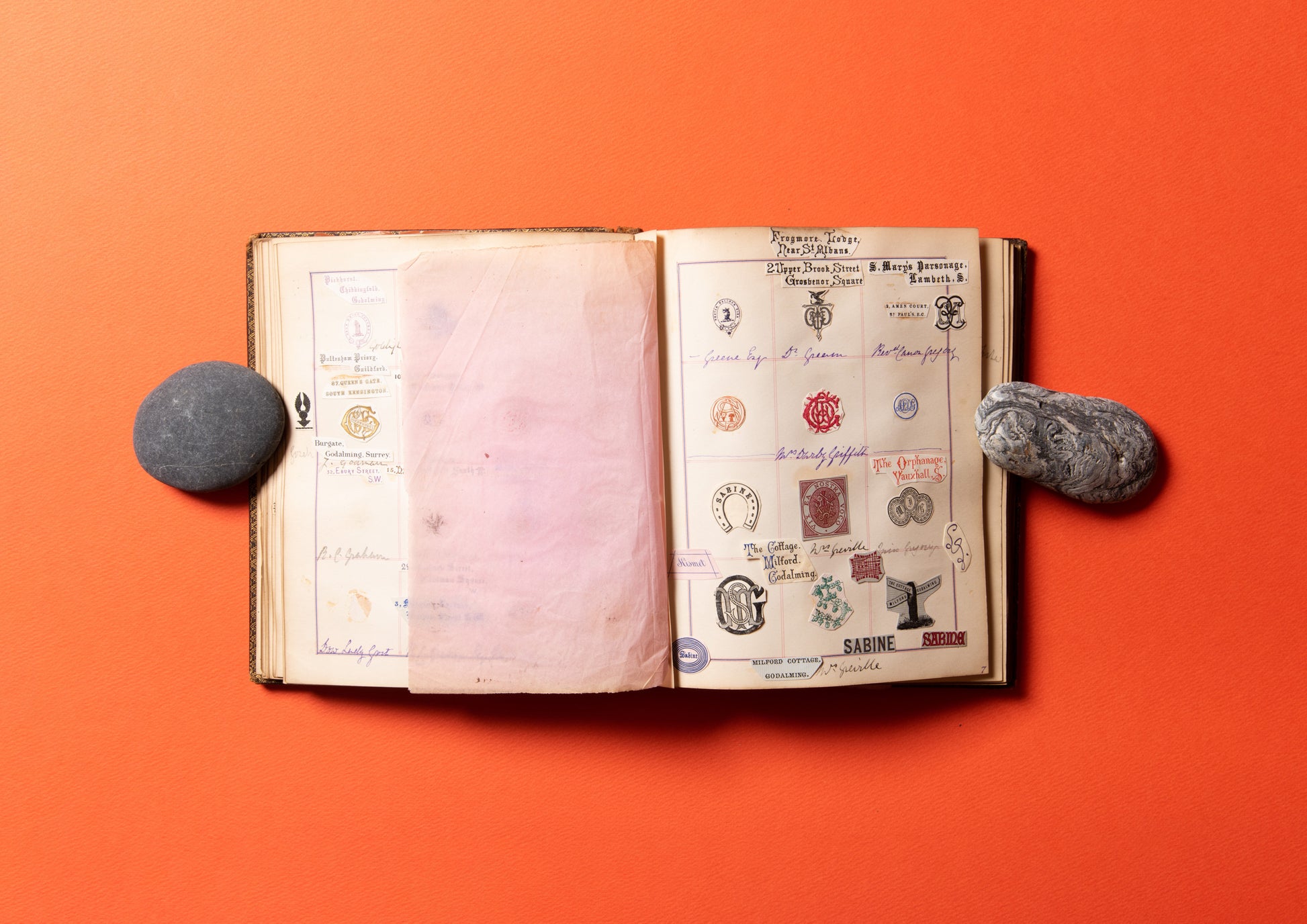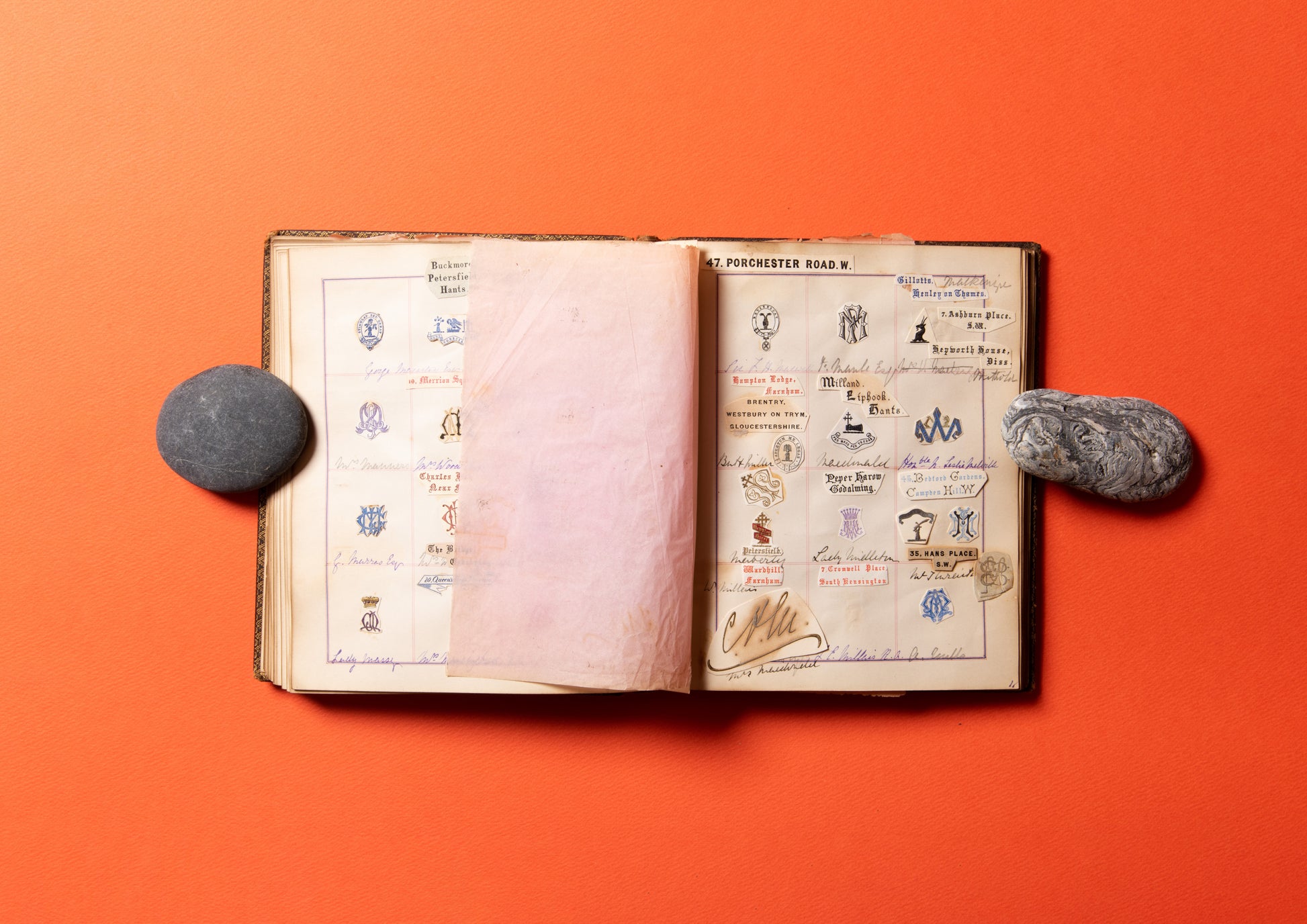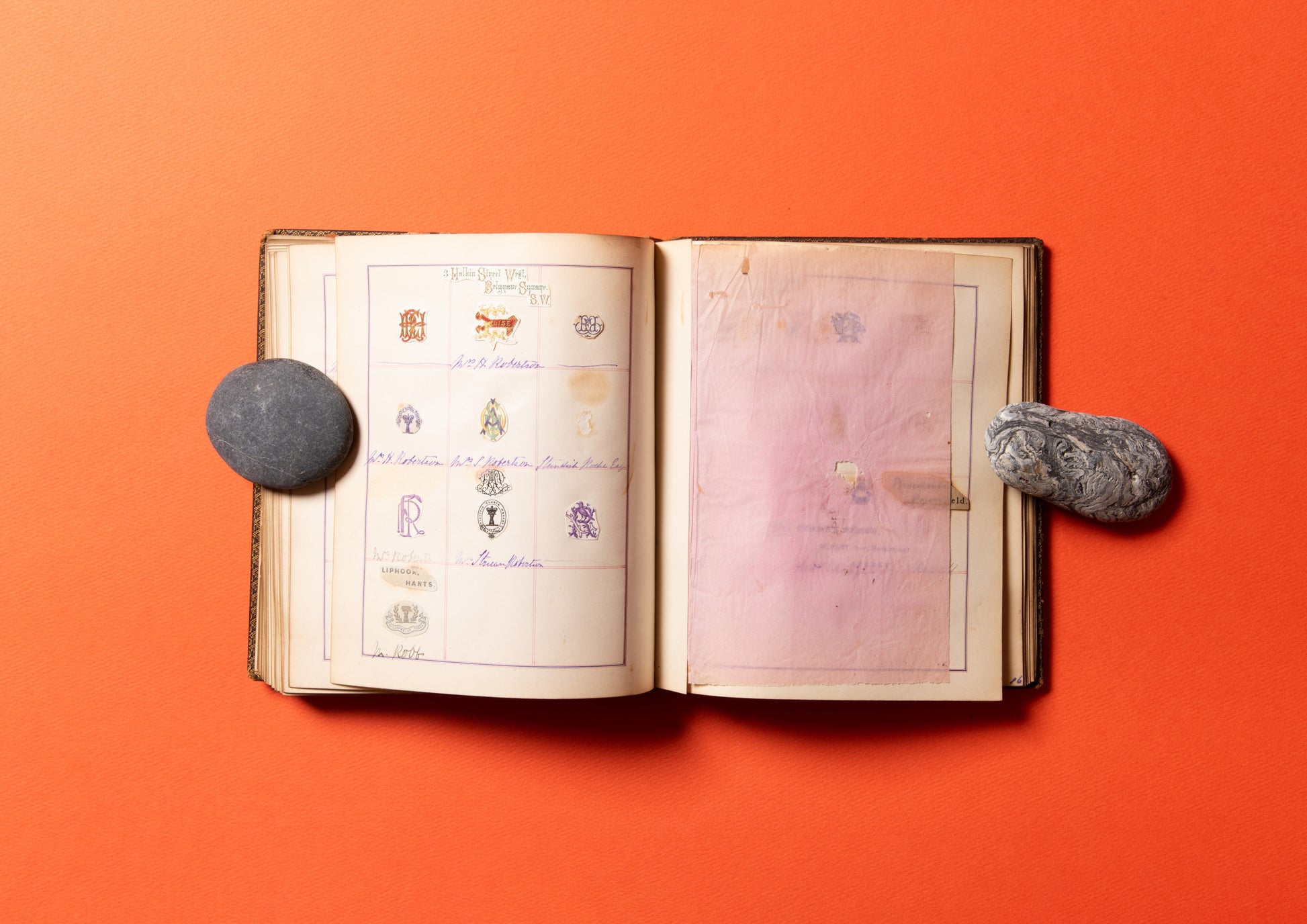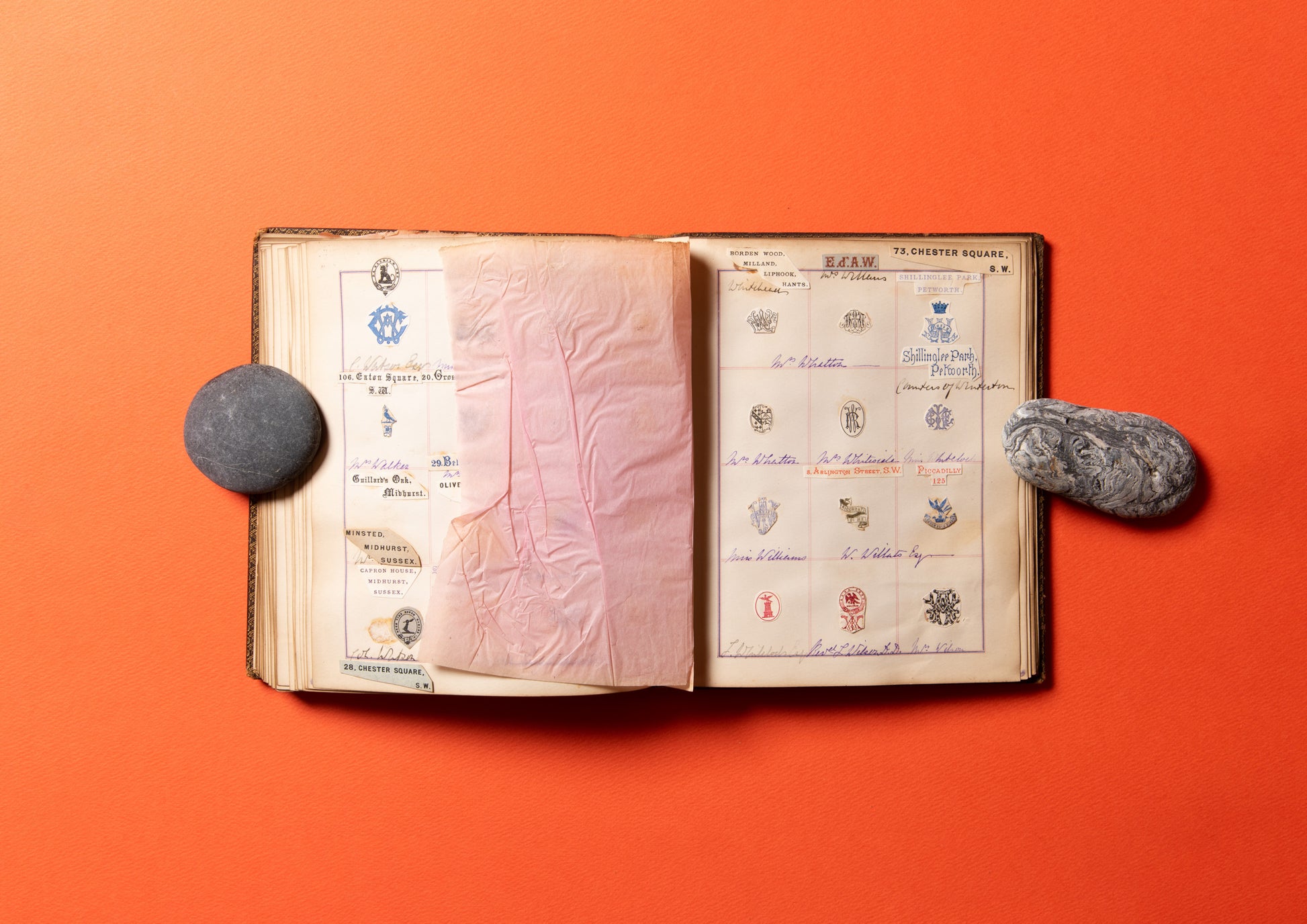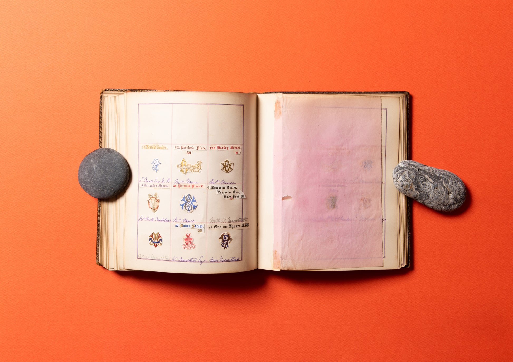 Unique private book with 1,000 monograms and crests based on personal names pasted on it, along with a piece of paper with the address. / 個人名に基づくモノグラムや紋章を住所の紙片とともに貼り込んだ私家本