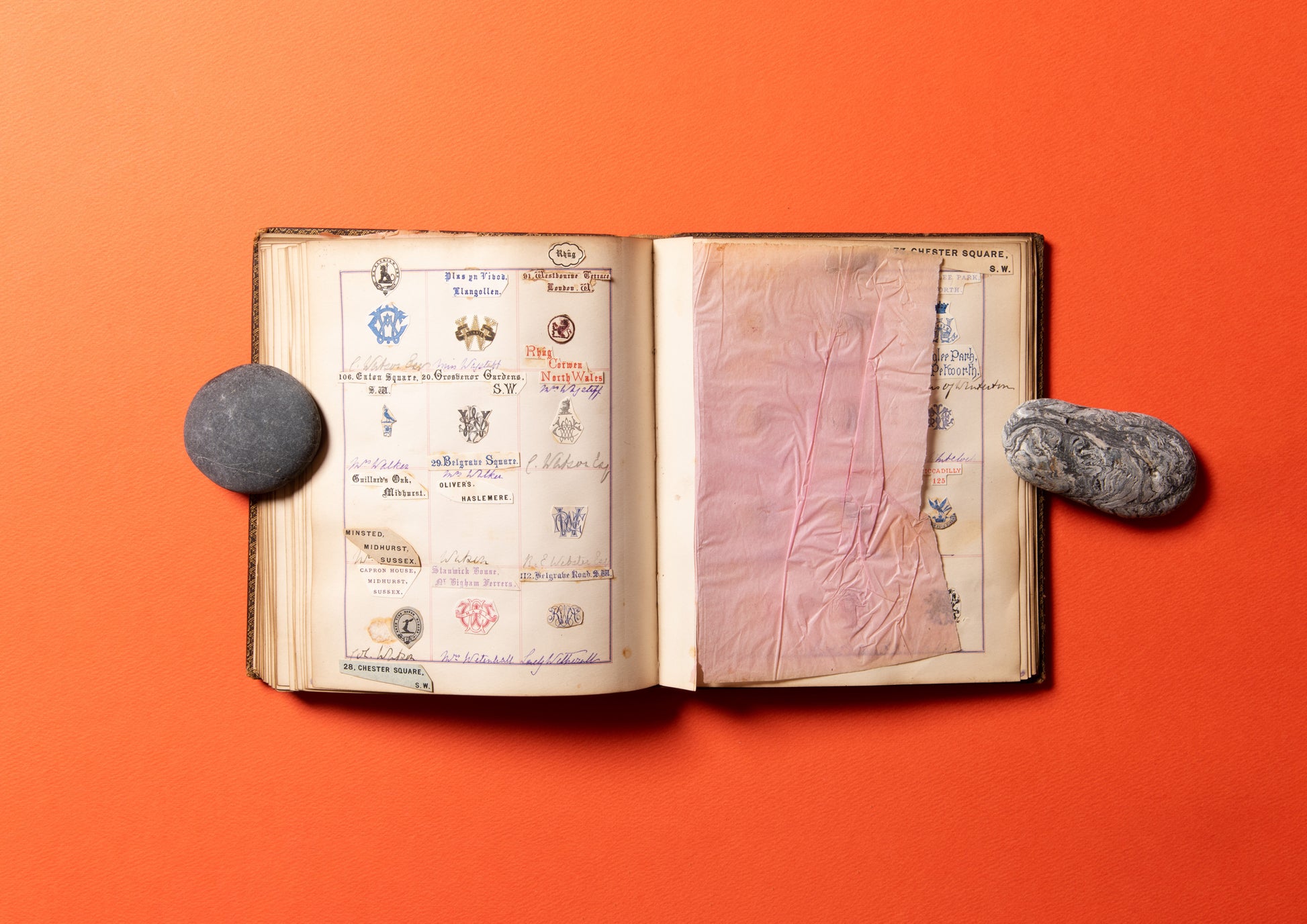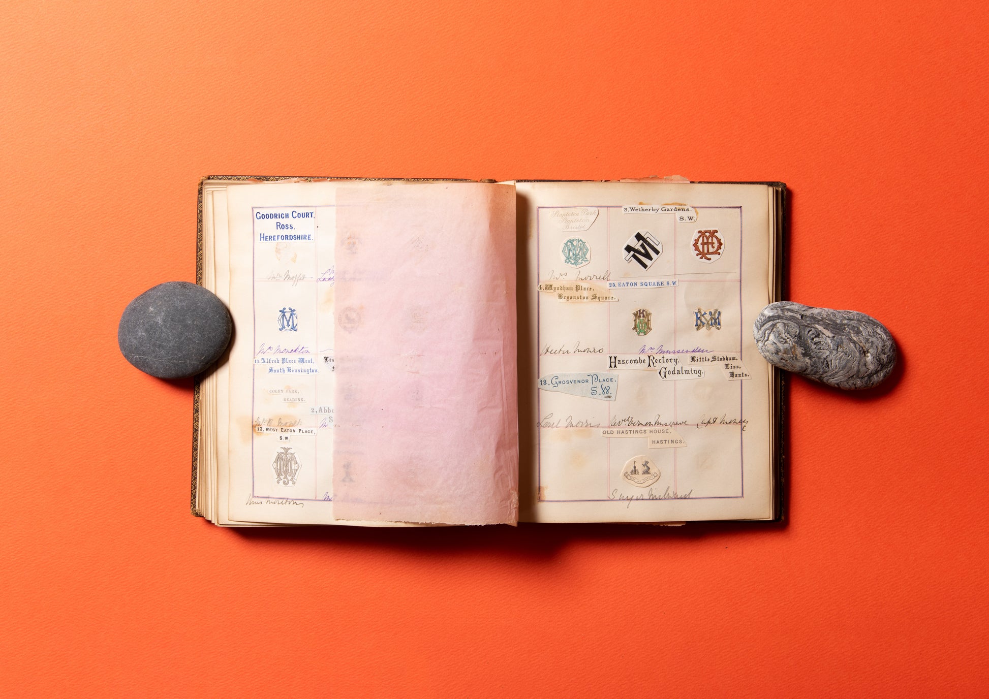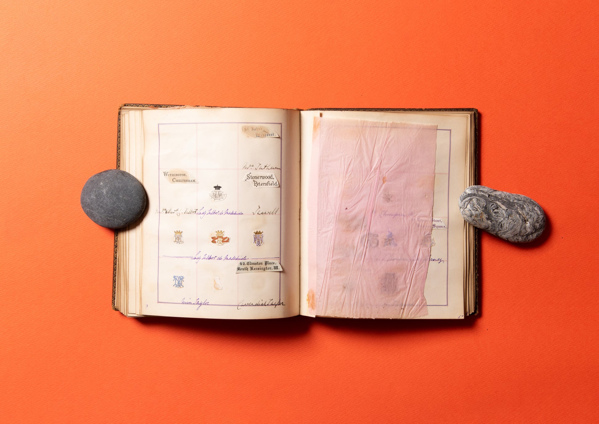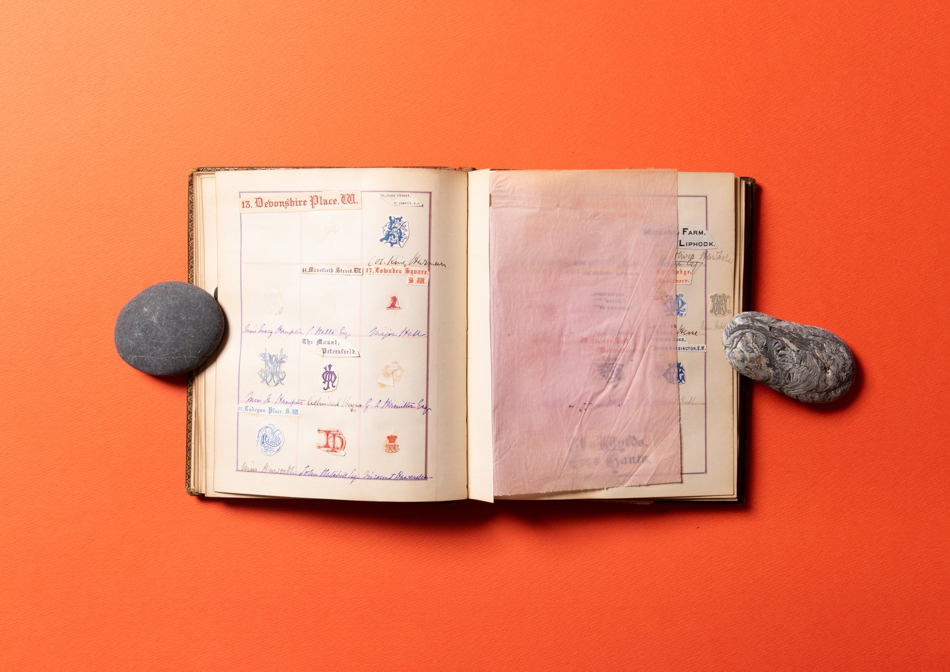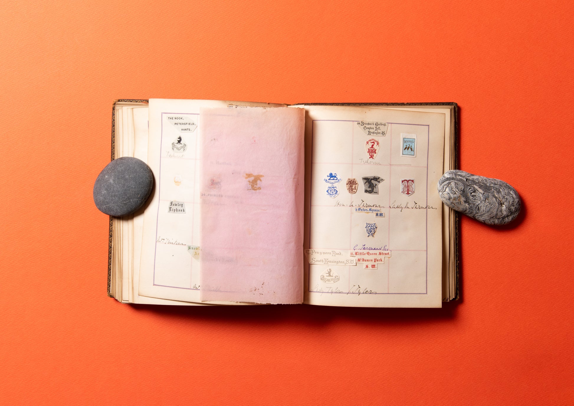 Unique private book with 1,000 monograms and crests based on personal names pasted on it, along with a piece of paper with the address. / 個人名に基づくモノグラムや紋章を住所の紙片とともに貼り込んだ私家本