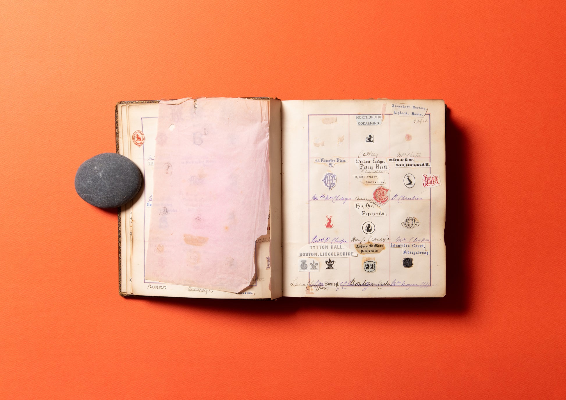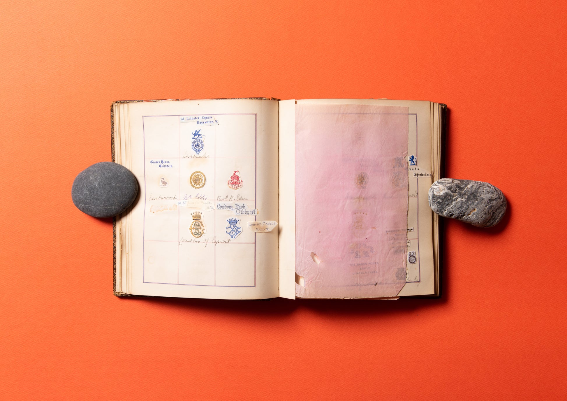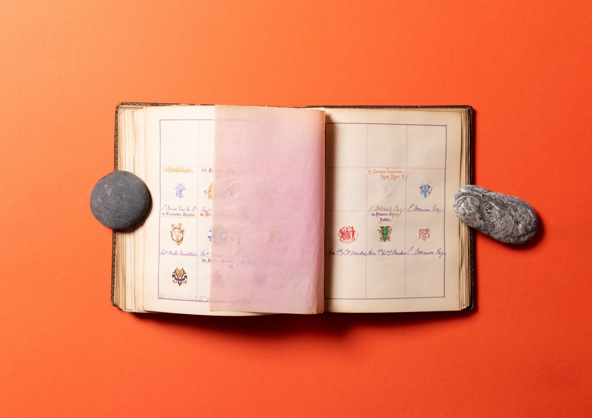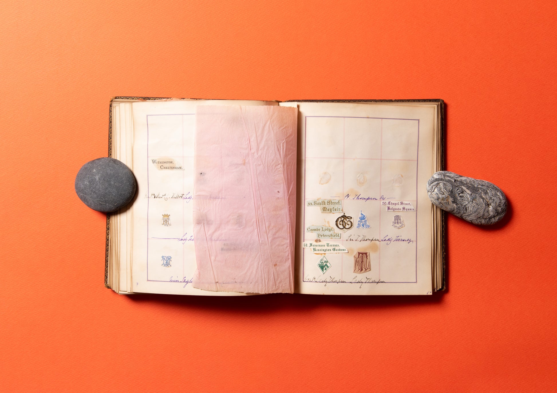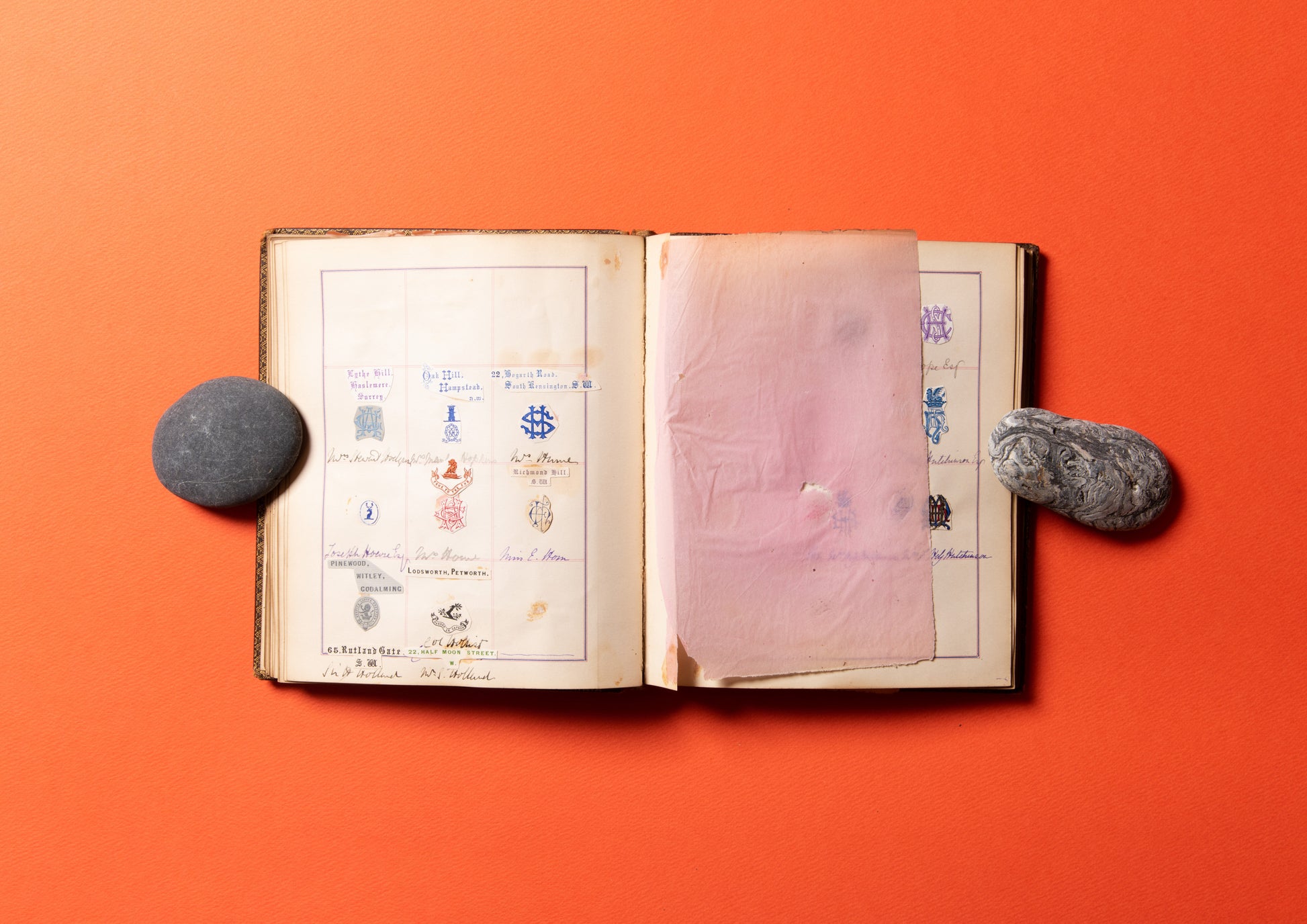 Unique private book with 1,000 monograms and crests based on personal names pasted on it, along with a piece of paper with the address. / 個人名に基づくモノグラムや紋章を住所の紙片とともに貼り込んだ私家本