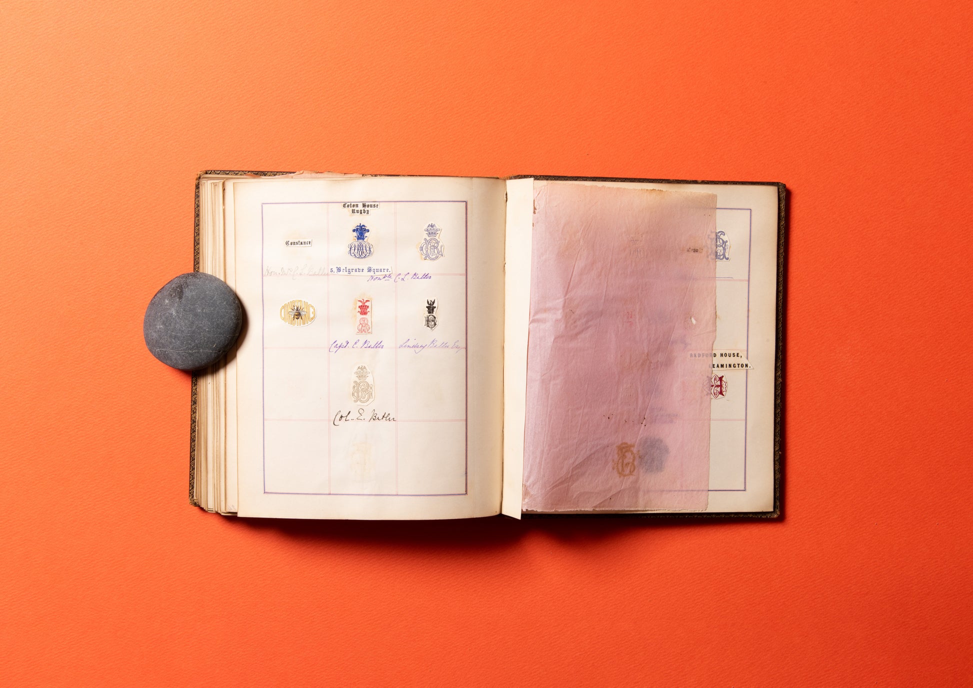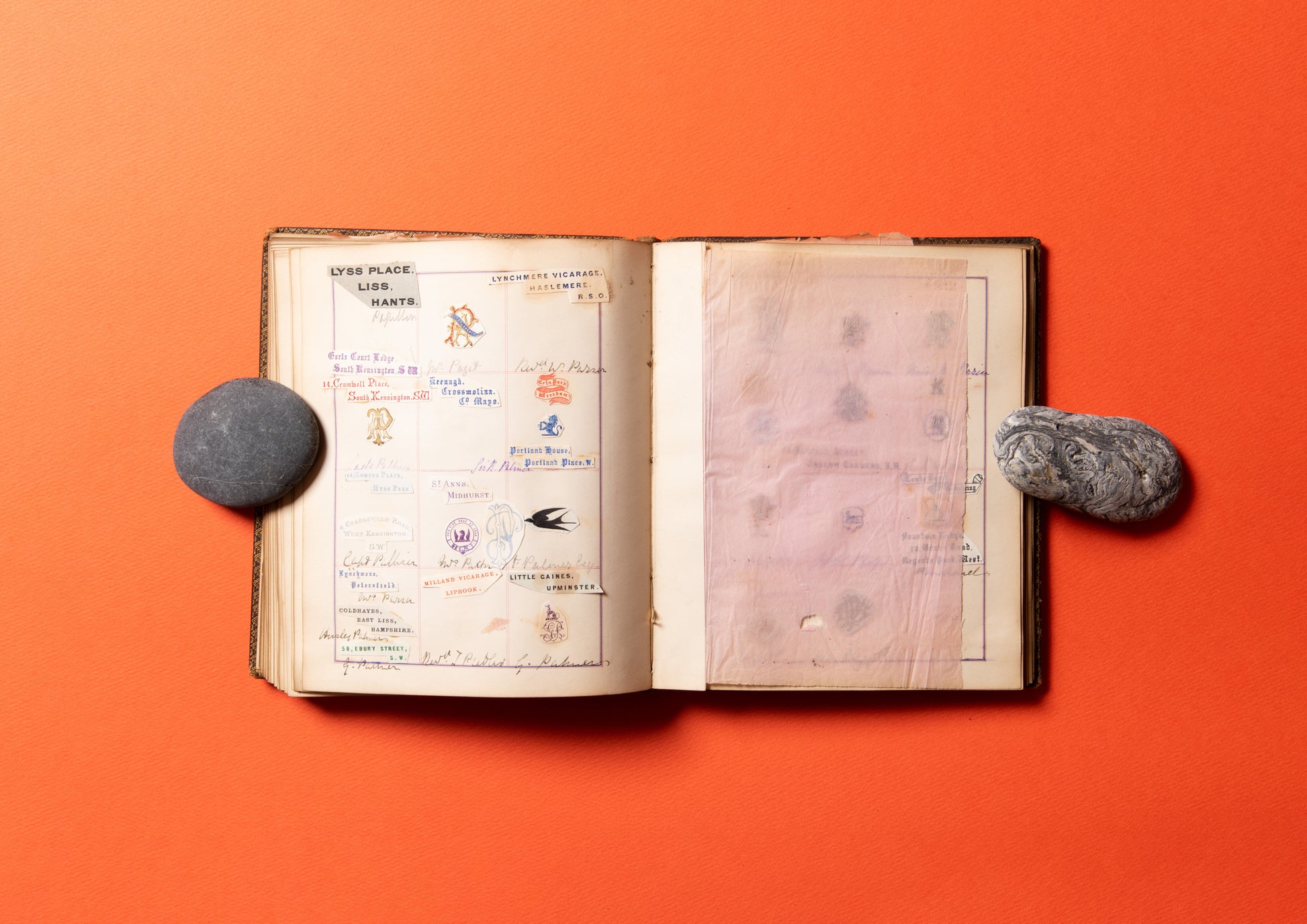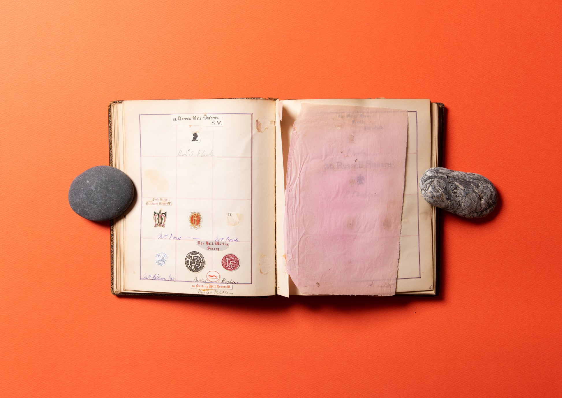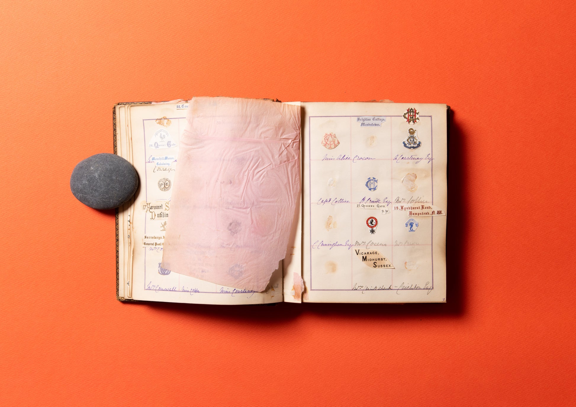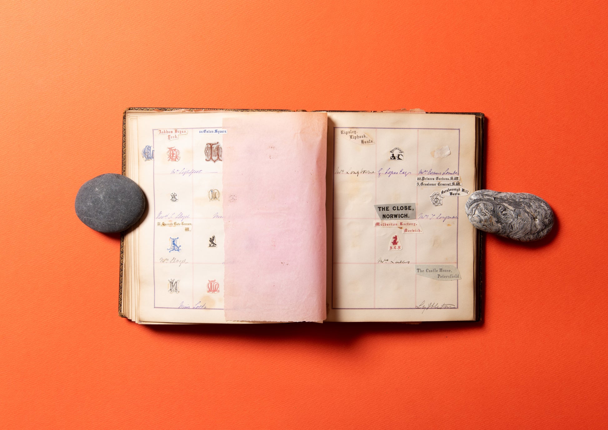 Unique private book with 1,000 monograms and crests based on personal names pasted on it, along with a piece of paper with the address. / 個人名に基づくモノグラムや紋章を住所の紙片とともに貼り込んだ私家本