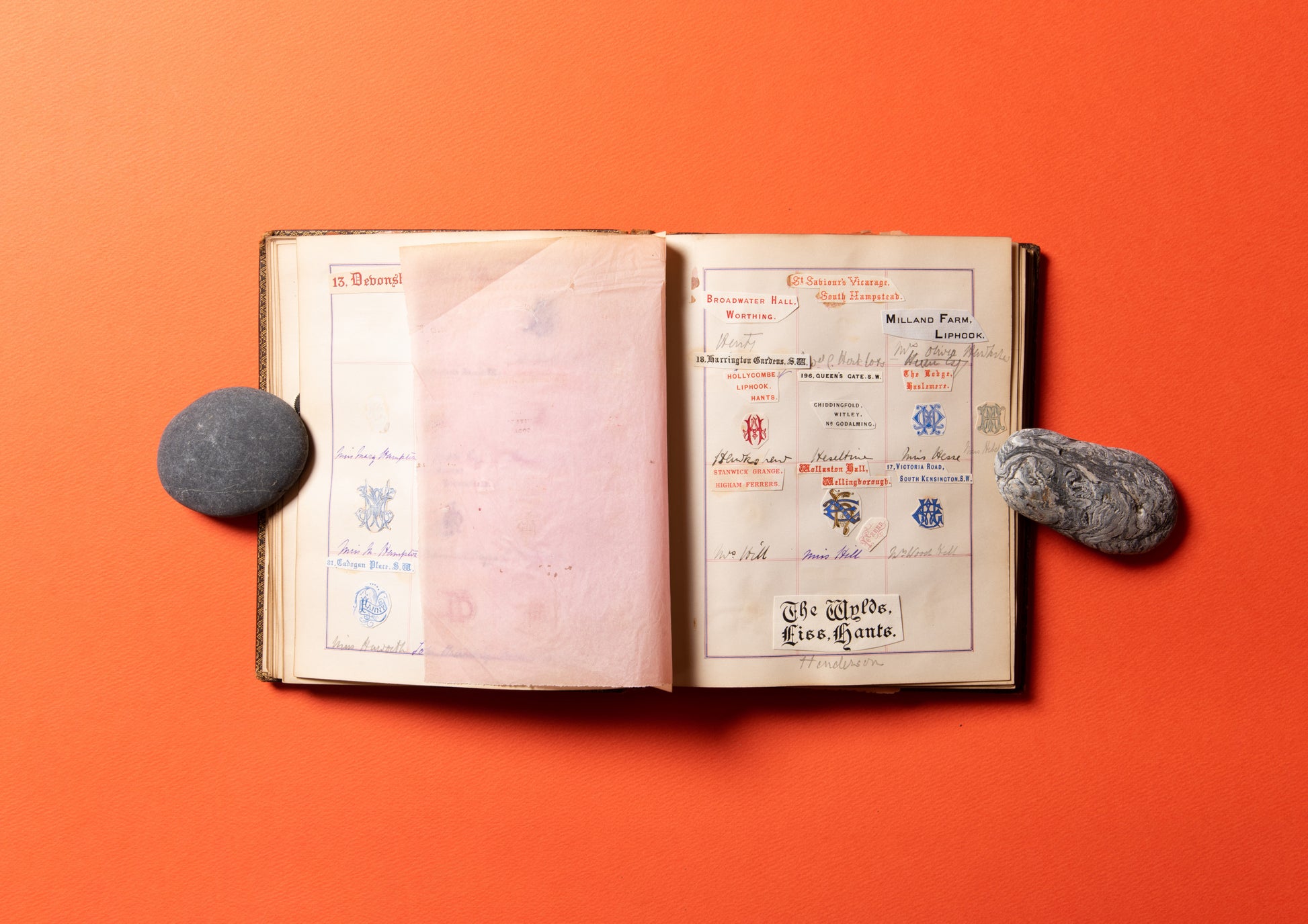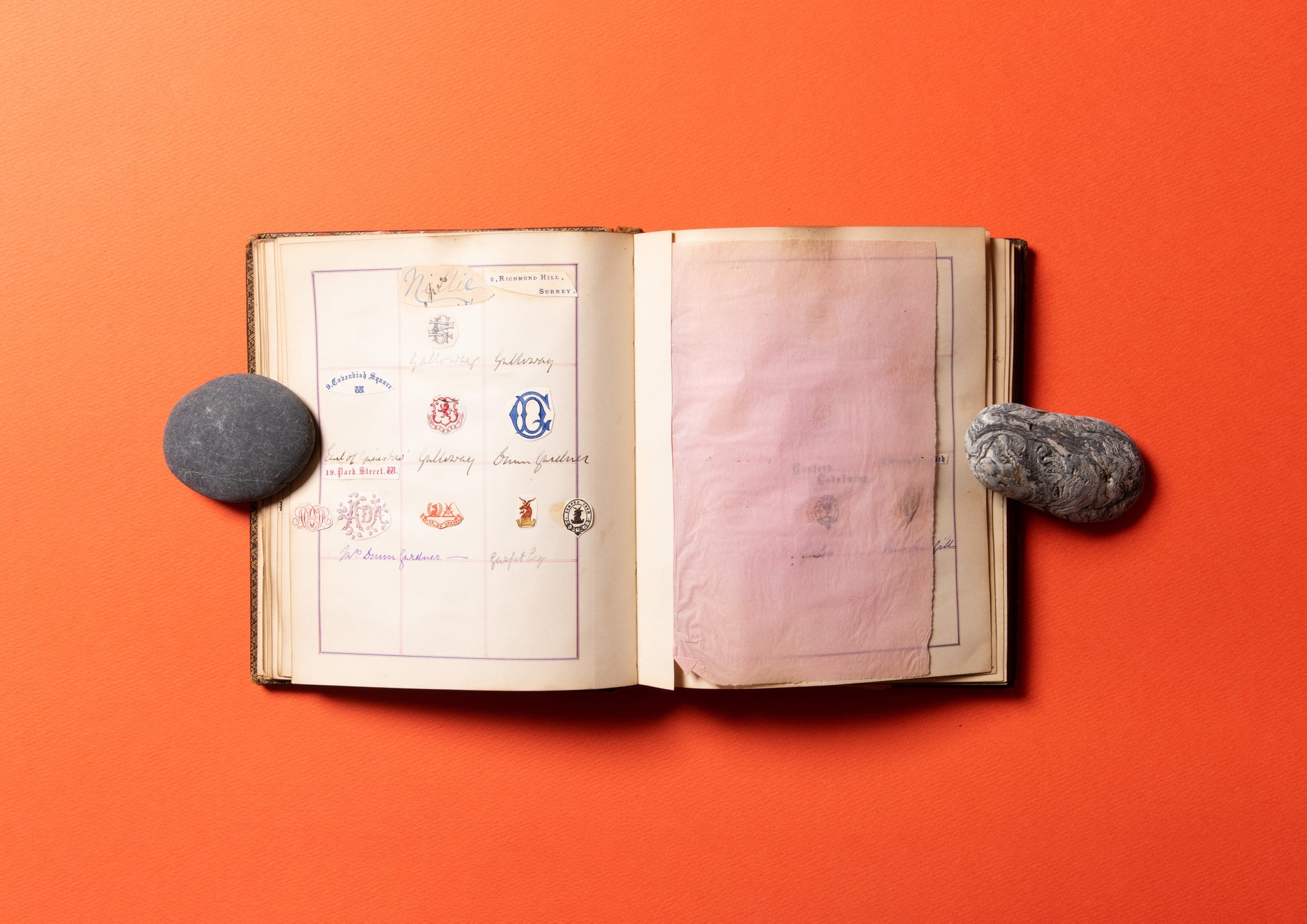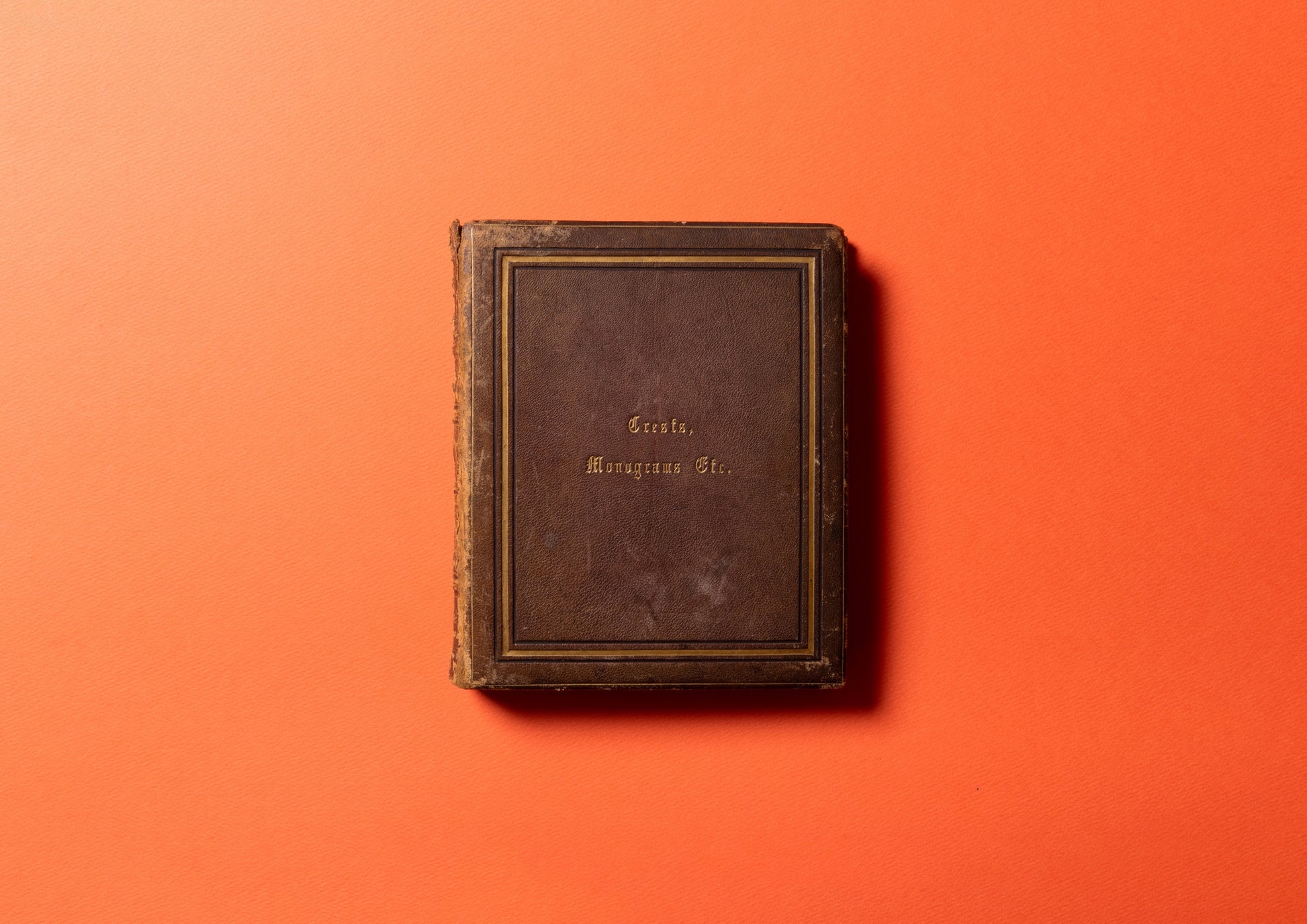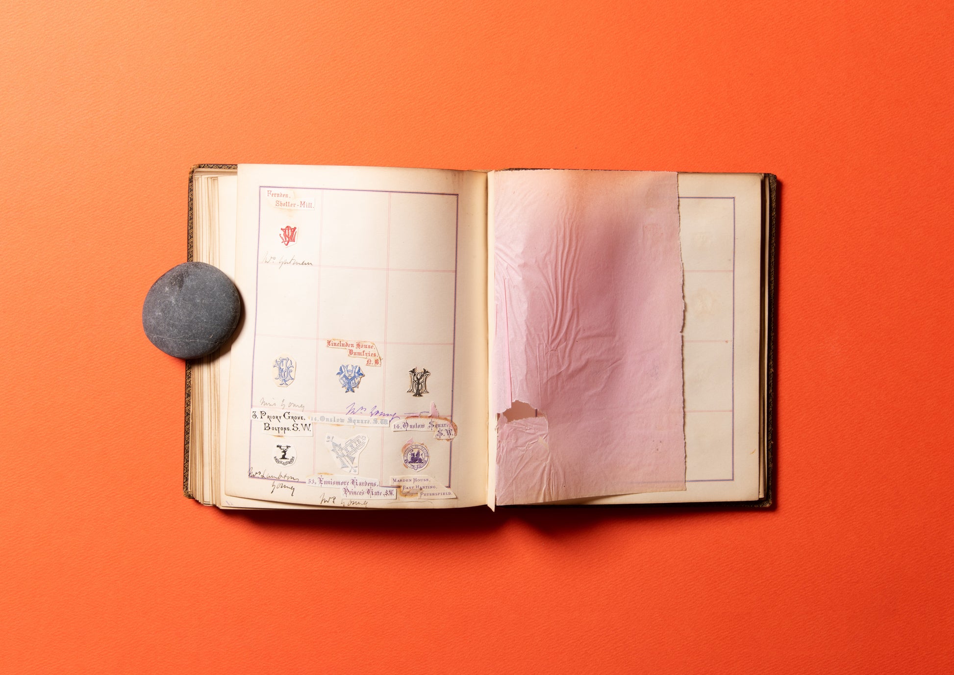Unique private book with 1,000 monograms and crests based on personal names pasted on it, along with a piece of paper with the address. / 個人名に基づくモノグラムや紋章を住所の紙片とともに貼り込んだ私家本