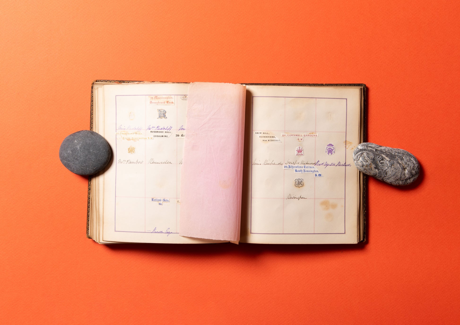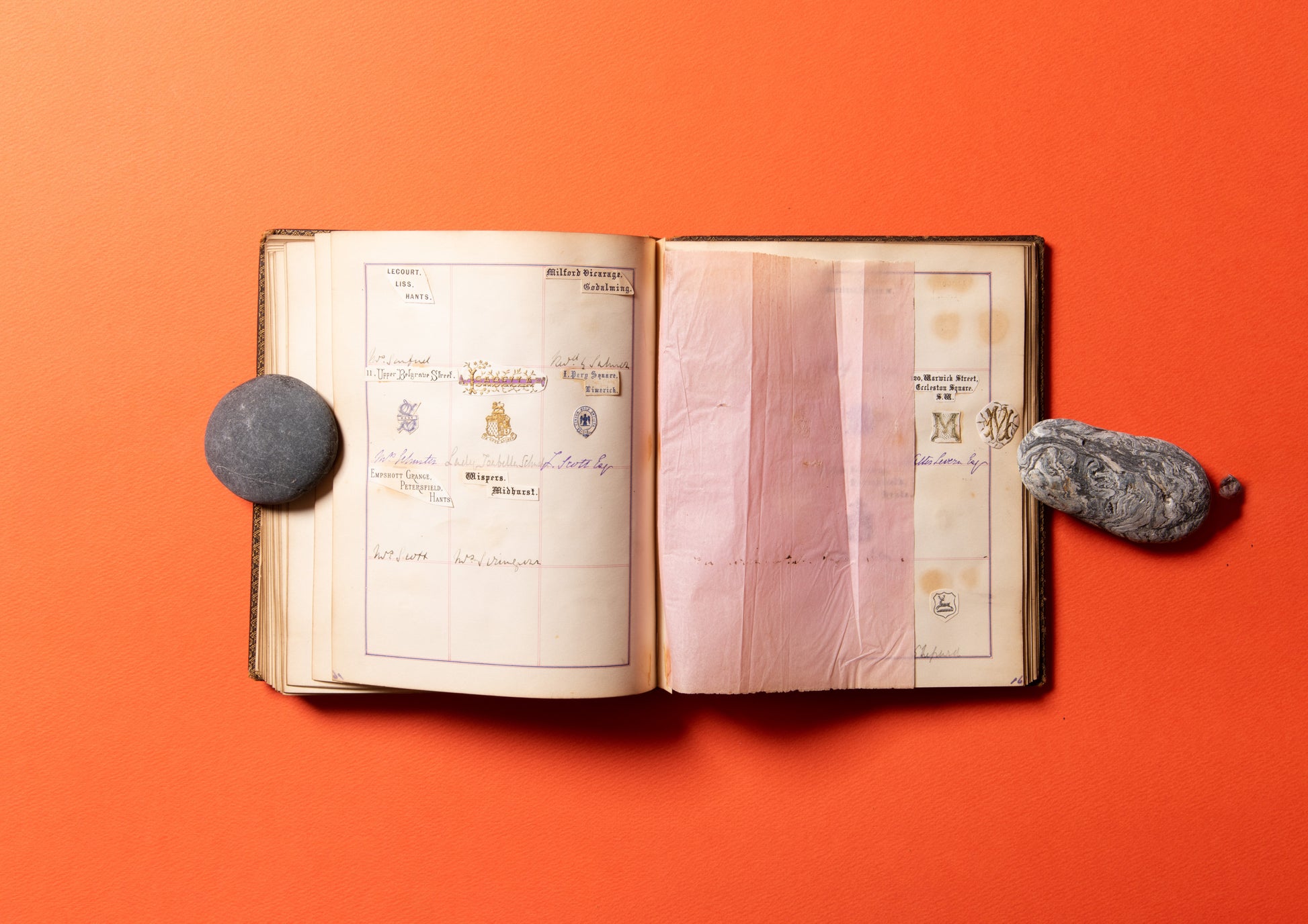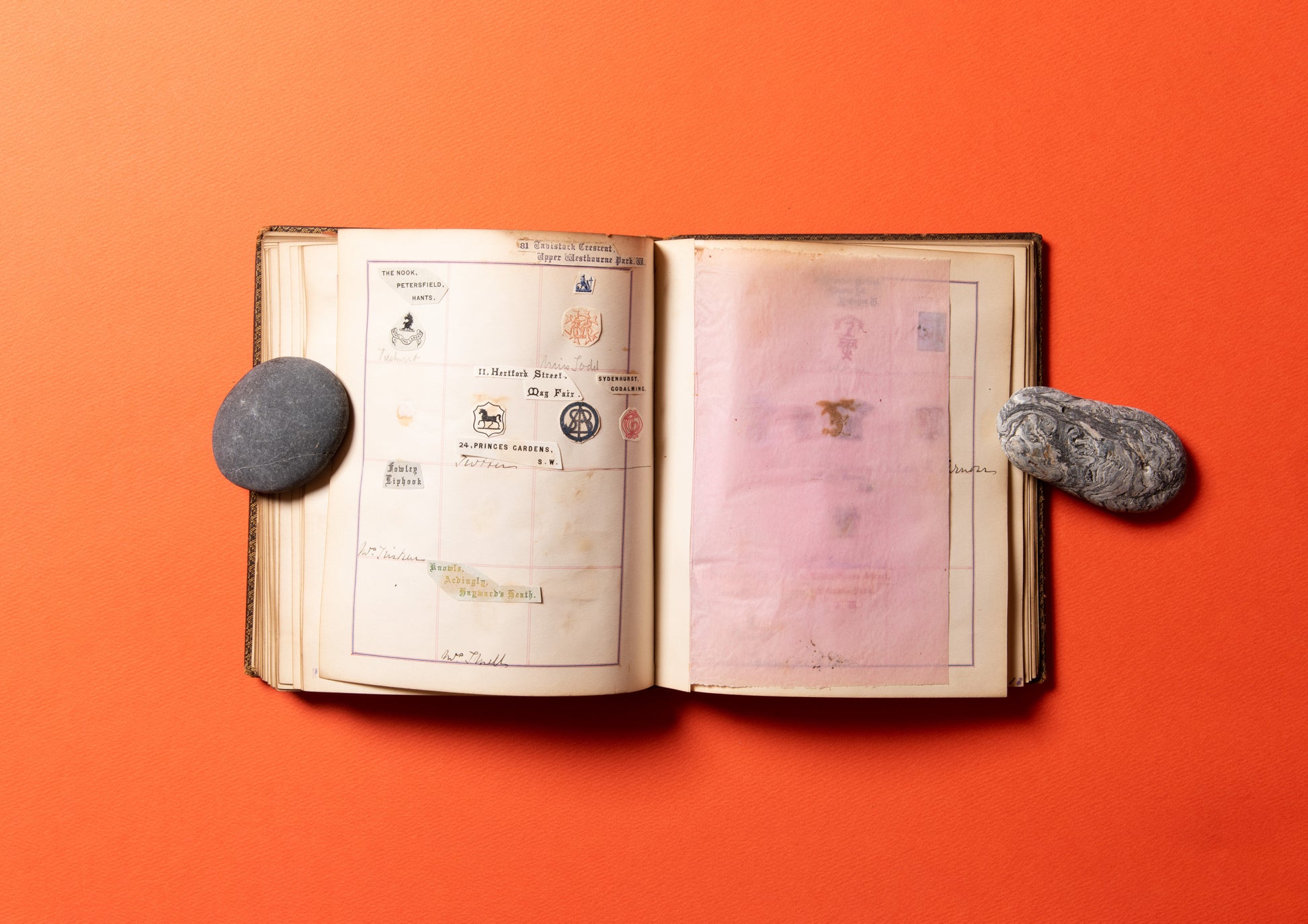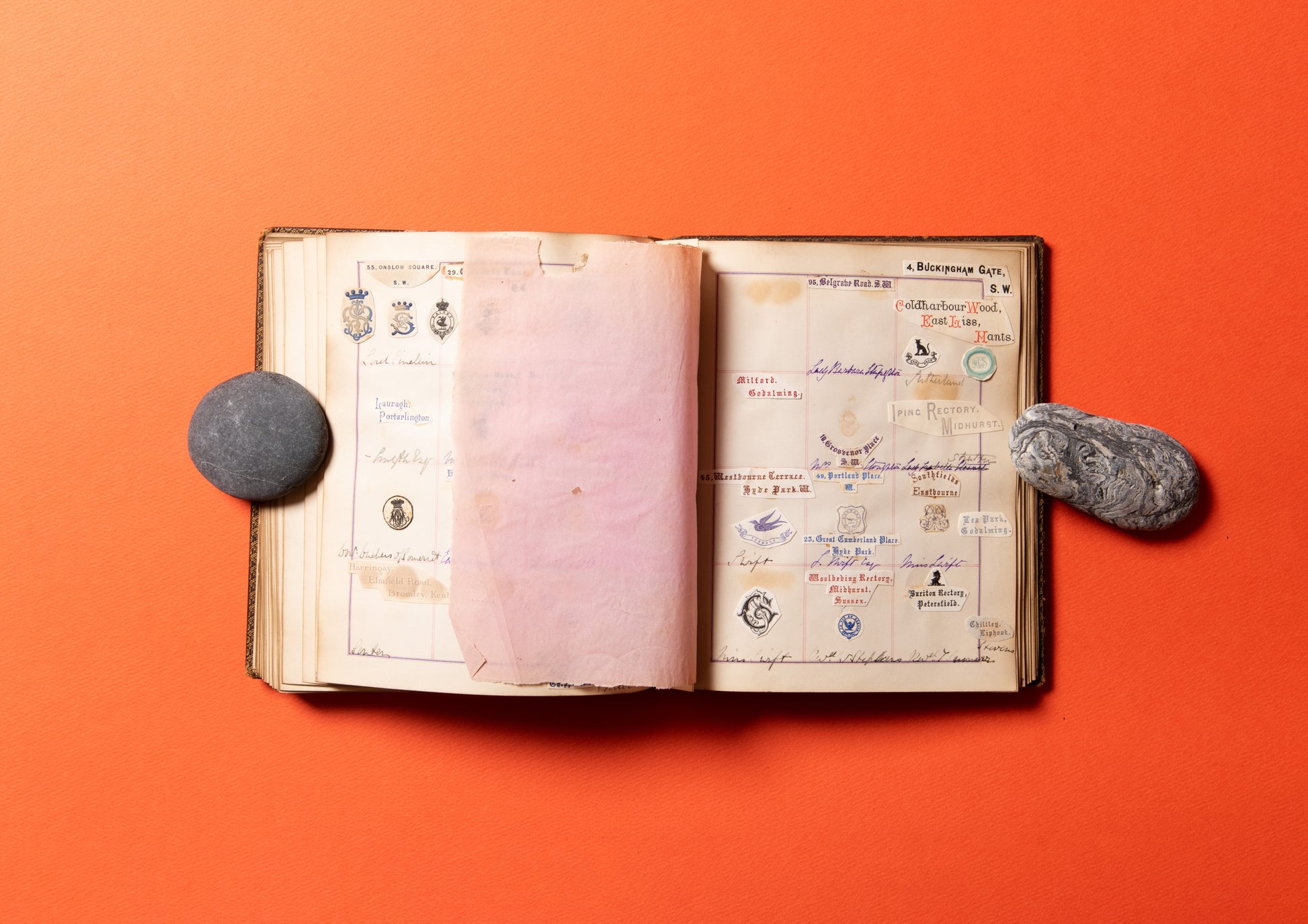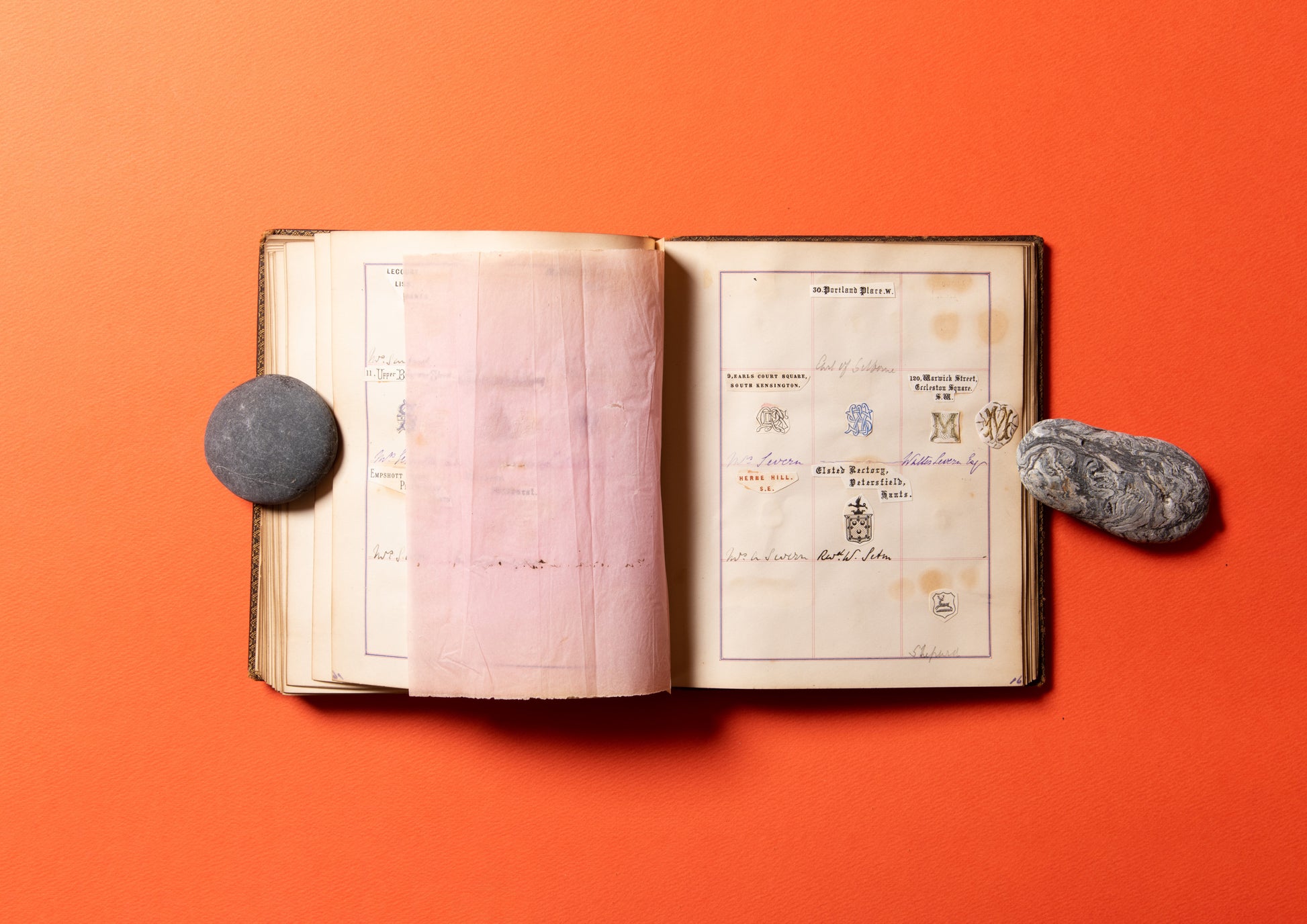 Unique private book with 1,000 monograms and crests based on personal names pasted on it, along with a piece of paper with the address. / 個人名に基づくモノグラムや紋章を住所の紙片とともに貼り込んだ私家本